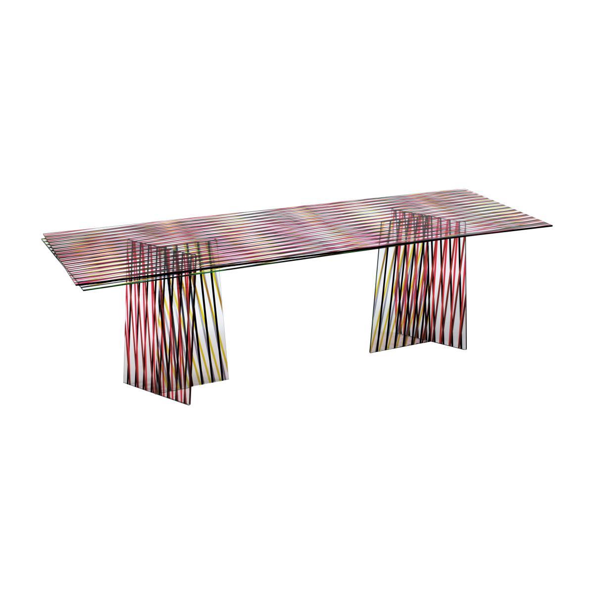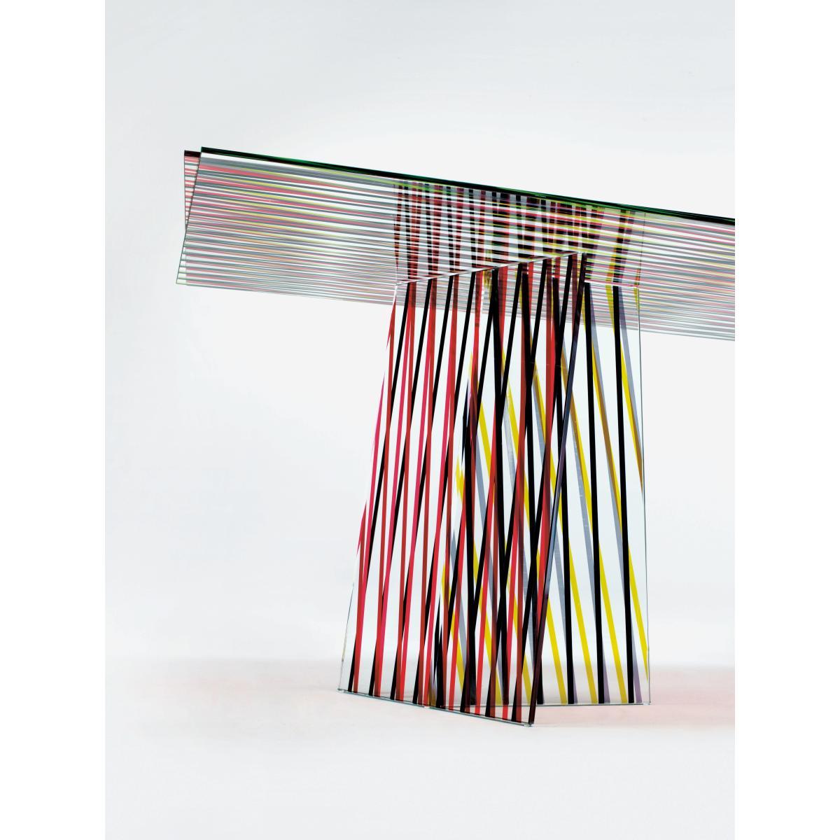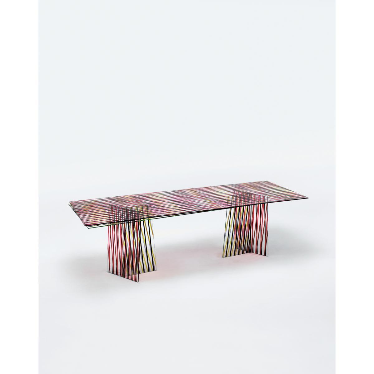 High table in laminated 8 + 8 mm. Thick tempered transparent extralight glass, which thanks to special three-dimensional polychromatic decoration presents a magical pattern of weaving and overlapping lines and colours. The perception of this decoration changes continuously depending on the vantage point. By means of a particular laminating process, the crystal glass is assembled and overlapped irregularly, reinforcing the dynamics of the graphic effect. The bases, with an irregular shape, are in mm. 12 thick transparent extralight glass which is tempered, glued and decorated like the top. The top and base blend perfectly creating a work of great strength and personality. Available in two versions of decoration.