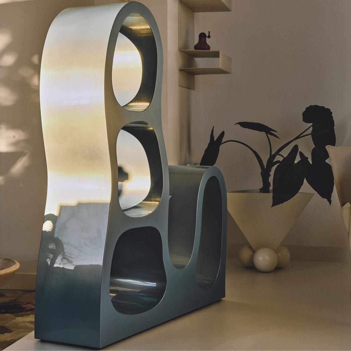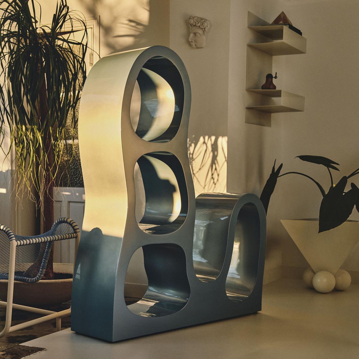 Avant-garde contemporary design... Created by young French designer Thomas Defour, the Crotto shelf was presented in 2022 in Brussels during Collectible, the international fair dedicated to contemporary collectible design of the 21st century. Open to aesthetic, formal experimentation, Thomas Defour attaches great importance to the curve and to design, which he explores with new tools for each new project. Each Crotto shelf is a unique piece, tailor-made by French artisans. The manufacturing process inspired by violin making gives this solid poplar piece of furniture a hollow body with a solid, organic appearance. This open structure with its undulating contours is pierced by multiple circular openings. Striking and surprising, these curved, irregular shapes contrast with the geometric rigour of the architecture. As both a storage and partition unit, this large module can be placed against a wall or in the middle of a room, serving as a separation between two spaces. Like a lattice screen, this openwork, light wall lets you see through it. The way you can organise objects inside the different niches encourages the user to create a form of composition, to play with the arrangement of things... Bold and poetic, the Crotto shelf dresses the space with originality for a spectacular presentation. Thomas Defour: “This era is very inspiring for our generation. It’s a period during which manufacturers followed the radical ideas of young designers. This resulted in more desirable objects, not just functional ones. It’s this way of producing unusual but rational forms that drives me. '' Halfway between sculpture and craftsmanship, Thomas Defour's technique has developed in a fusion of two methods, visual and applied, based around solar influences. French designer 13. Desserts approaches design from a radical perspective, seeking balance between artistic freedom, mass production and "collectability". Giving pride of place to experimentation, this emerging design label explores new production avenues combining industrial processes and artisanal know-how. Uninhibited by the codes and trends that govern the market, the young guard of French design expresses itself freely, offering a selection of radically unique pieces.