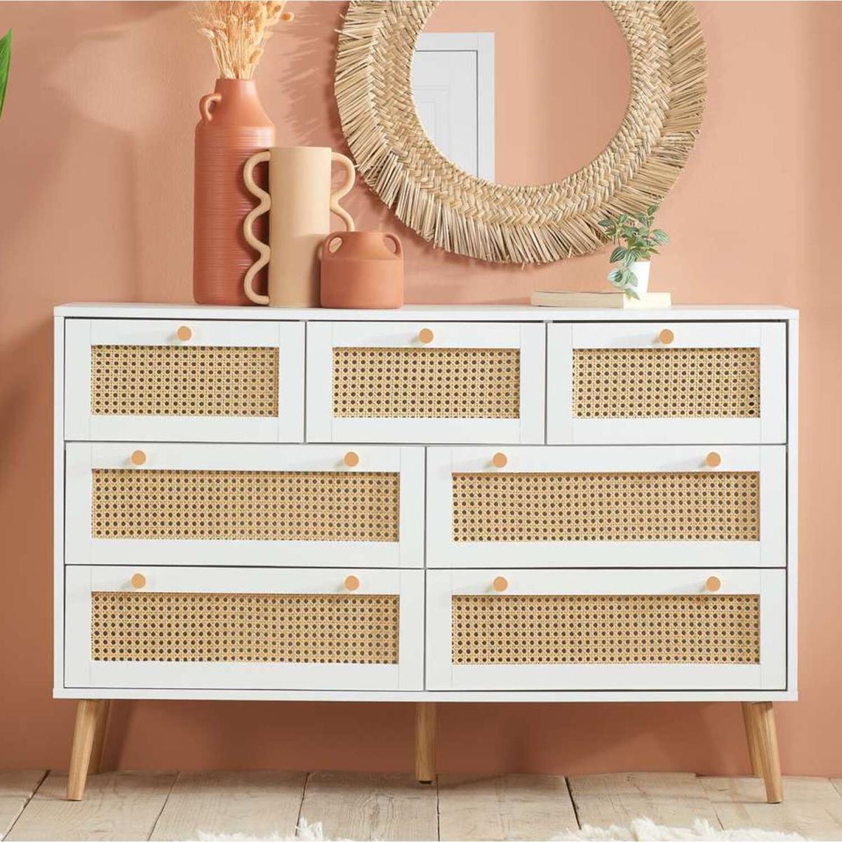 I love this piece for its versatile blend of style and practicality. The black finish offers a modern, sophisticated touch that works well in contemporary or eclectic interiors, especially when paired with natural textures or muted palettes. Its rattan detailing adds a subtle tropical or boho vibe, making it a great statement piece in bedrooms, living spaces, or even a stylish hallway. For styling, consider keeping the top surface minimal-perhaps with a statement vase or a candle diffuser-while using the drawers for essential organisation. It’s a smart combination of functionality and design, perfect for those wanting to introduce texture and colour contrast into their space.
