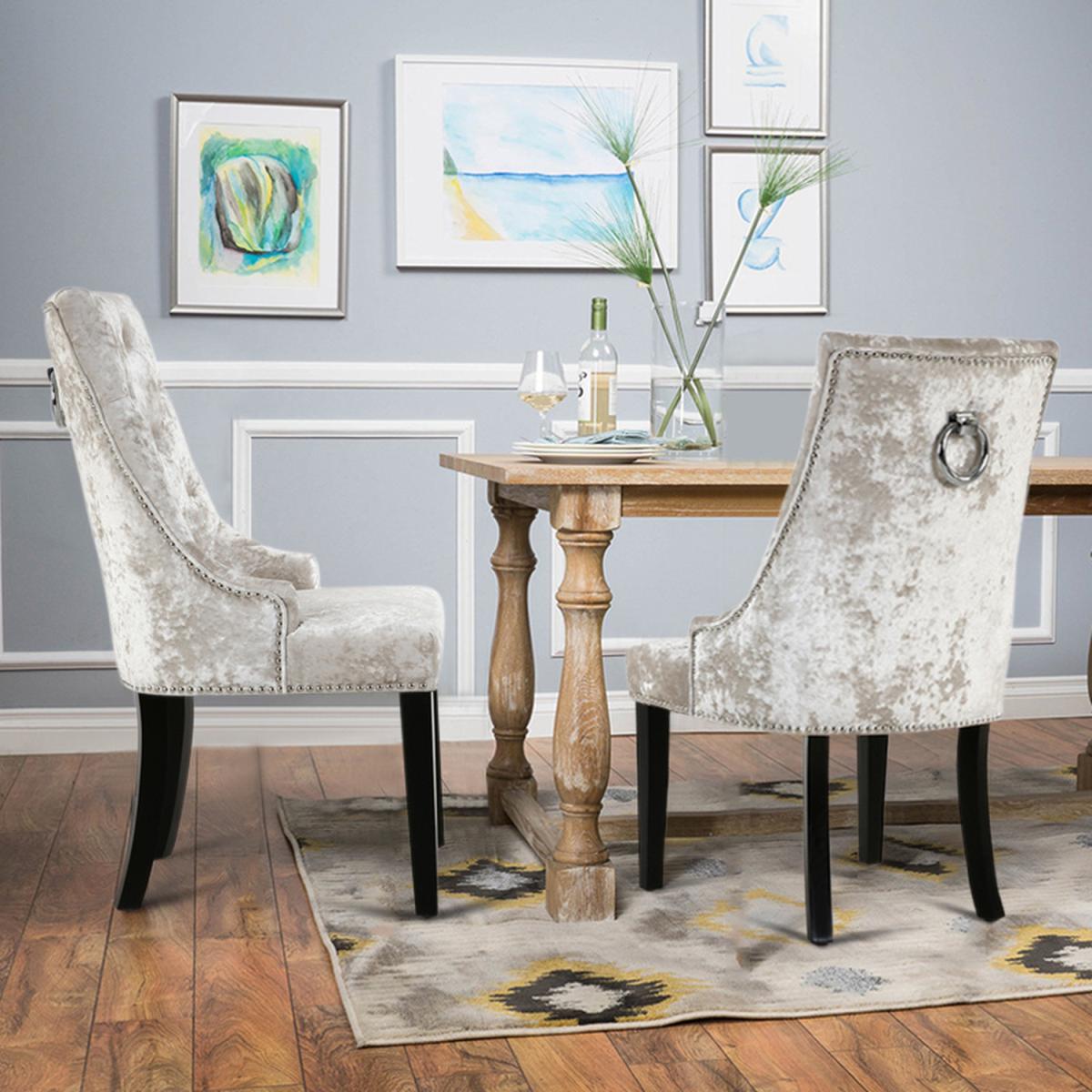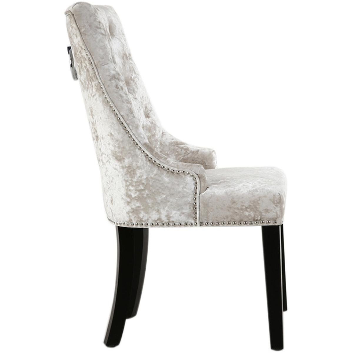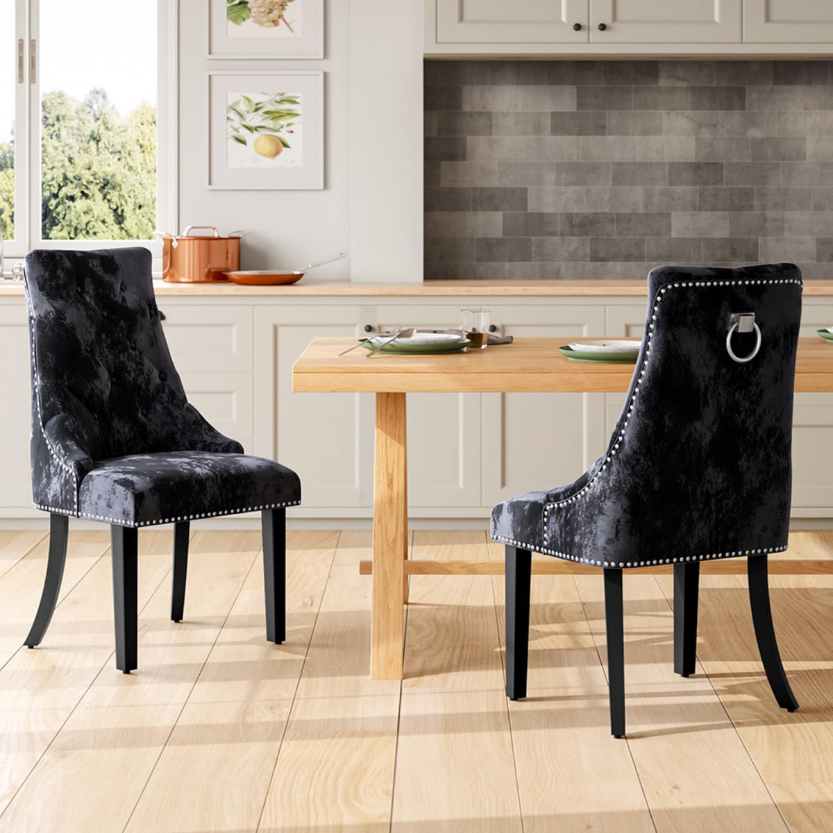 Offering an irresistible combination of design and value, this set of chairs feature a high wingback with button detailing, metal nail and Lion knocker on its backside for decoration. Bringing a twist of modern gothic, this luxuriously upholstered and studded chair will have you sitting in style for hours. This was integral that this classical design trickled into a comfortable, modern aesthetic.