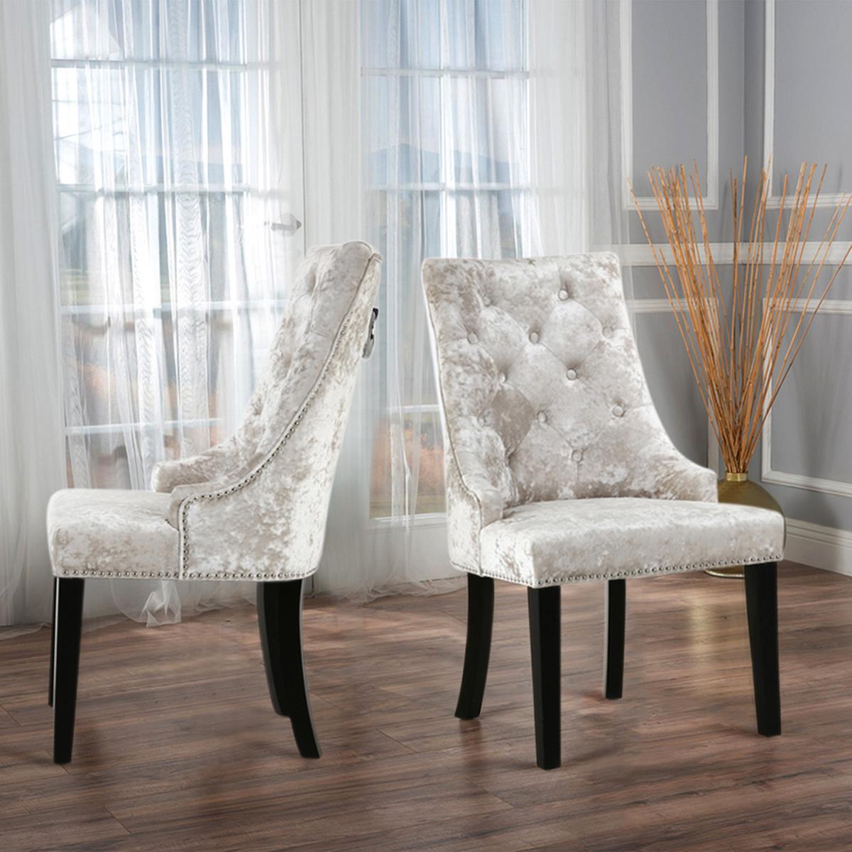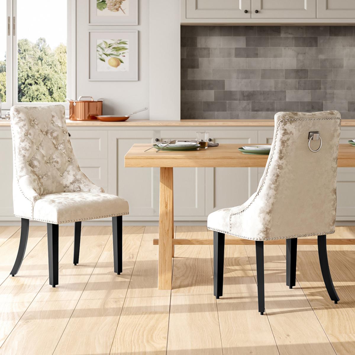 I love this set of two crush velvet dining chairs for their versatile elegance and plush texture. The white hue makes them a great choice for both modern and classic interiors, adding a touch of sophistication without overwhelming the space. They work particularly well in neutral or monochromatic colour schemes, but can also serve as a statement piece in more vibrant settings. Practical styling tips include pairing them with a glass or wooden table to highlight their luxe fabric, and balancing the look with soft textures like throws or cushions. These chairs are equally suitable for dining rooms aiming for a chic vibe or kitchens designed with a more refined aesthetic.