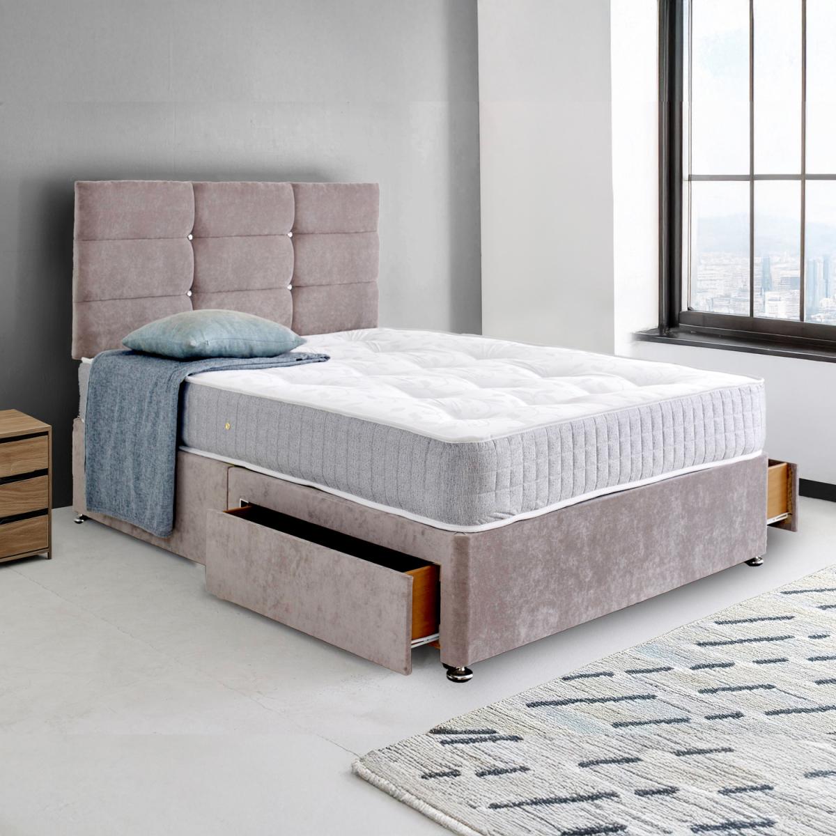 This elegant Divan Bed has been made in the Uk, carefully crafted with precision and care, showcasing the finest British craftmanship, ensuring long lasting quality. Designed with a stylish 24inch headboard with a cube and buttoned design giving it an elegant look and stylish finish, adding a touch of class to any bedroom. This Divan Bed shows sophistication and elegance, customise your style and express your unique taste with this luxury Divan Bed Headboard. Elevate your bedroom and experience the perfect blend of elegance, style and quality and transform your space into a haven of comfort and sophistication.