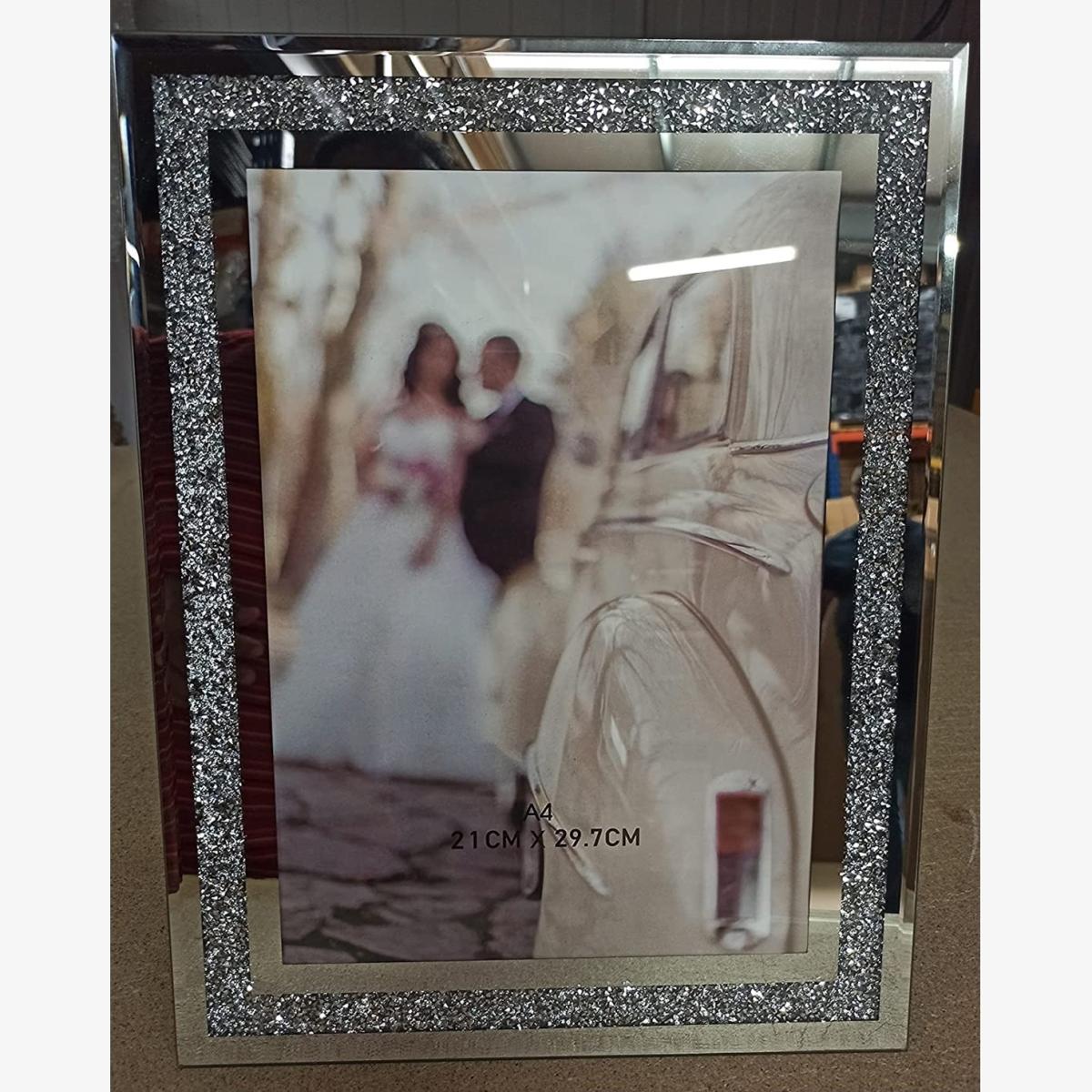 Crushed Crystal Photo Frame Ready to hang both ways vertically or horizontally Picture Eye catching glass photo frame comes with the unique sparkle diamond four sizes jewel mirror very beautiful must have mirror Wall photo frame silver bevelled edge shine under light Ideal sizes velvet at the back ideal for home office living room bedroom eye catching design, will be the best in your living room bedroom bathroom home decor.