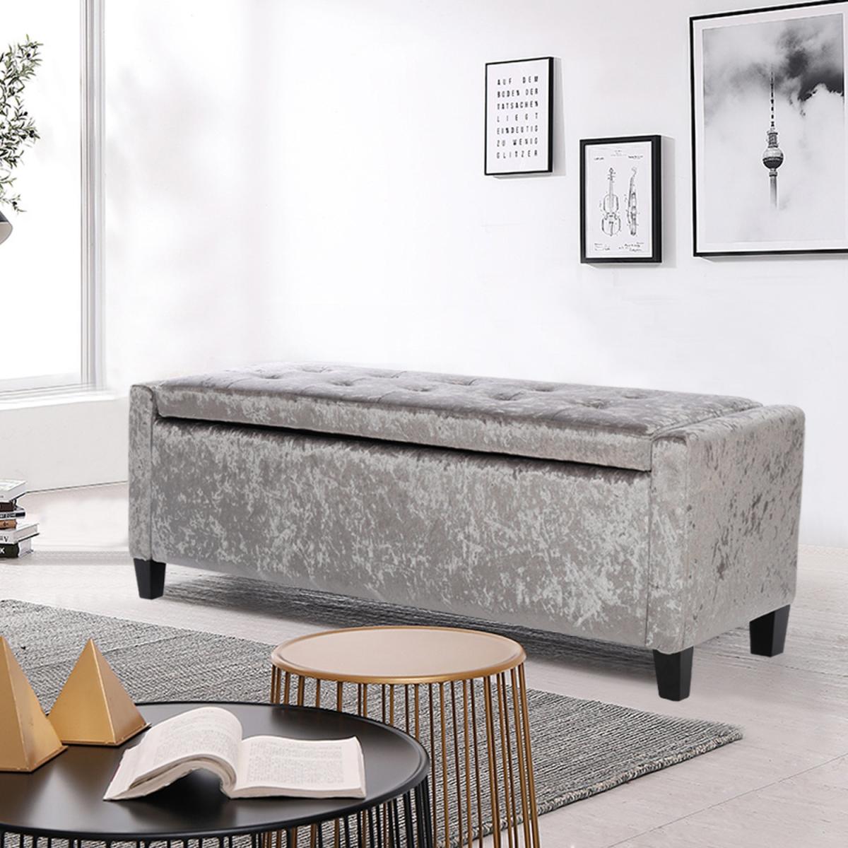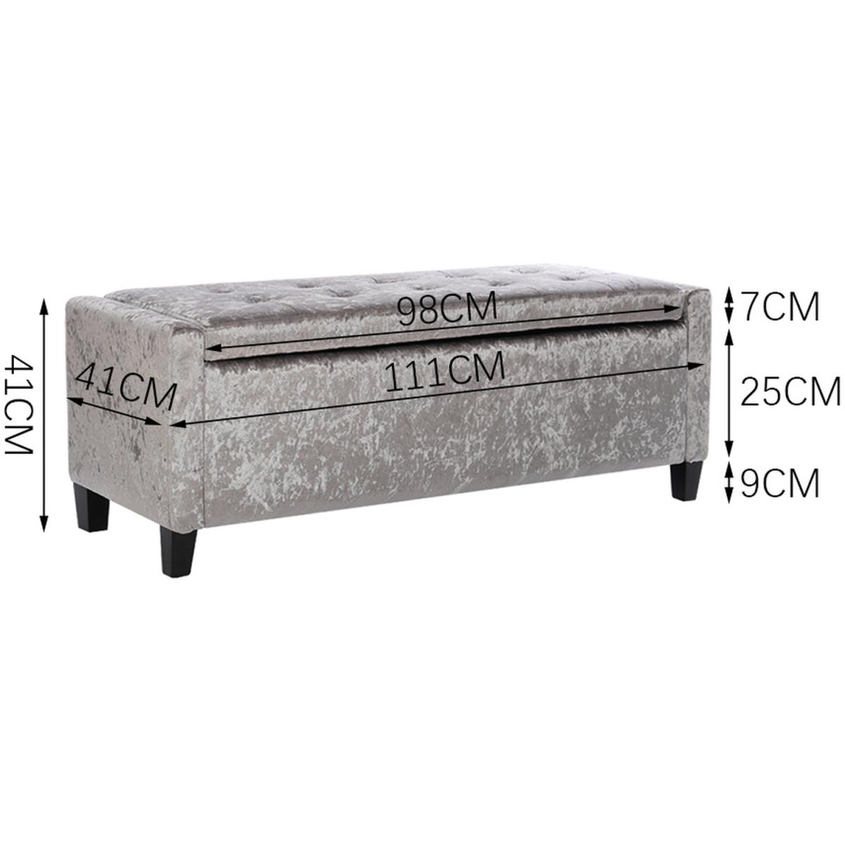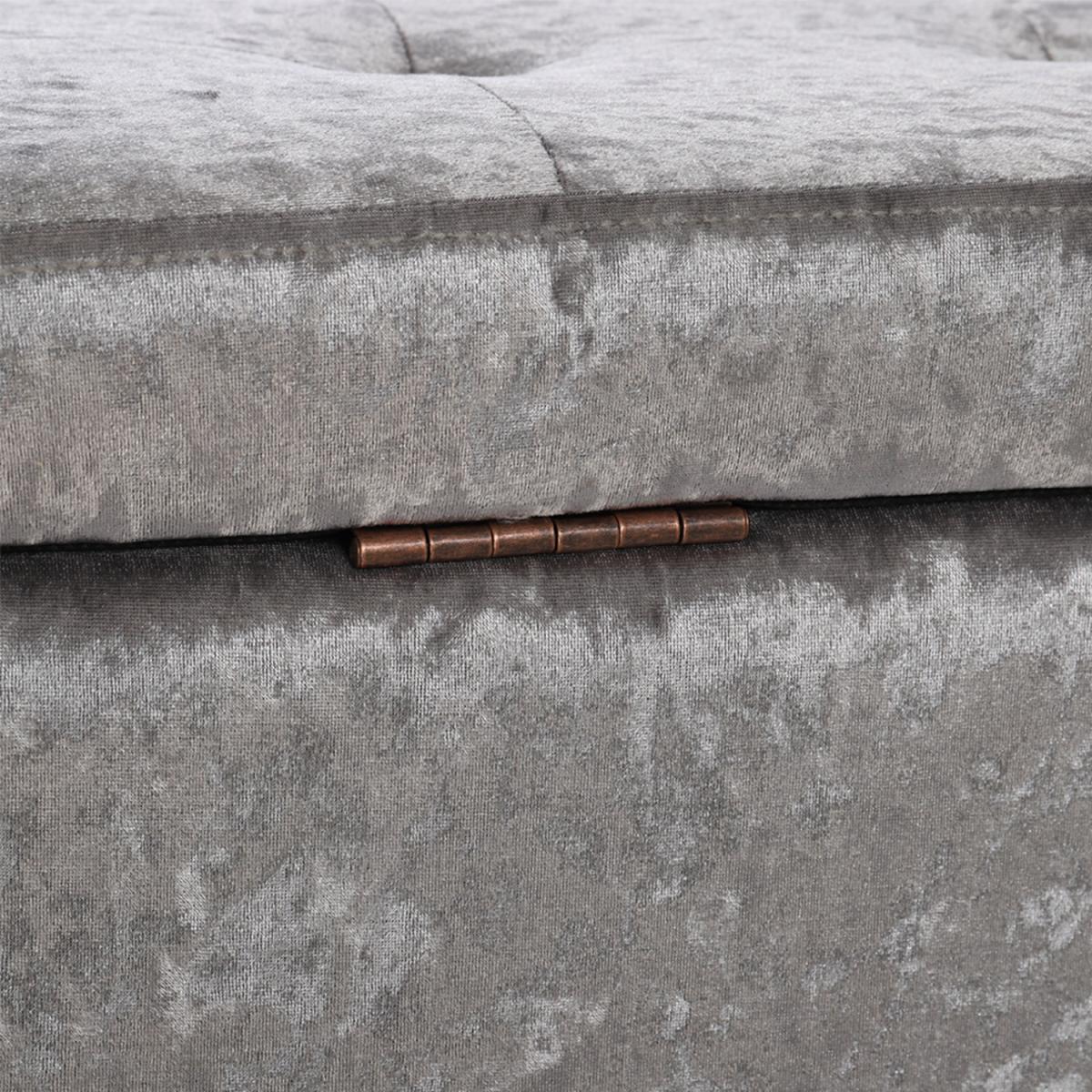 The bench ottoman is upholstered in velvet, features traditional buttoning detailing to the back rest and seat with a tall stance. You can use it to store anything discreetly, from towels and bedding to clothes and accessories. Hinges keep the lid in place once opened, making it easy for you to access and store your items, provides room to keep the area discreetly clean and tidy. Four rubberwood feet to provide extra stability, delicately carved wooden legs give the storage box a luxurious and sophisticated touch. This stool is long enough to comfortably sit 3 people. Flat packing, easy assembly required. Ideal for entryway, living room, family room, basement or bedroom.