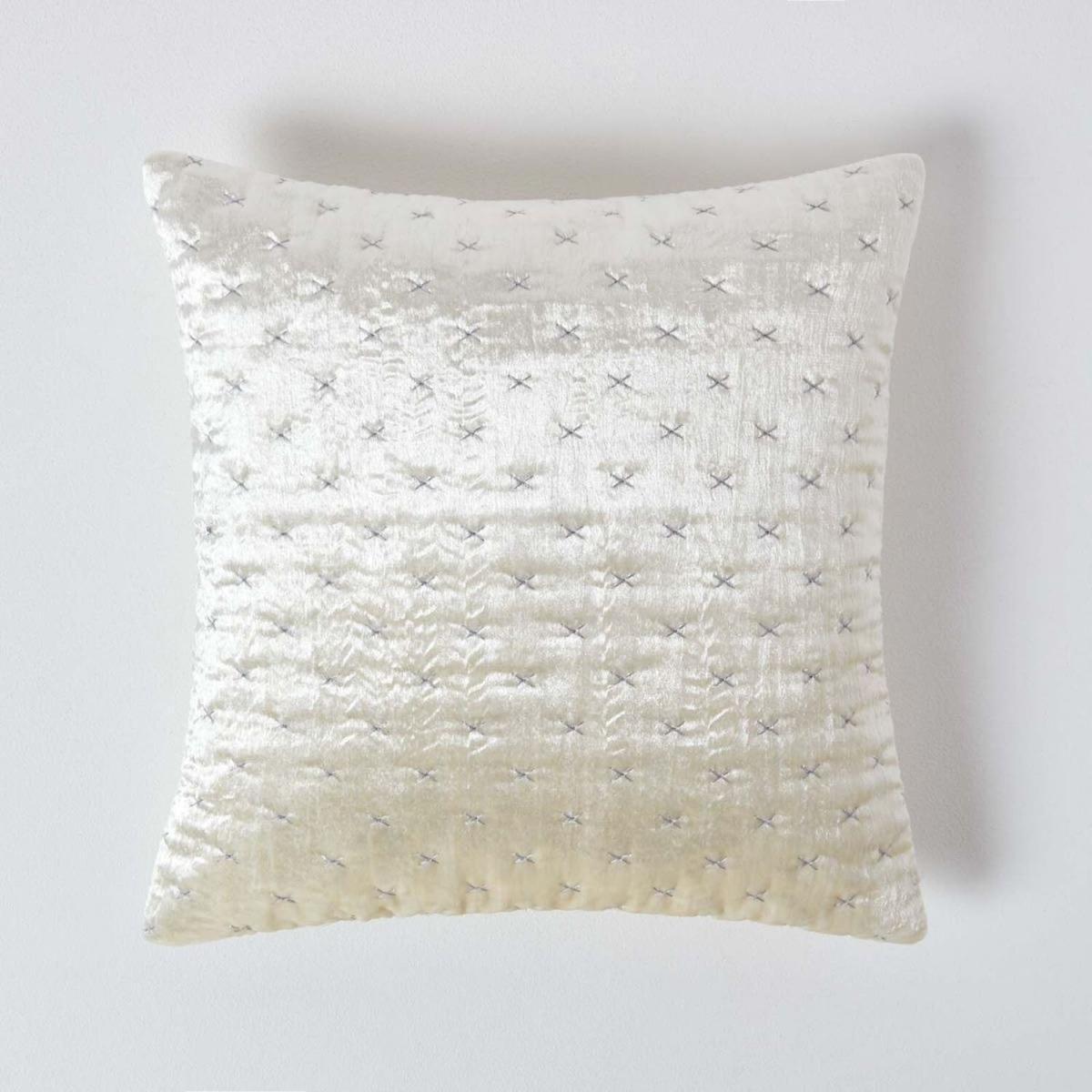 On-trend crushed velvet cushion cover with hand stitched embroidered crosses for added texture. Add a burst of colour to your living room or bedroom, this vintage style cushion cover is woven from super soft crushed velvet and features a plain reverse, making it easy to style. Choose from three sizes including 30 x 50 cm, 40 x 40 cm or 55 x 55 cm. Perfect for layering up on your sofa and bed, or use alone on an armchair for added comfort. In off-white, this velvet cushion cover will complement every interiors style, and works well when paired with the midnight blue or blush pink colour.p To create a cushion that feels comfortable and supportive, pair with one of Homescapes cushion inserts (sold separately) available in a choice of natural or synthetic fillings. The cover has a zip closure on the reverse side making inserting and removing your cushion pad quick and easy. Machine washable at 30 degrees on a gentle cycle, do not iron. Pack includes one cushion cover only.p
