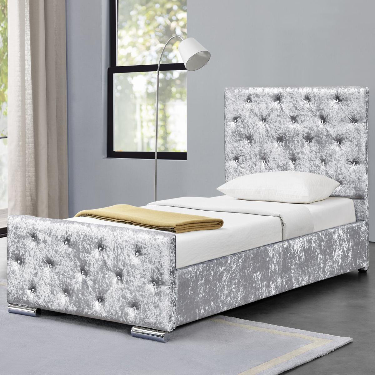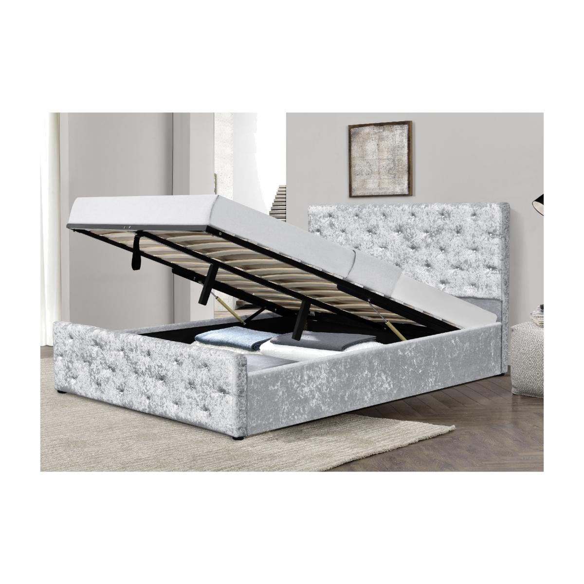 This stylish bed is beautifully upholstered in silver crushed velvet fabric. It features a padded headboard and footboard and is finished with a diamante crystal button detail. It is made from a solid wooden frame and has a sprung slatted base to give support to the mattress and give you a fully supportive and comfortable night's sleep. The ottoman aspect of this bed frame is operated using a gas lift mechanism that lifts up the mattress to reveal ample storage space. Please note this is straight to floor storage area.