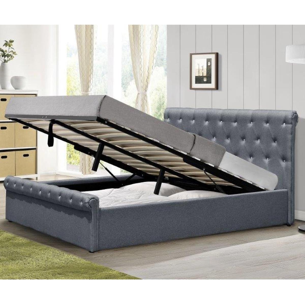 A stunning mixture of traditional & modern. A beautiful sleigh bed featuring a wonderful scroll head and footboard, in the style of the traditional chesterfield with tufted detail, with a modern twist of sparkling diamantes. The sleigh style frame is upholstered in sumptuous crushed velvet. It is made from a solid wooden frame and has a sprung slatted base to give support to the mattress and give you a fully supportive and comfortable night's sleep. The ottoman aspect of this bed frame is operated using a gas lift mechanism that lifts up the mattress to reveal ample storage space.