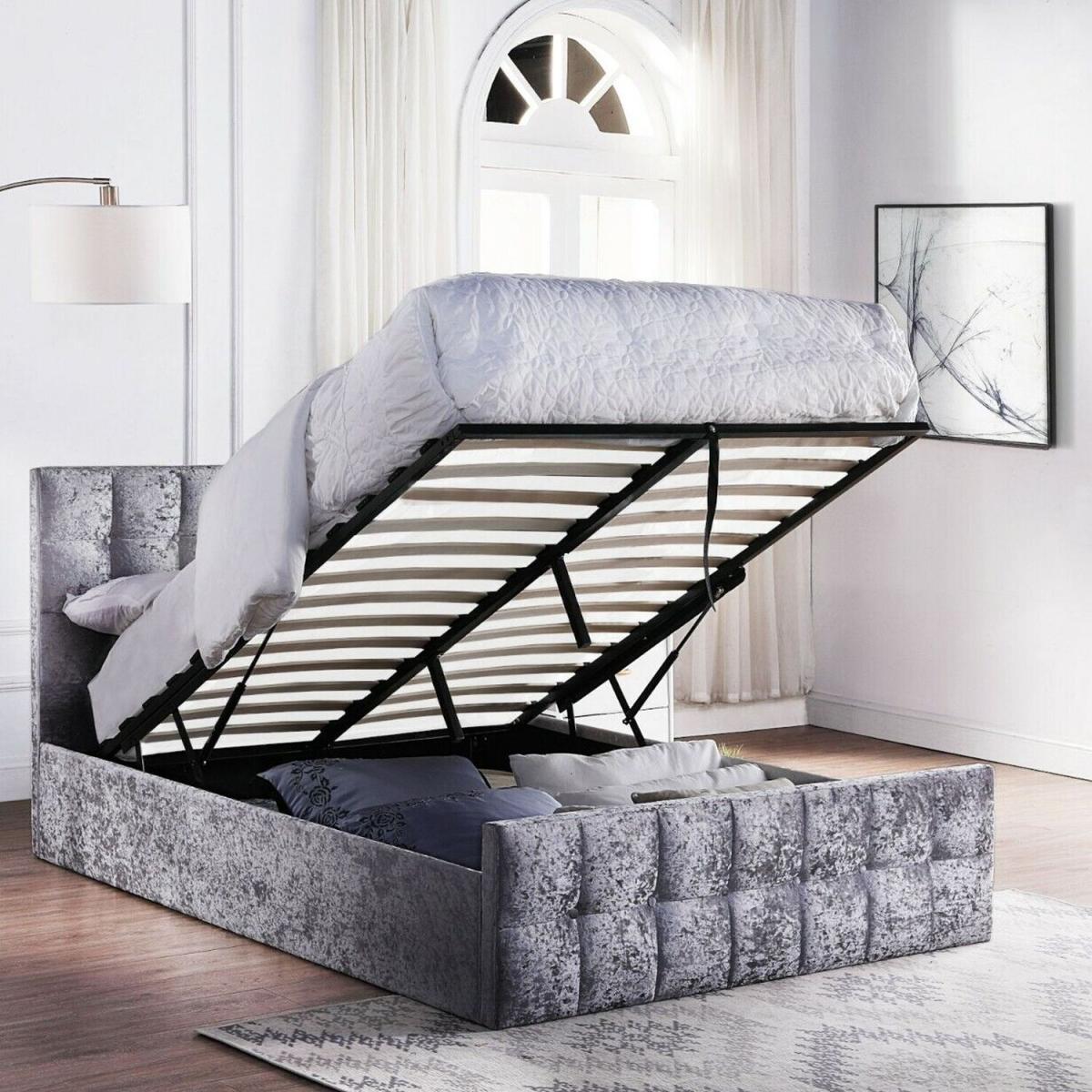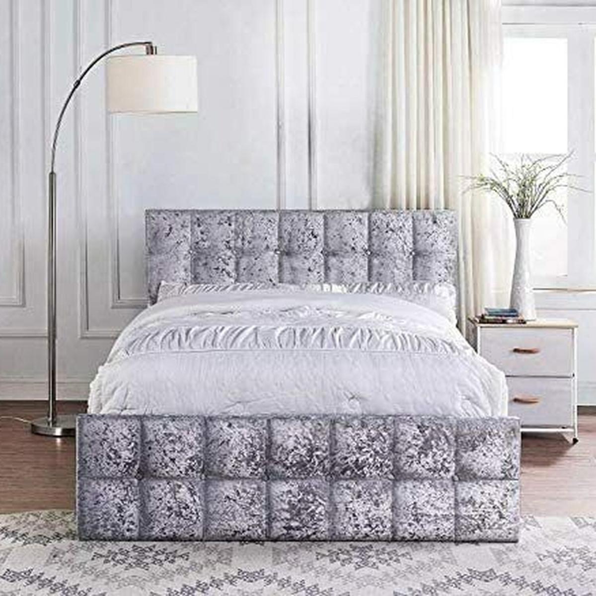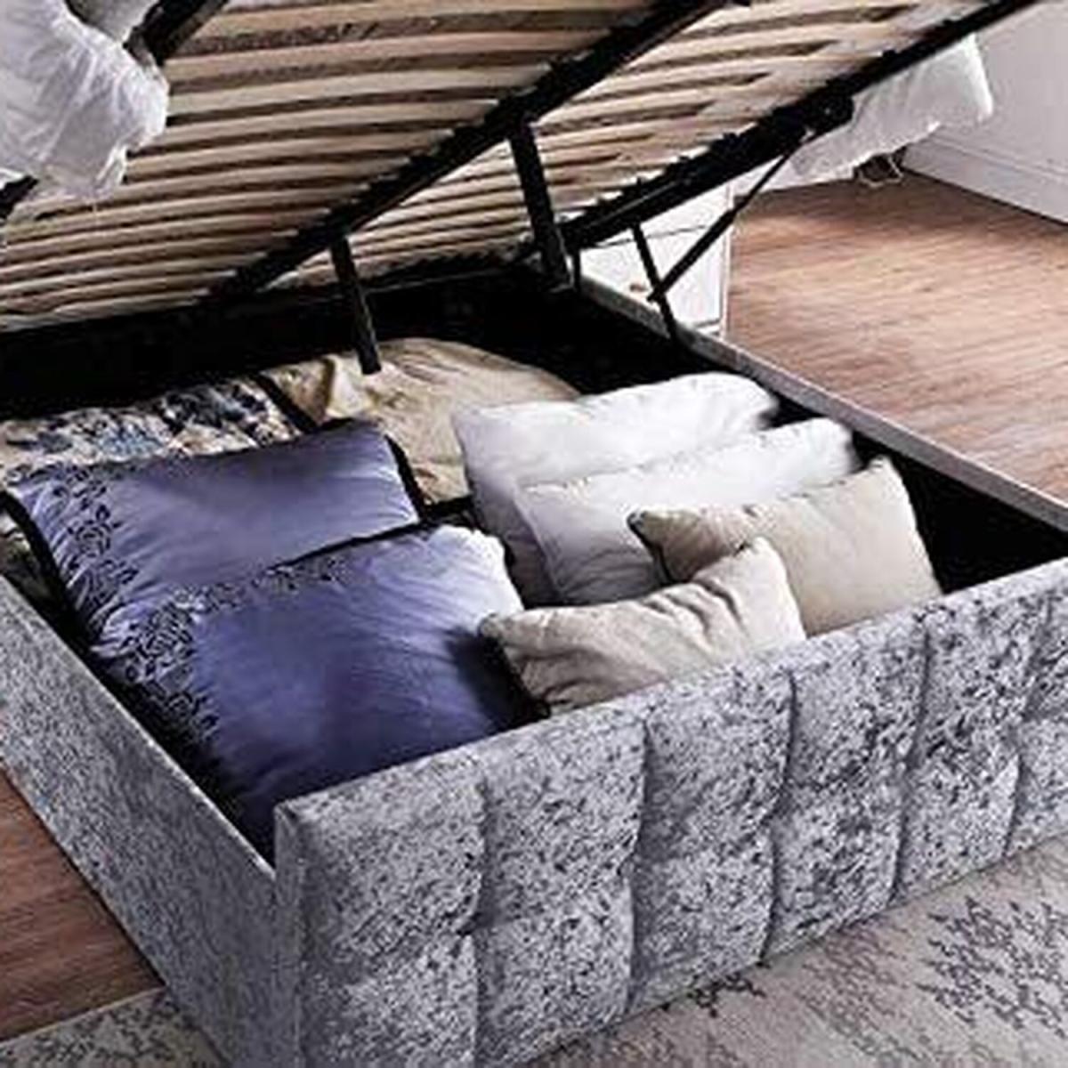 Upholstered in a deluxe soft touch 2-tone crushed velvet fabric, this double ottoman bed crushed velvet will be a standout piece in your bedroom. Create extra space in your bedroom with a huge capacity under-bed storage compartment. Fabric base included to keep your items dust-free. Padded headboard, base & sides with strong sprung wooden slats for support and strength. Extra plush headboard and footboard square design. Featuring an easy-access hydraulic dual lifting mechanism, this storage bed is made from the highest quality materials including the strong centre support beams and upholstered frame. Under bed storage space 30cm high up to 900. L of storage space underneath the bed frame. Purchase with or without mattress. Mattress option a thick 16cm luxury pocket sprung mattress with independent pocket springs to adapt to weight. Breathable cool touch hypoallergenic cover, anti-dust and anti-mite. High-density 400gsm foam top sleeping layer medium-firm rating.