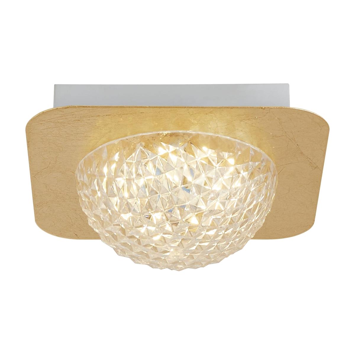 A unique and modern flush light, a rounded square metal base finished in stunning painted gold. The central clear acrylic half sphere has a pretty, cut crystal design that casts the light out from the integrated LED in a warm white patterned glow. Ideal for halls, living rooms and porches with low ceilings, it can also be Controlled with a dimmer switch. LED's use up to 75% less energy and last up to 20 times longer than incandescent bulbs.