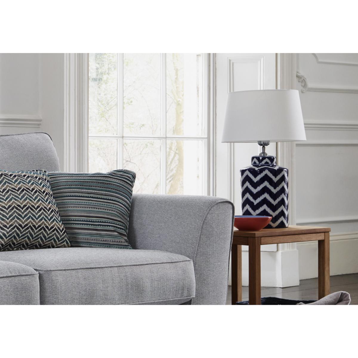 With its bold blue-and-white colour palette, the Cruz table lamp base strikes a cheerful and jaunty note. Made of ceramic, this lamp base is smoothly rounded and features a geometric chevron pattern. Solid and substantial in both design and construction, it’s the perfect lamp for a relaxed living room or family room. Please note that the shade for the Cruz table lamp base is sold separately. Dimensions. Width: Base 24cm (9in) Shade 33cm (13in). Height: Base 39cm (15in) Shade 20cm (8in).