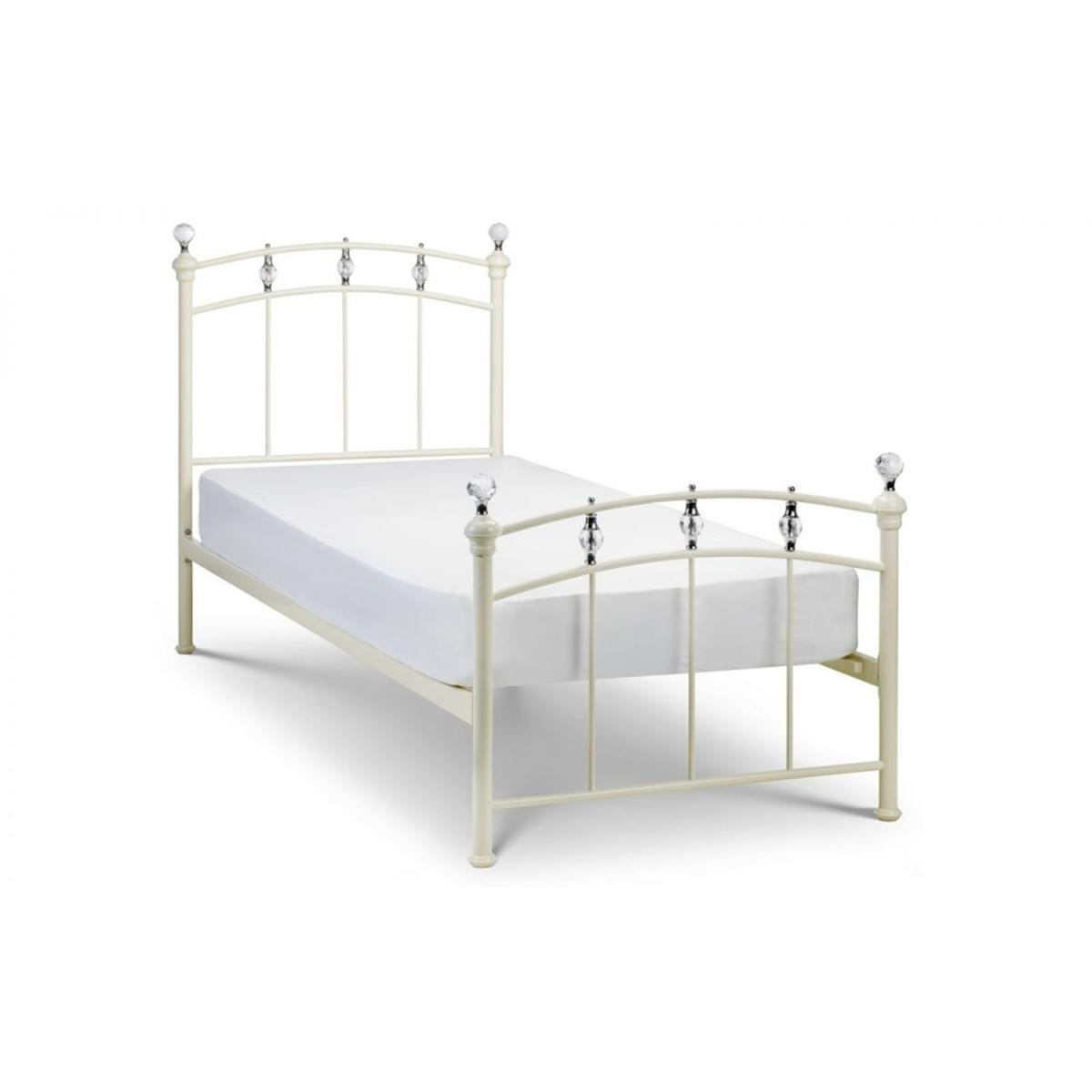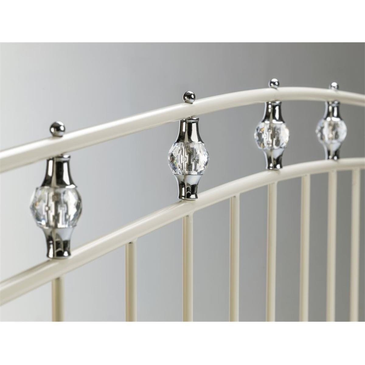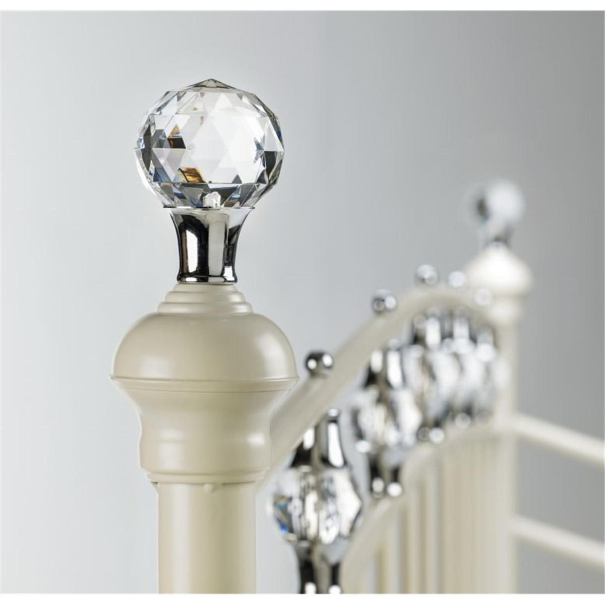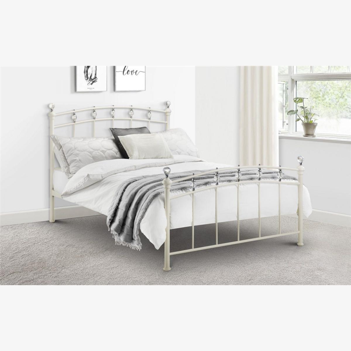 The bed frame is a classical Victorian-style stone white finished metal frame, which has a contemporary twist of Crystal Finials on the posts. It has beech-sprung slats that offer increased comfort, mattress support and ventilation. The frame is designed for a 150cm x 200cm mattress, please note bed frames do not include mattresses. This bed comes flat-packed for easy assembly.