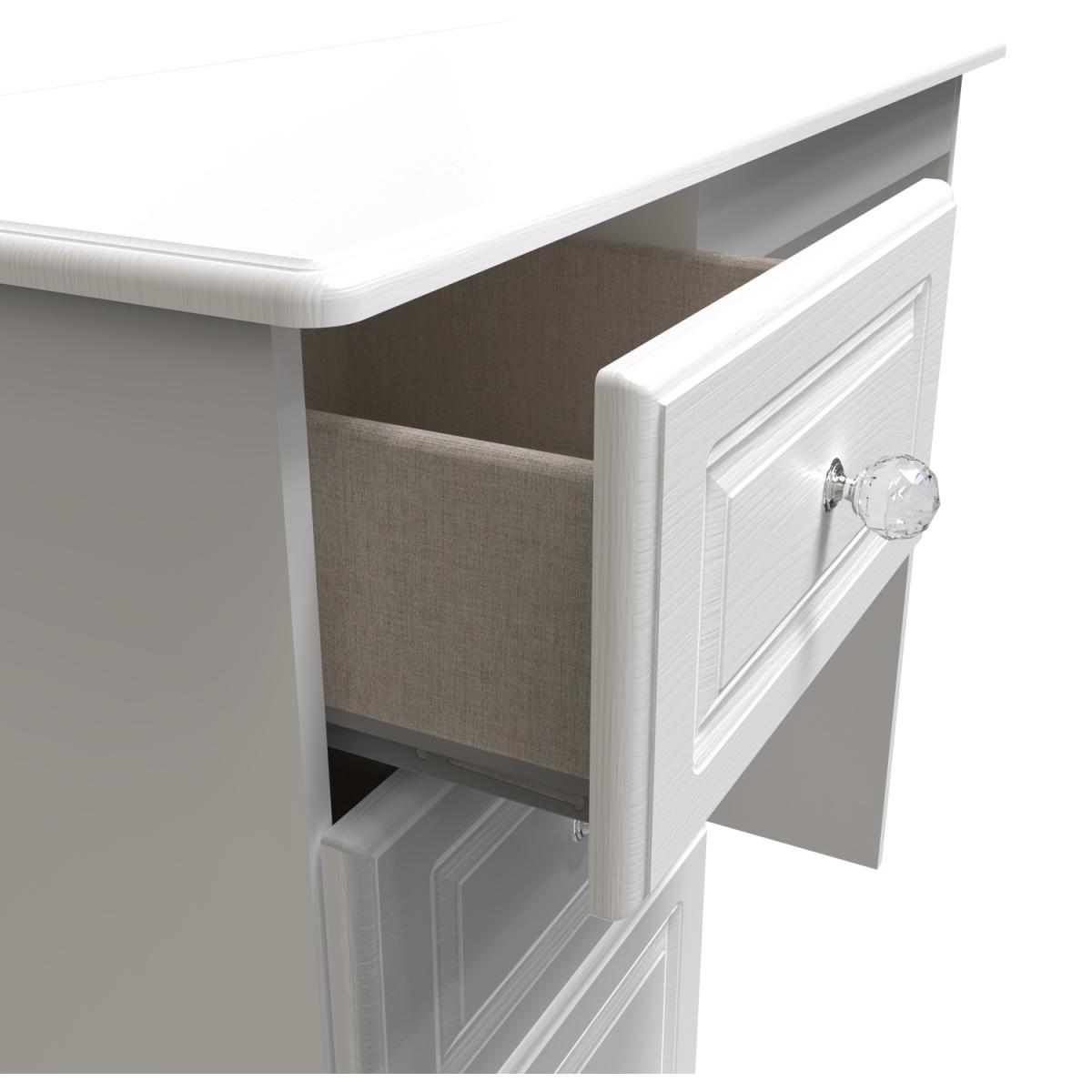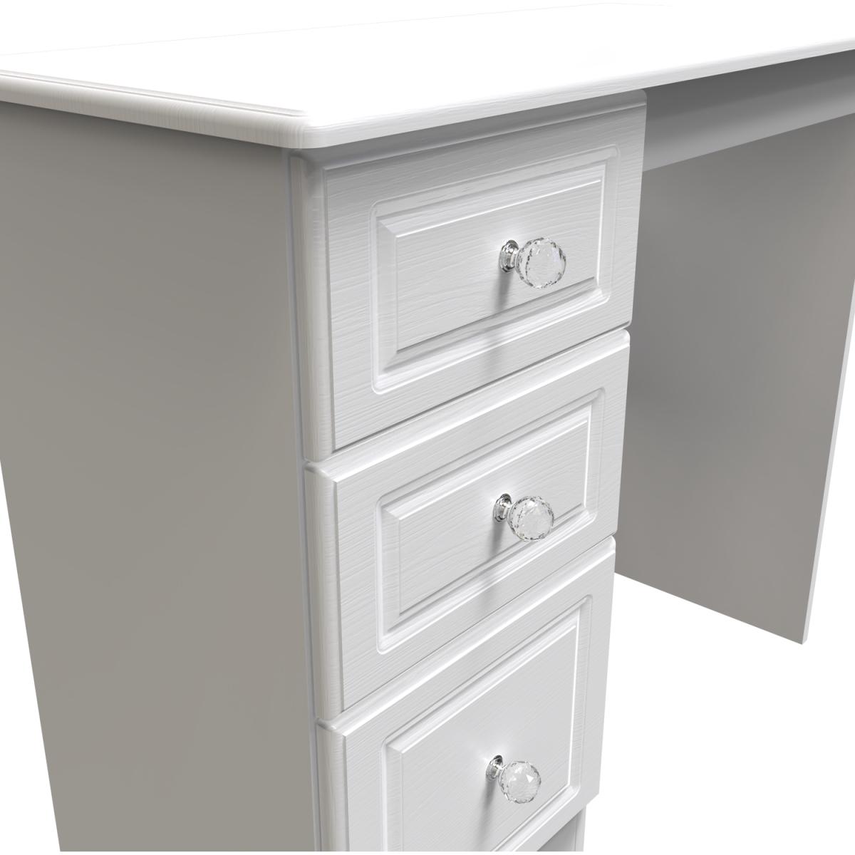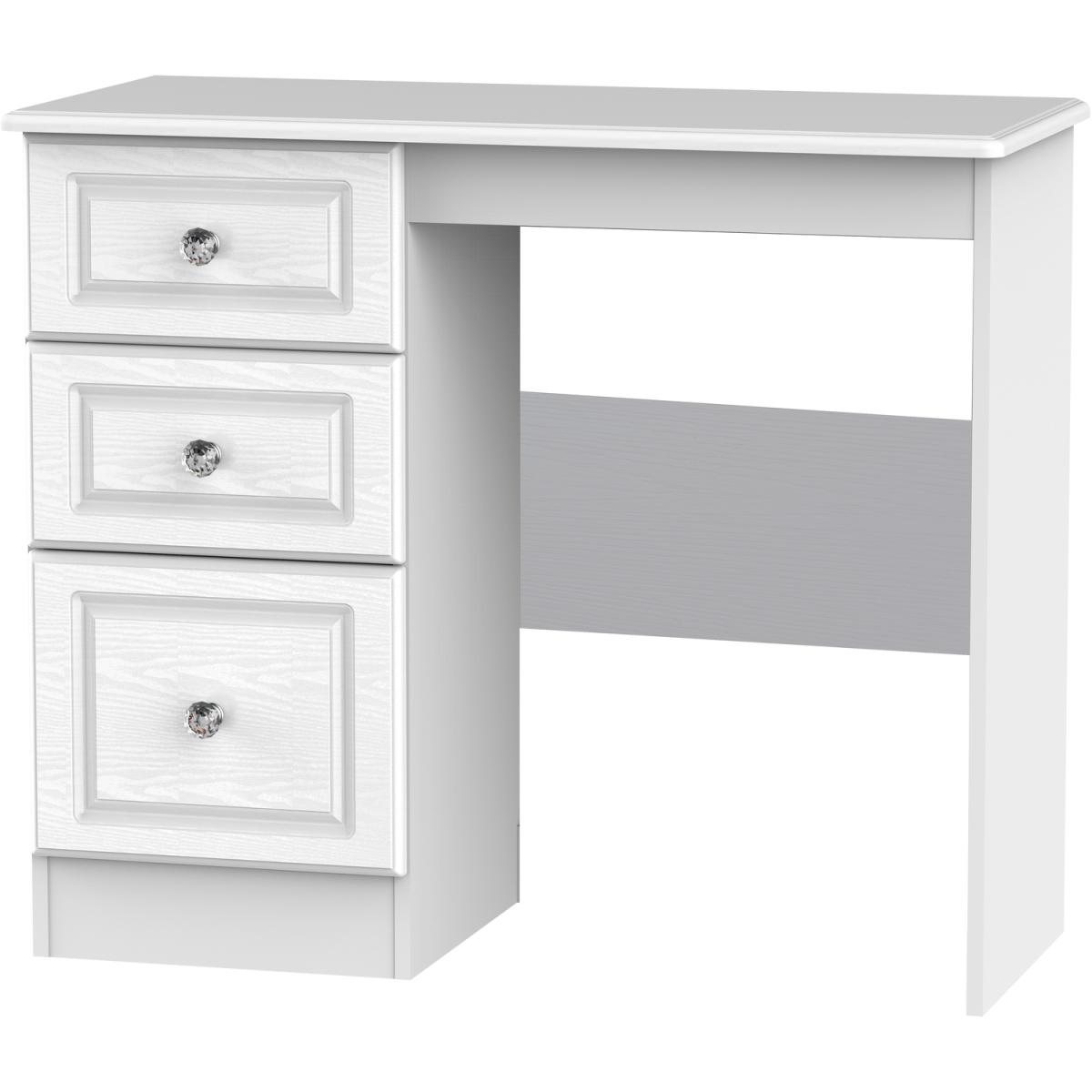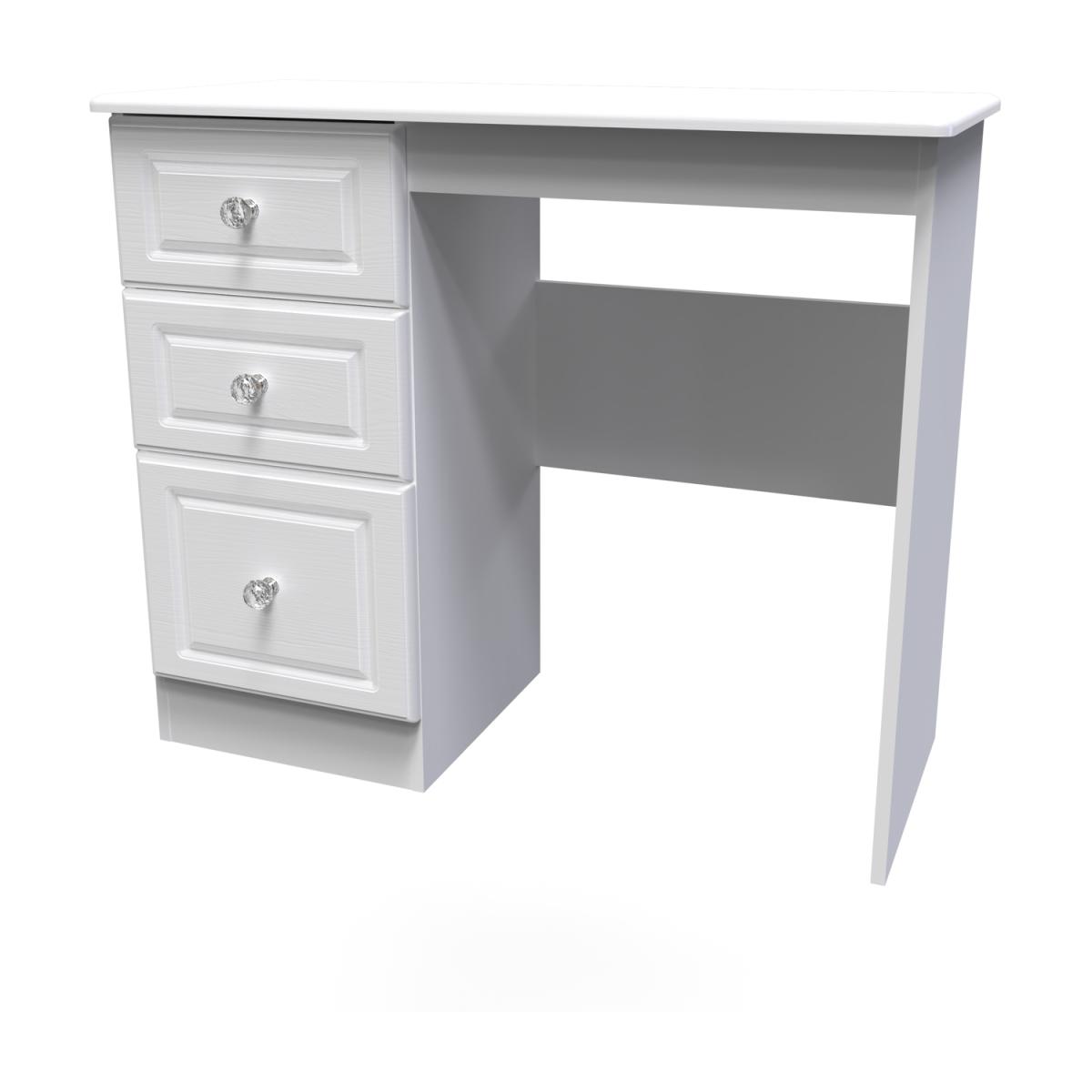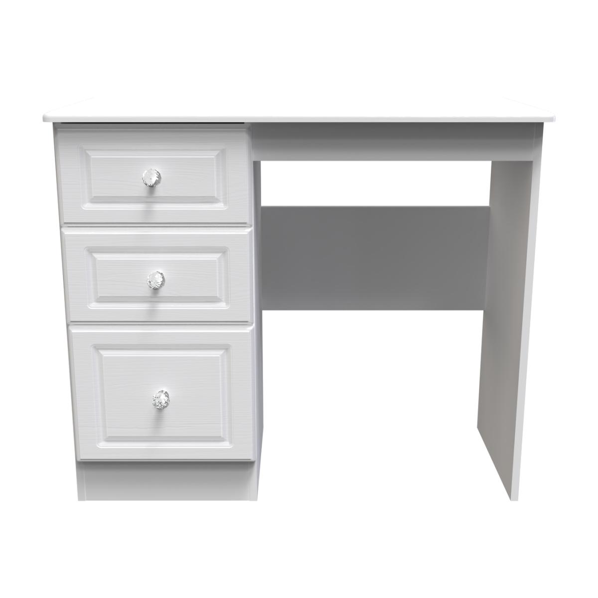 This practical 3 drawer narrow deskvanity is perfect for any bedroom or office. A matching stool and mirror (in 2 sizes) are also available. A crafted, traditional bedroom set with distinctive detailing. With its crystal feature handles, this range will be sure to make your room sparkle. Solidly built with a durable scratch-resistant finish and with a subtle wood grain or matt effect available. The collection offers style, durability and ample storage space. All our furniture is made in the United Kingdom, to the highest quality. It is delivered direct to your location of choice by one of our two man delivery teams, and come full assembled (although legs may be removed to prevent damage in transit).