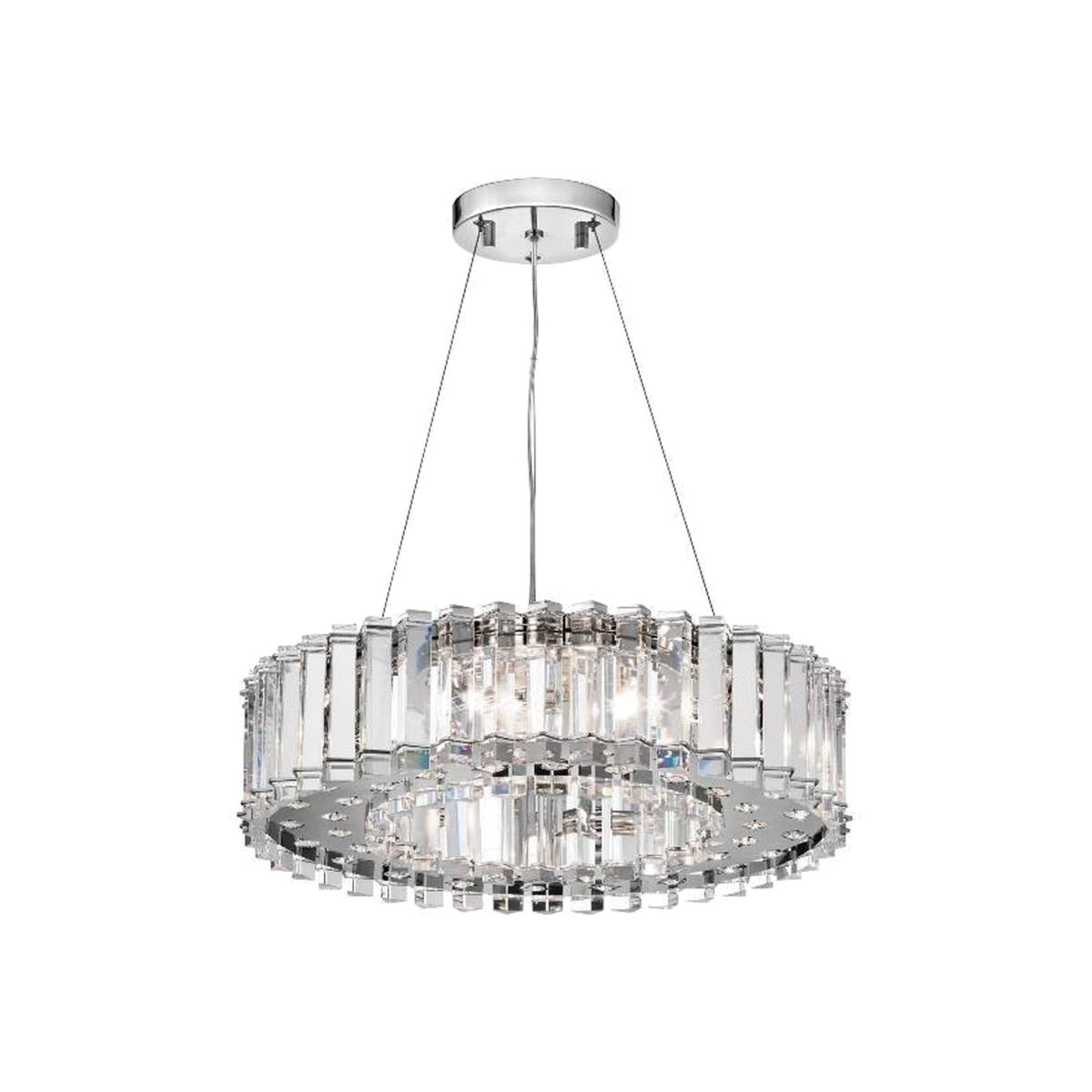 This 8 light chandelier features triangular crystal prisms that rest inside Chrome details and stand ready to reflect light in a hundred different ways. Rounded crystals on the bottom reflect the inner light. Also available in this range Island Chandelier, 6lt Pendant, and 2lt Wall Light.