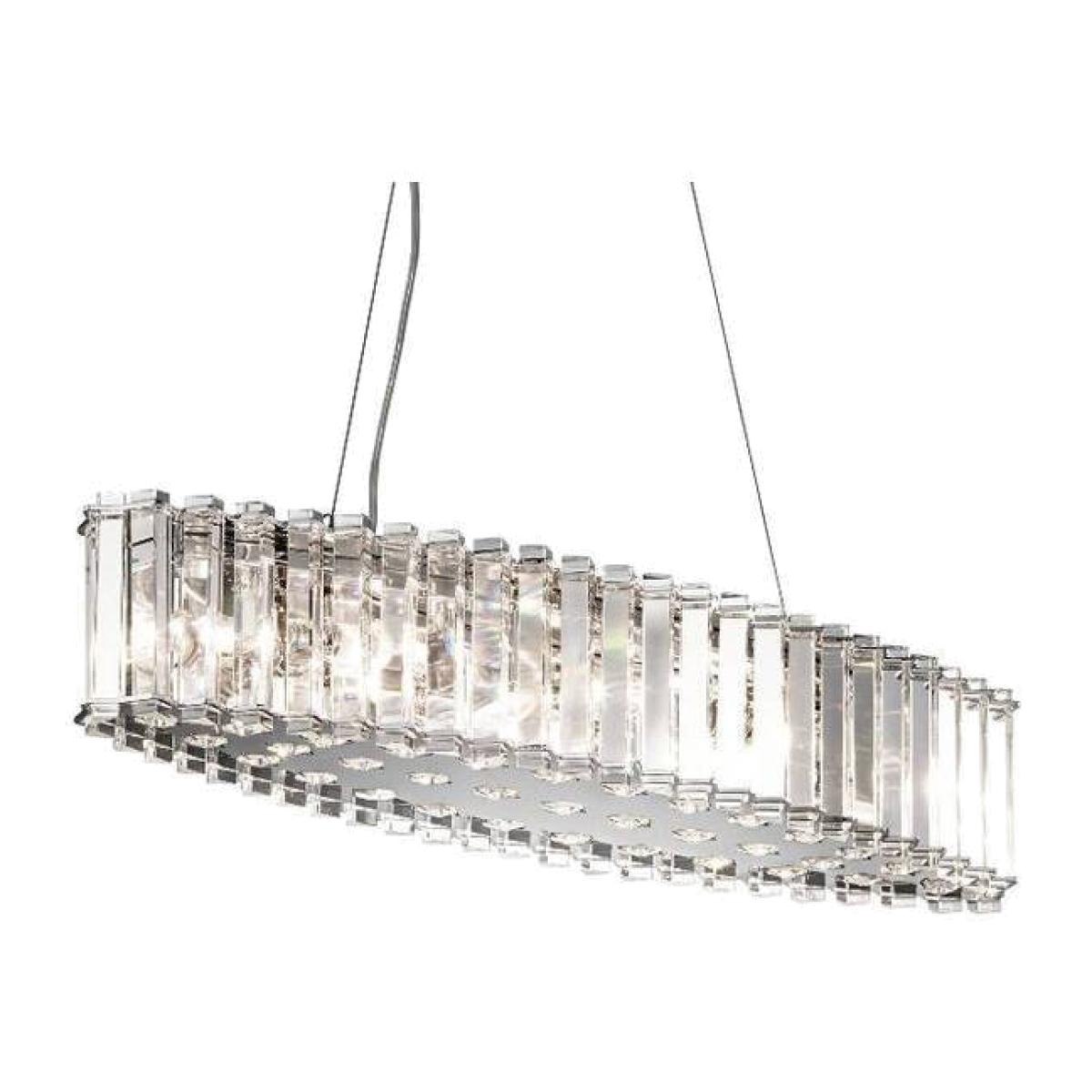 This island chandelier features triangular crystal prisms that rest inside Chrome details and stand ready to reflect light in a hundred different ways. Rounded crystals on the bottom reflect the inner light. Also available in this range 6lt Pendant, 2lt Wall Light, and 8lt Chandelier.