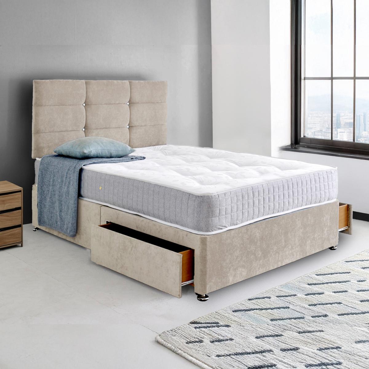 The luxurious Divan Bed Set showcases the finest British craftsmanship, made with precision and care ensuring lost lasting quality. This Divan Bed features matching 24 inch headboard cube headboard adding a touch of class to any bedroom. Designed to pair seamlessly with the elegant open coil spring memory foam mattress, allowing you to create the perfect sleep sanctuary. The Memory Foam Spring mattress provides comfort and support for a relaxing nights sleep. Crafted with the finest material, the bed boasts durability, comfort and promising years of restful night's sleep. This bed set shows sophistication and elegance, adding a touch of luxury to your bedroom. Elevate your bedroom with this luxurious Divan Bed Set and experience the perfect blend of elegance, style and quality. Transform your space in a haven of comfort and sophistication.