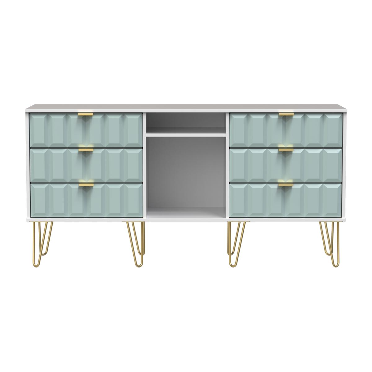This wide storage unit features 6 storage drawers with a central shelf. Suitable for use as a TVMedia unit or sideboard. A modern and distinctive range. A modern and distinctive range. Named for the unique "Cube" patten of the drawer and door fronts. Also features Gold Metal Handles and Gold Hairpin Legs. Comes in a wide range of colours including eye cathching two tone colour combinations. All our furniture is made in the United Kingdom, to the highest quality. It is delivered direct to your location of choice by one of our two man delivery teams, and come full assembled (although legs may be removed to prevent damage in transit).