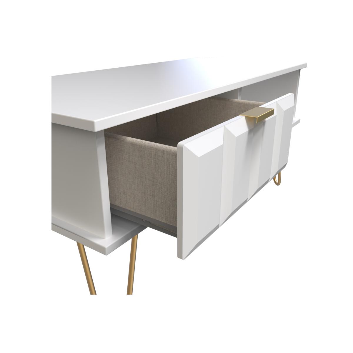 This modern coffee table, has a single storage drawer and open shelf stroage area. A modern and distinctive range. Named for the unique "Cube" patten of the drawer and door fronts. Also features Gold Metal Handles and Gold Hairpin Legs. Comes in a wide range of colours including eye cathching two tone colour combinations. All our furniture is made in the United Kingdom, to the highest quality. It is delivered direct to your location of choice by one of our two man delivery teams, and comes fully assembled (although legs may be removed to prevent damage in transit).