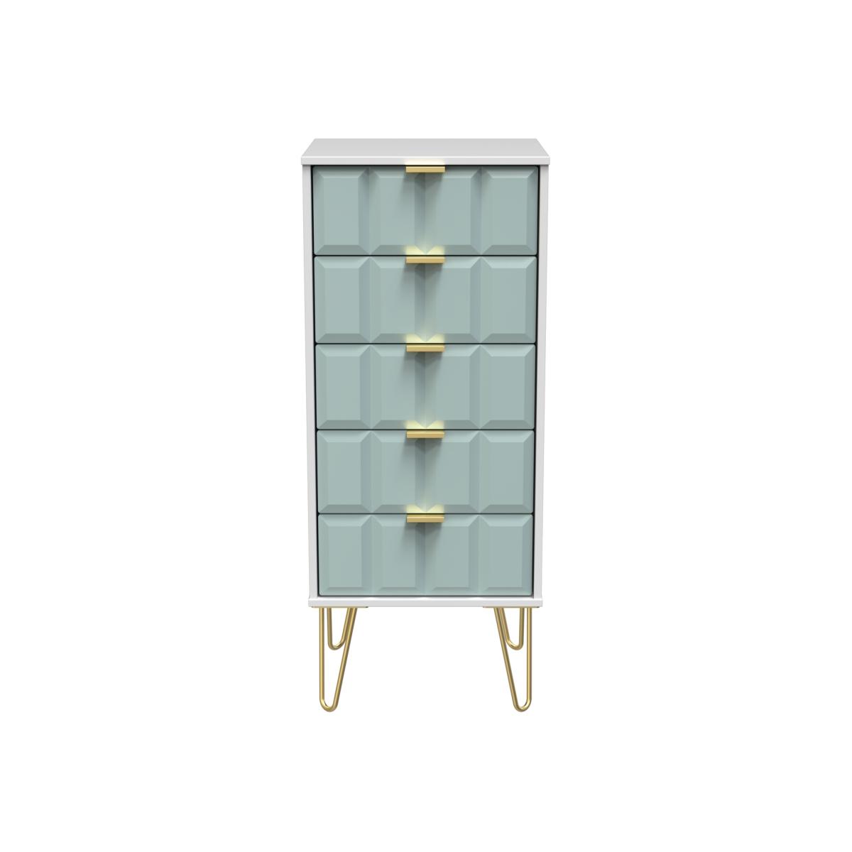 This 5 drawer chest of drawers is practical and stylish. Perfect for any home as a free standing storage unit. A modern and distinctive range. Named for the unique "Cube" patten of the drawer and door fronts. Also features Gold Metal Handles and Gold Hairpin Legs. Comes in a wide range of colours including eye cathching two tone colour combinations. All our furniture is made in the United Kingdom, to the highest quality. It is delivered direct to your location of choice by one of our two man delivery teams, and come full assembled (although legs may be removed to prevent damage in transit).