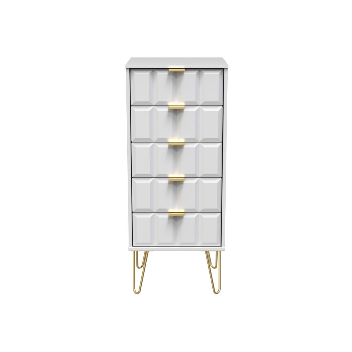 This 5 drawer chest of drawers is practical and stylish. Perfect for any home as a free standing storage unit. A modern and distinctive range. Named for the unique "Cube" patten of the drawer and door fronts. Also features Gold Metal Handles and Gold Hairpin Legs. Comes in a wide range of colours including eye cathching two tone colour combinations. All our furniture is made in the United Kingdom, to the highest quality. It is delivered direct to your location of choice by one of our two man delivery teams, and come full assembled (although legs may be removed to prevent damage in transit).