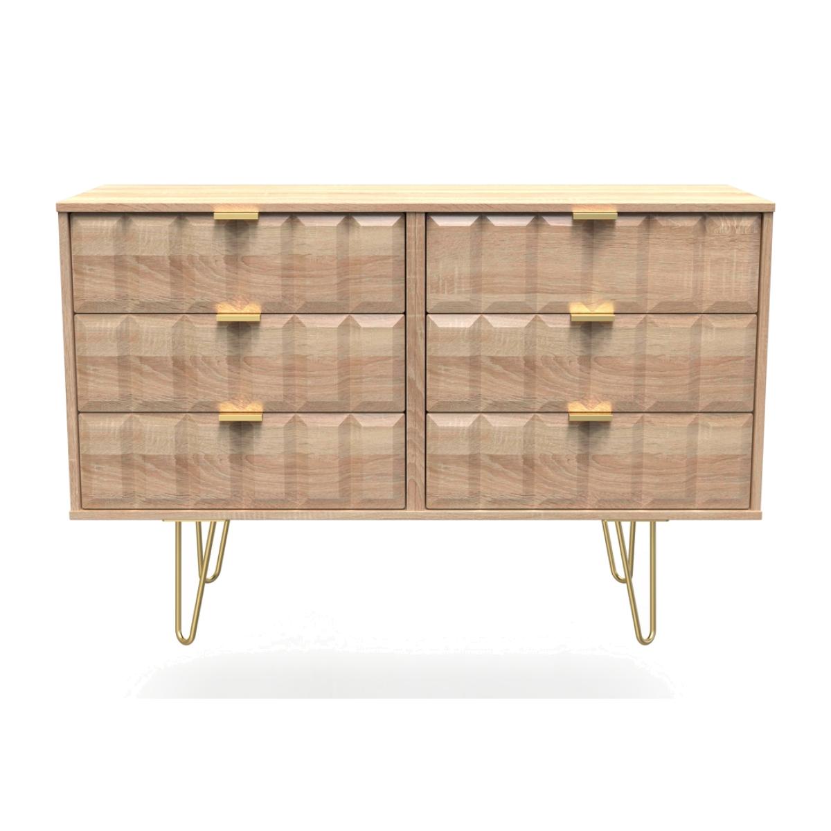 This double width 6 drawer chest of drawers is practical and stylish. Perfect for any home as a free standing storage unit. A modern and distinctive range. Named for the unique "Cube" patten of the drawer and door fronts. Also features Gold Metal Handles and Gold Hairpin Legs. Comes in a wide range of colours including eye cathching two tone colour combinations. All our furniture is made in the United Kingdom, to the highest quality. It is delivered direct to your location of choice by one of our two man delivery teams, and comes fully assembled (although legs may be removed to prevent damage in transit).