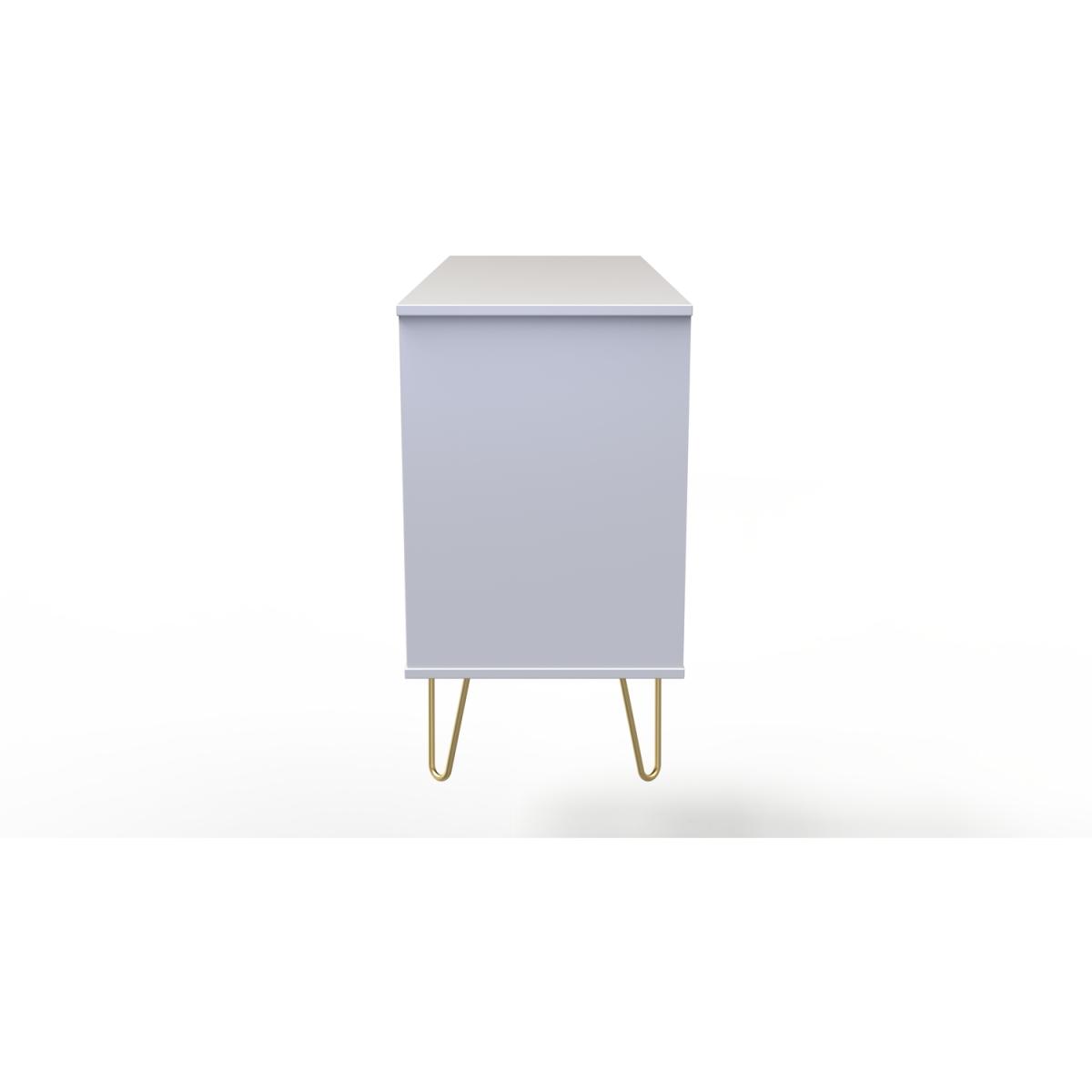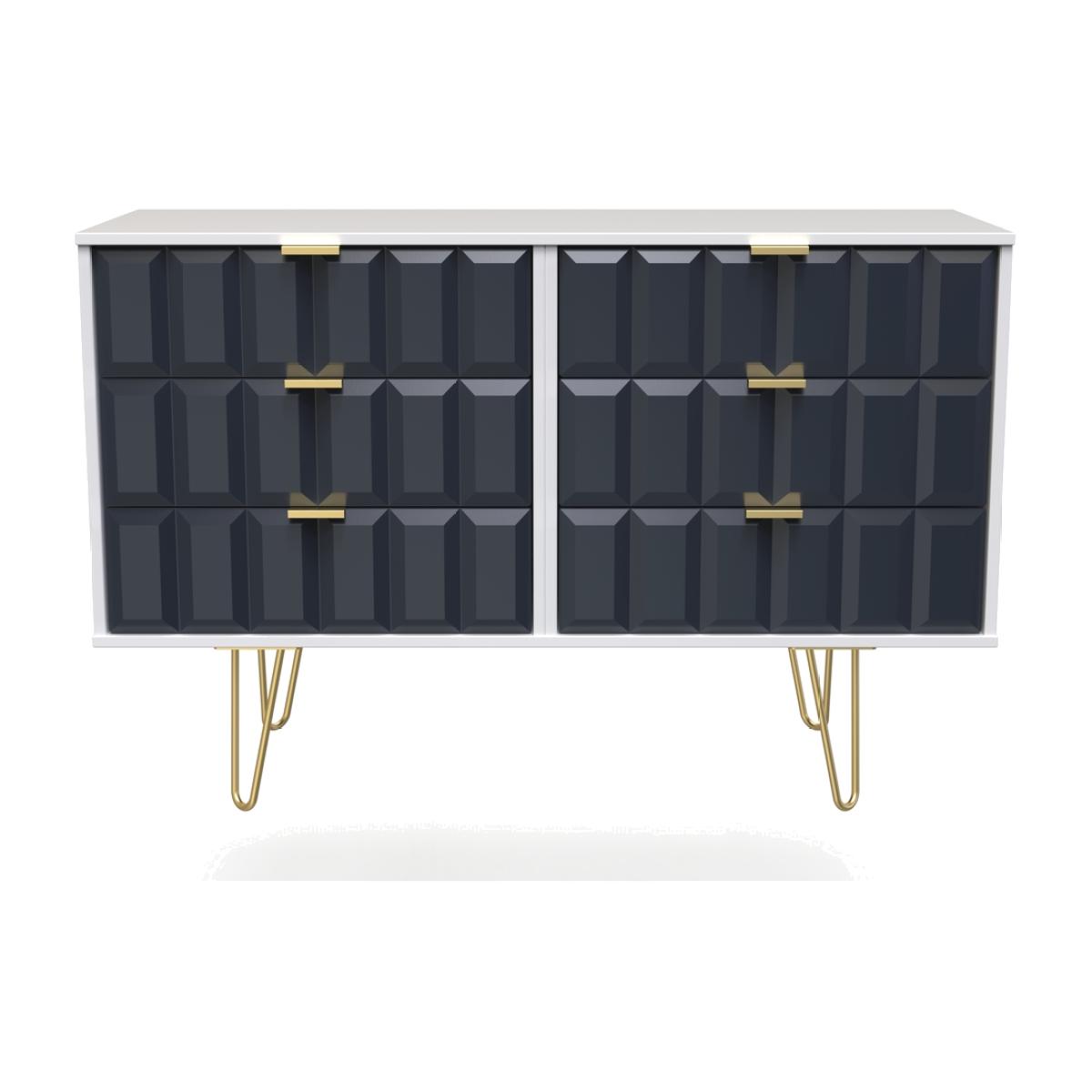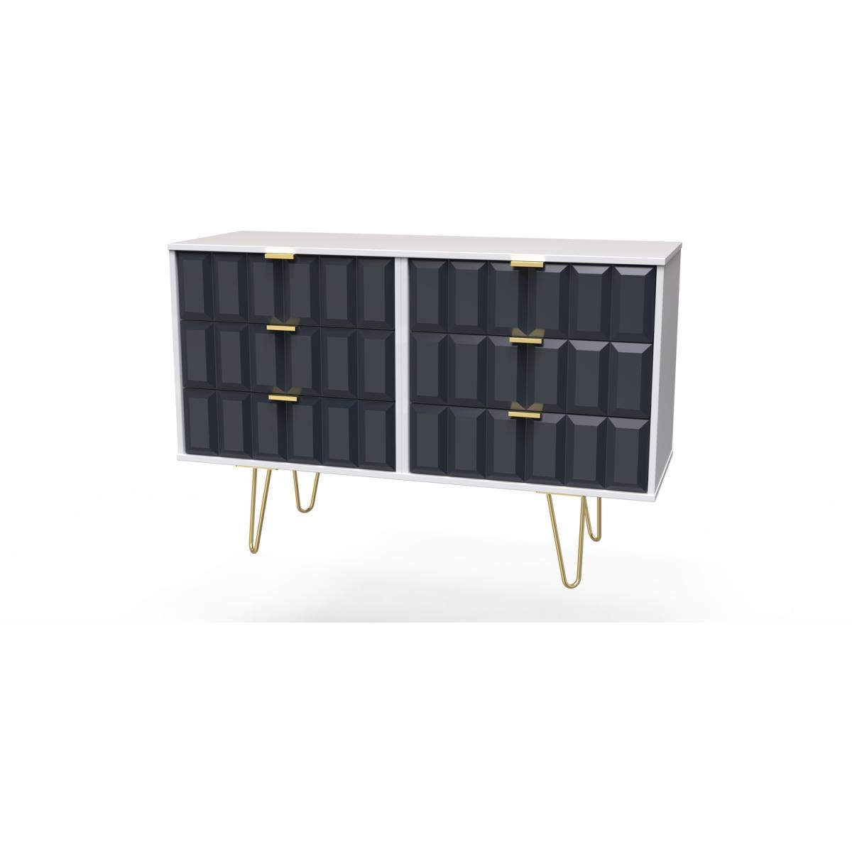This double width 6 drawer chest of drawers is practical and stylish. Perfect for any home as a free standing storage unit. A modern and distinctive range. Named for the unique "Cube" patten of the drawer and door fronts. Also features Gold Metal Handles and Gold Hairpin Legs. Comes in a wide range of colours including eye cathching two tone colour combinations. All our furniture is made in the United Kingdom, to the highest quality. It is delivered direct to your location of choice by one of our two man delivery teams, and come full assembled (although legs may be removed to prevent damage in transit).