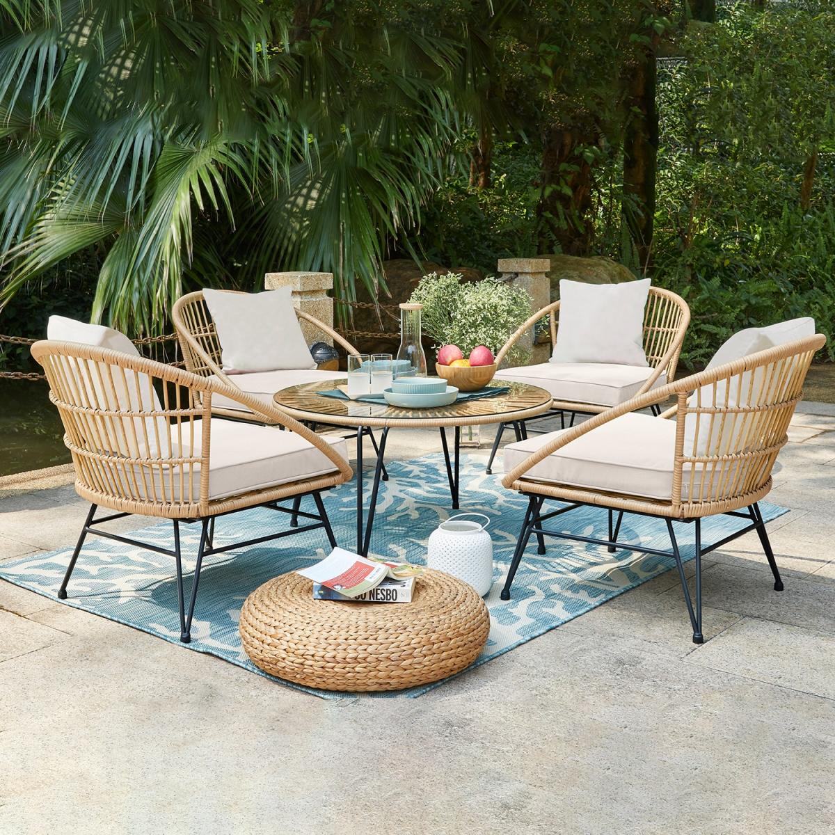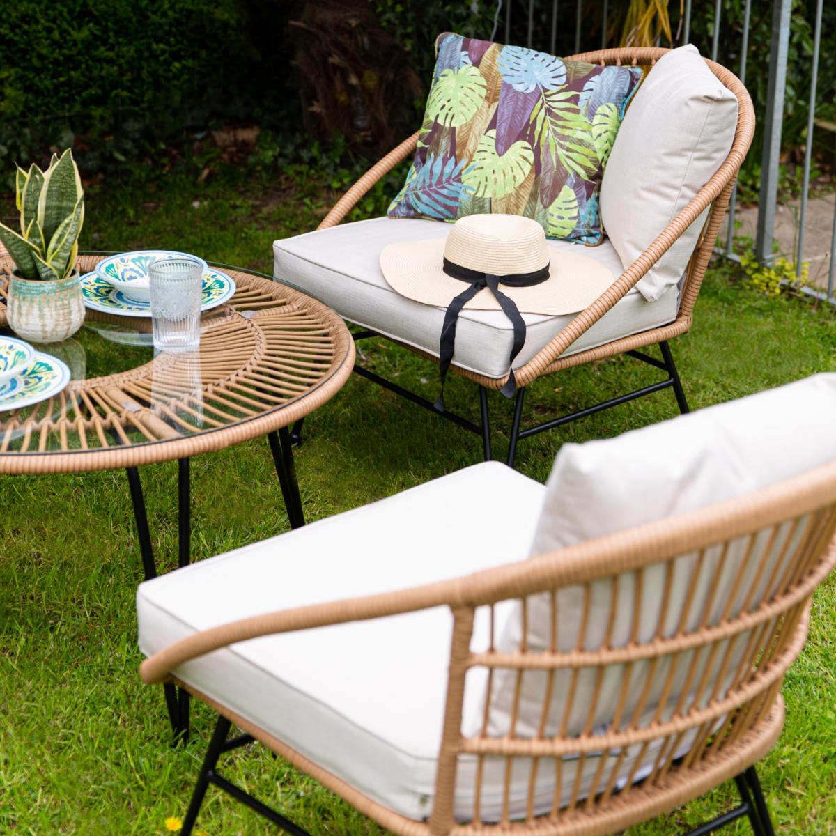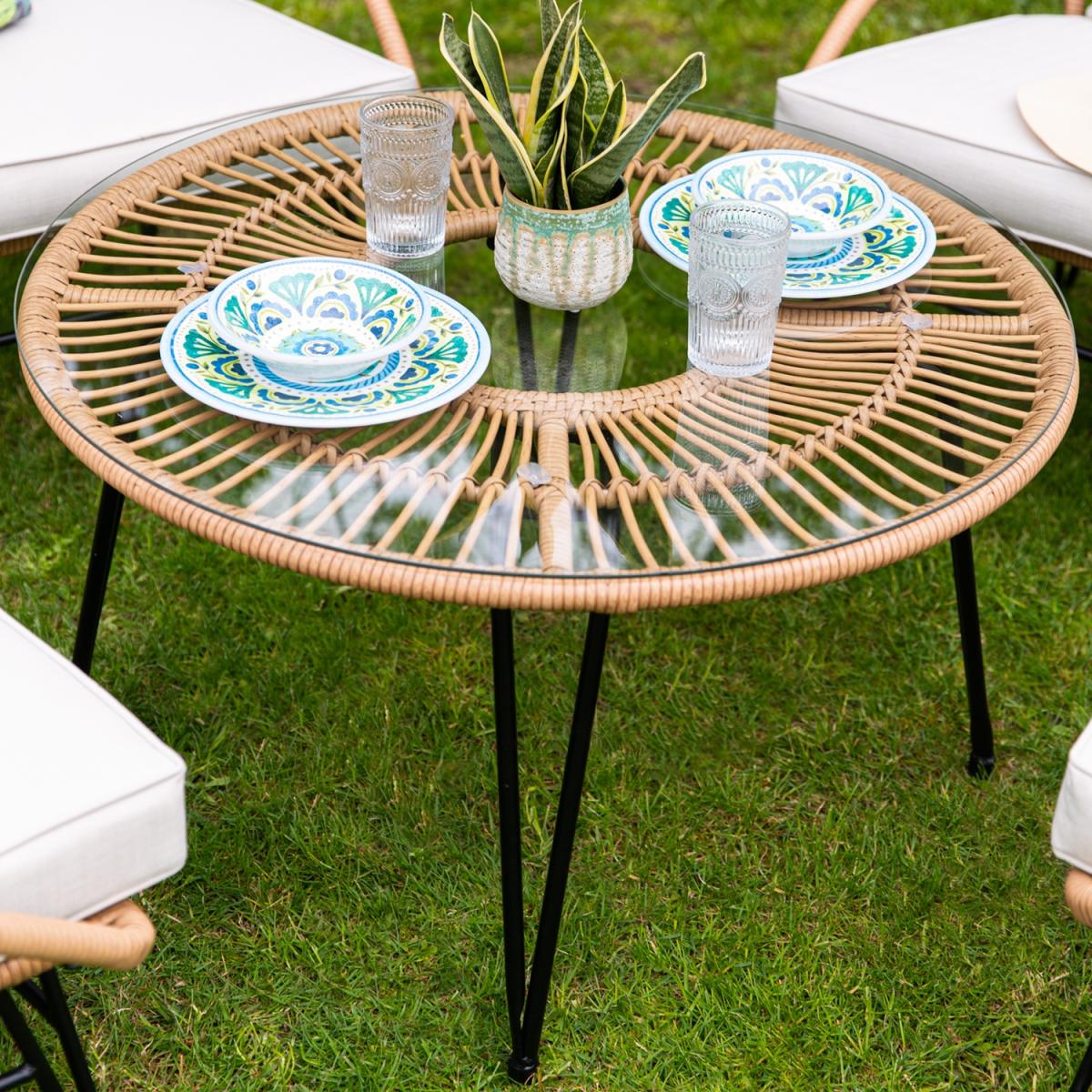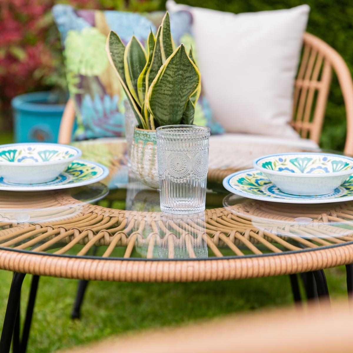 The Cuckooland Hampstead Outdoor 4 Seat Bistro Set was made for sharing! With enough room for four of your family and friends to relax - share drinks and nibbles around the large circular table and you'll be getting good stories, a lot of laughter and probably some over-sharing in return! You'll all get to enjoy the plush showerproof cushions, cocooning arms and supportive angles while you have a well overdue catchup. Paired with metal frames, hairpin leg details, a poly-rattan weave and tempered glass top - you'll be sharing memories around this durable and stylish garden furniture set for many summers to come!.