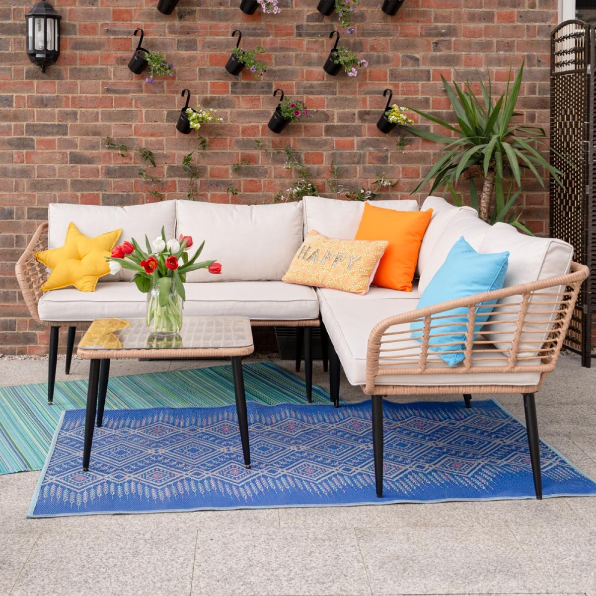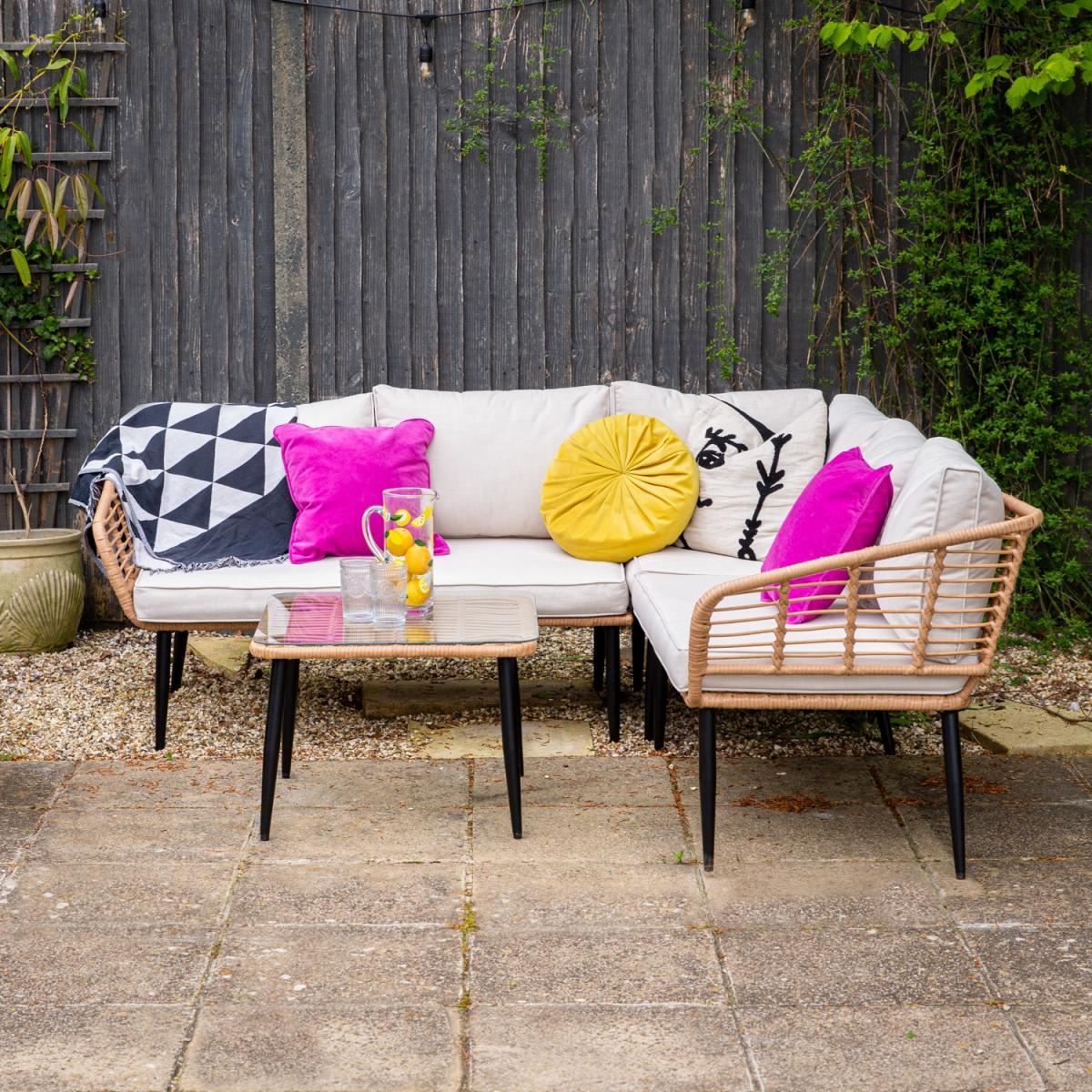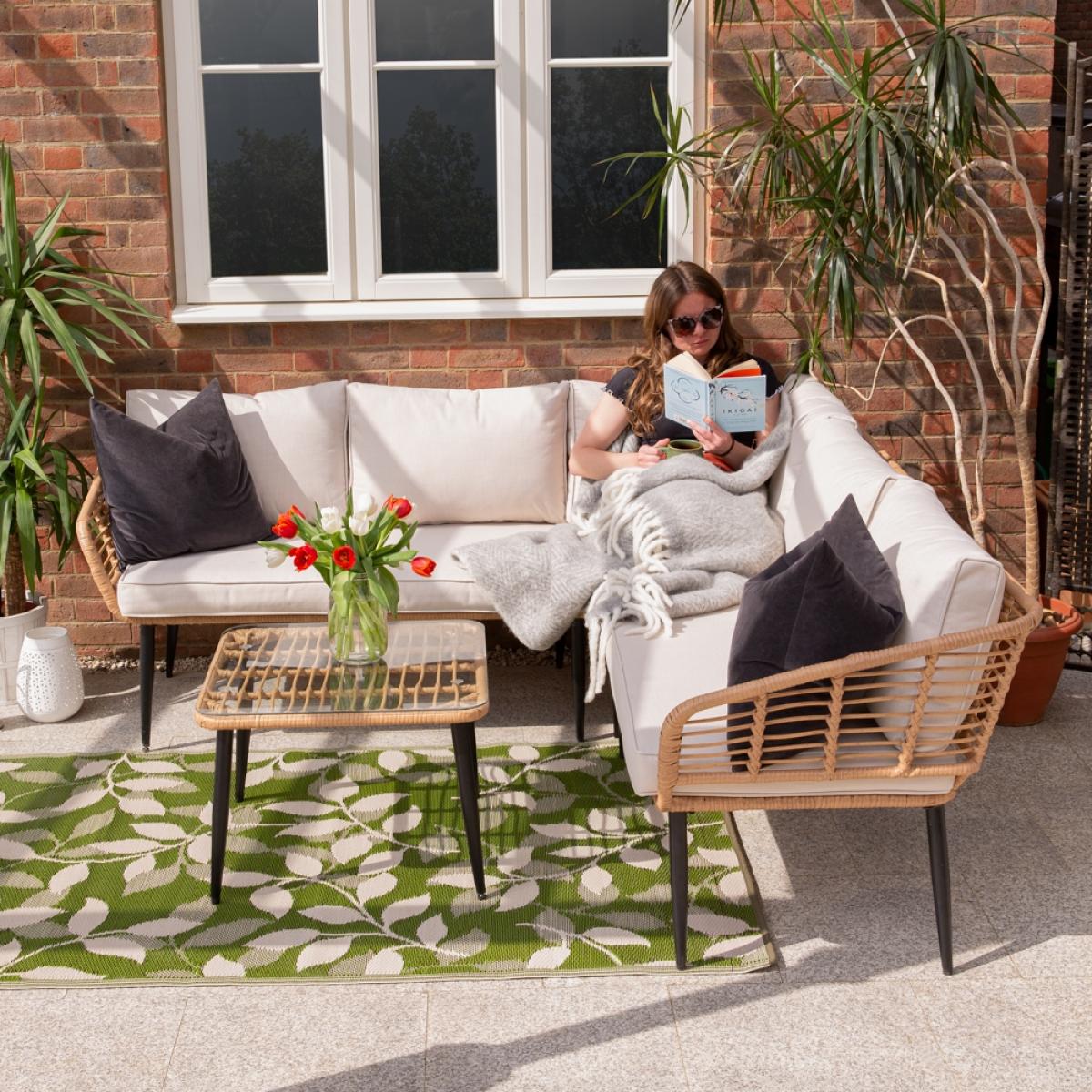 You won't be able to resist a sit down on the sectional Cuckooland Hampstead Garden Rattan Corner Sofa with Coffee Table! You'll create any excuse to pay another visit. Family get-togethers, BBQ parties, coffee catchups, garden gatherings or even just to get a good dose of vitamin D! Whatever the occasion, you'll love settling into the plush showerproof cushions, stretching out and soaking it all in. Giving your garden serious boho vibes - the garden corner sofa has been styled with a natural poly-rattan weave and contrasting tapered black steel legs that are sure to make a statement on your patio. Complete with a coordinating Hampstead coffee table - dress the tempered glass top with candles and lanterns, and you can stay put even after the sun has disappeared!.