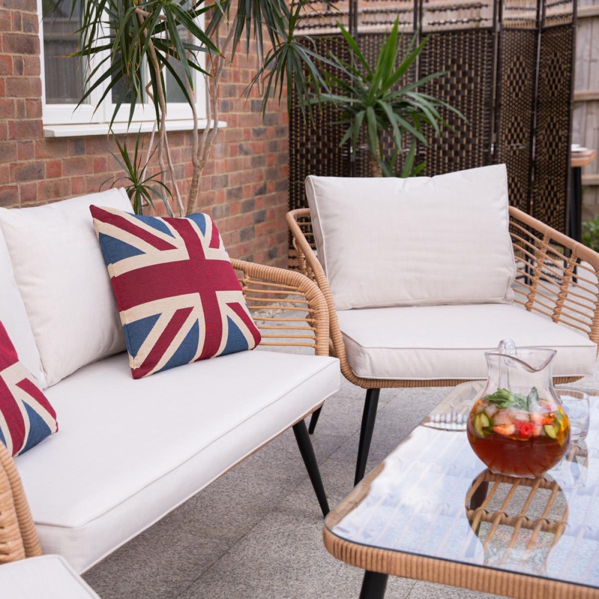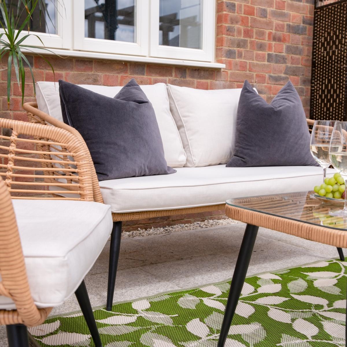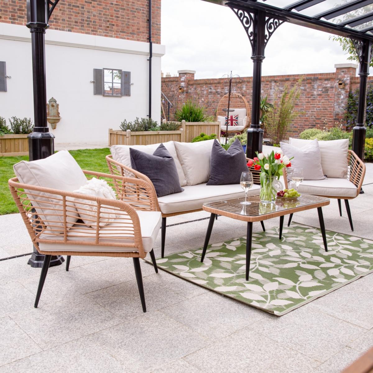 Including a two-seater sofa, two cocooning armchairs and a coordinating coffee table - arrange the Cuckooland Hampstead Garden Rattan Sofa and Armchair Set just how you like! Arrange the showerproof cushions just-so, position your seating out in the sunshine and settle in for the long haul! It's the perfect setting to BBQ parties, coffee catchups and family get-togethers. Or taking the weekend all to yourself, switching your phone off and diving into a good book - just don't forget your sunnies and snacks. Crafted with durable steel frames with a woven poly-rattan weave, bold black tapered legs and a tempered glass table top - you'll be enjoying your Hampstead garden lounge set for many sunny weekends to come!.