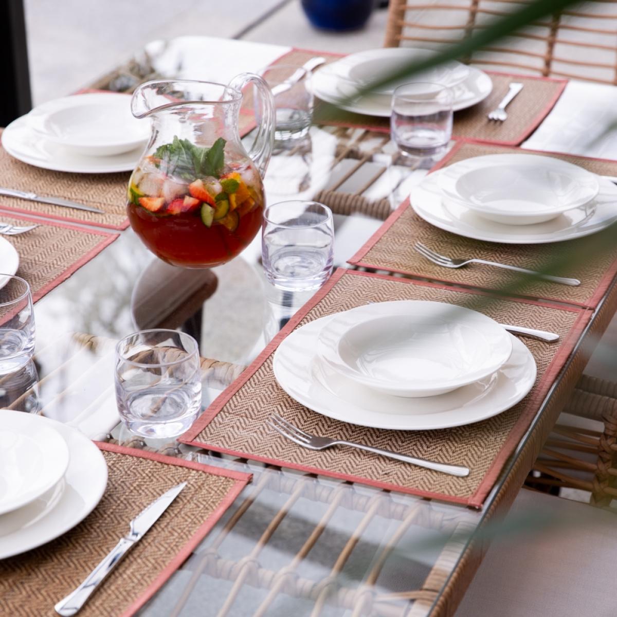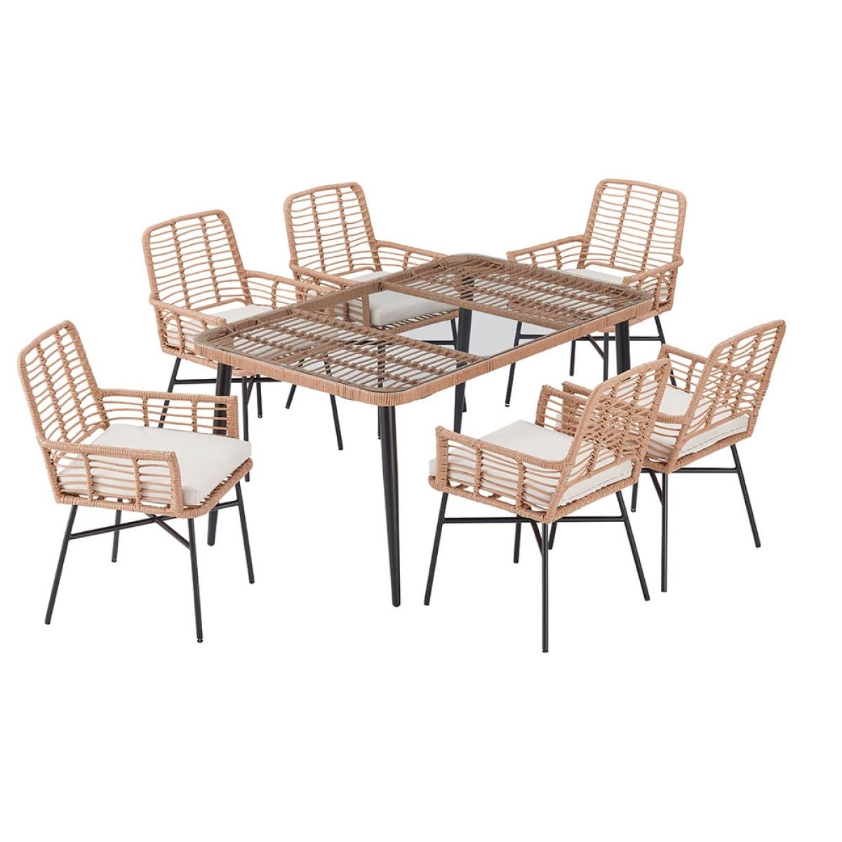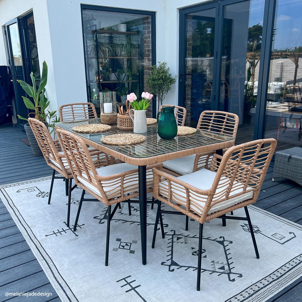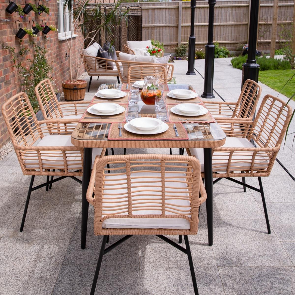 Give your alfresco breakfasts, brunches and BBQs a bohemian twist with the Cuckooland Hampstead Garden Rattan Contemporary Six Seater Dining Set! Seating six - relax around the tempered glass dining table and settle into the coordinating Hampstead dining chairs while you enjoy amazing food and (hopefully) even better company! At least your garden furniture set won't let you down! The sculpted steel armchairs have received the VIP treatment. Finished in black with a contrasting poly-rattan weave and topped with plush showerproof cushions, rain or shine your garden set gets a 10/10!.