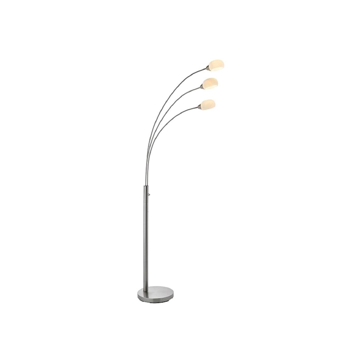 Amazing mu Light arm integrated LED floor lamp finished in a sophisticated satin nickel finish with white glass shades. An up to date version of an iconic classic style. Featuring a rotary dimmer on /off switch, located centrally for easy light control. Colour: Nickel. Lamp Holder Type: COB. Bulb Type: LED Module. Maximum Bulb Wattage: 5. Bulb Included:Yes. Number of Bulbs: 3.