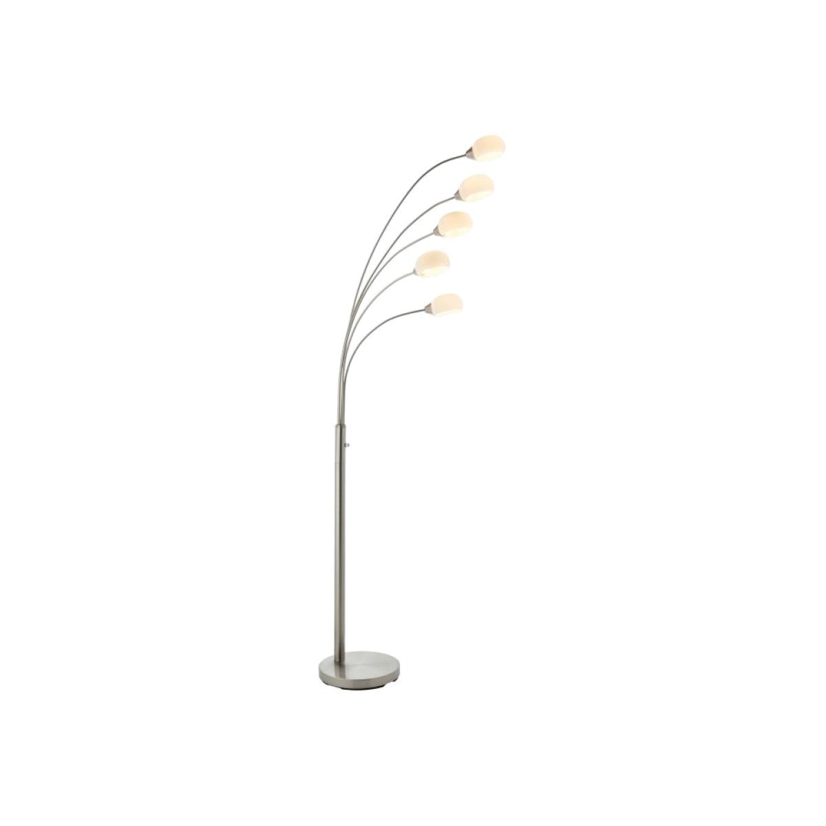Amazing mu Light arm integrated LED floor lamp finished in a sophisticated satin nickel finish with white glass shades. An up to date version of an iconic classic style. Featuring a rotary dimmer on /off switch, located centrally for easy light control. Colour: Nickel. Lamp Holder Type: COB. Bulb Type: LED Module. Maximum Bulb Wattage: 5. Bulb Included:Yes. Number of Bulbs: 5.