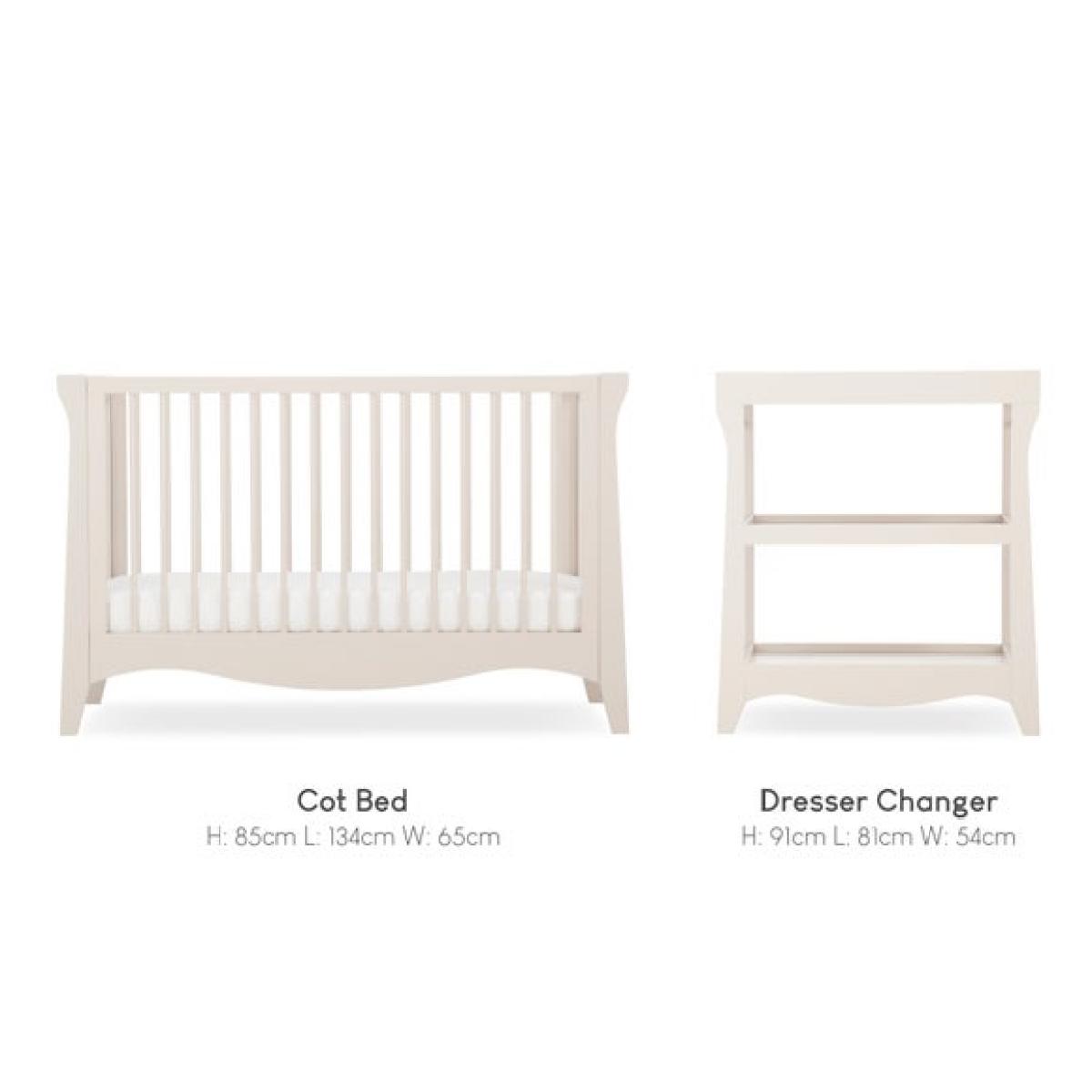 * Cot bed that grows with baby * Adjustable mattress height * Mini changer unit * Open shelving * Hanging rails * Soft cashmere colour Create a calm and timeless space for your little one with the Clara 2 Piece Mini Changer & Cot Bed Nursery Set in a soft, gender-neutral cashmere finish. This space-saving duo includes a mini cot bed that grows with your baby, converting easily into a toddler day bed as they transition through milestones. The cot’s three mattress heights and open slatted sides provide peace of mind and practicality. The open changer pairs modern style with functionality, offering handy rails for hanging clothes and open shelving for nappies, wipes, and other essentials. A perfect blend of smart design and cosy charm for your baby’s first bedroom.