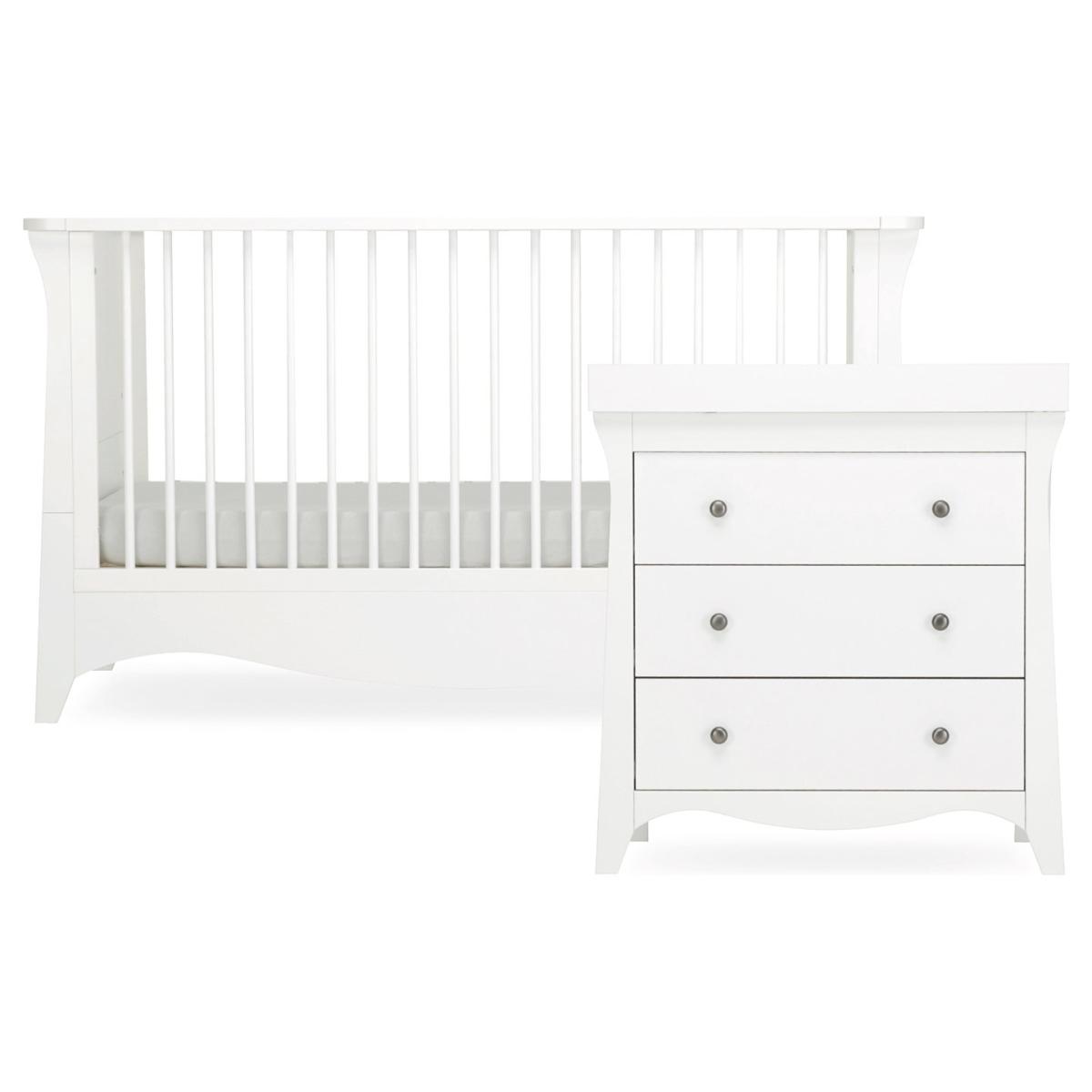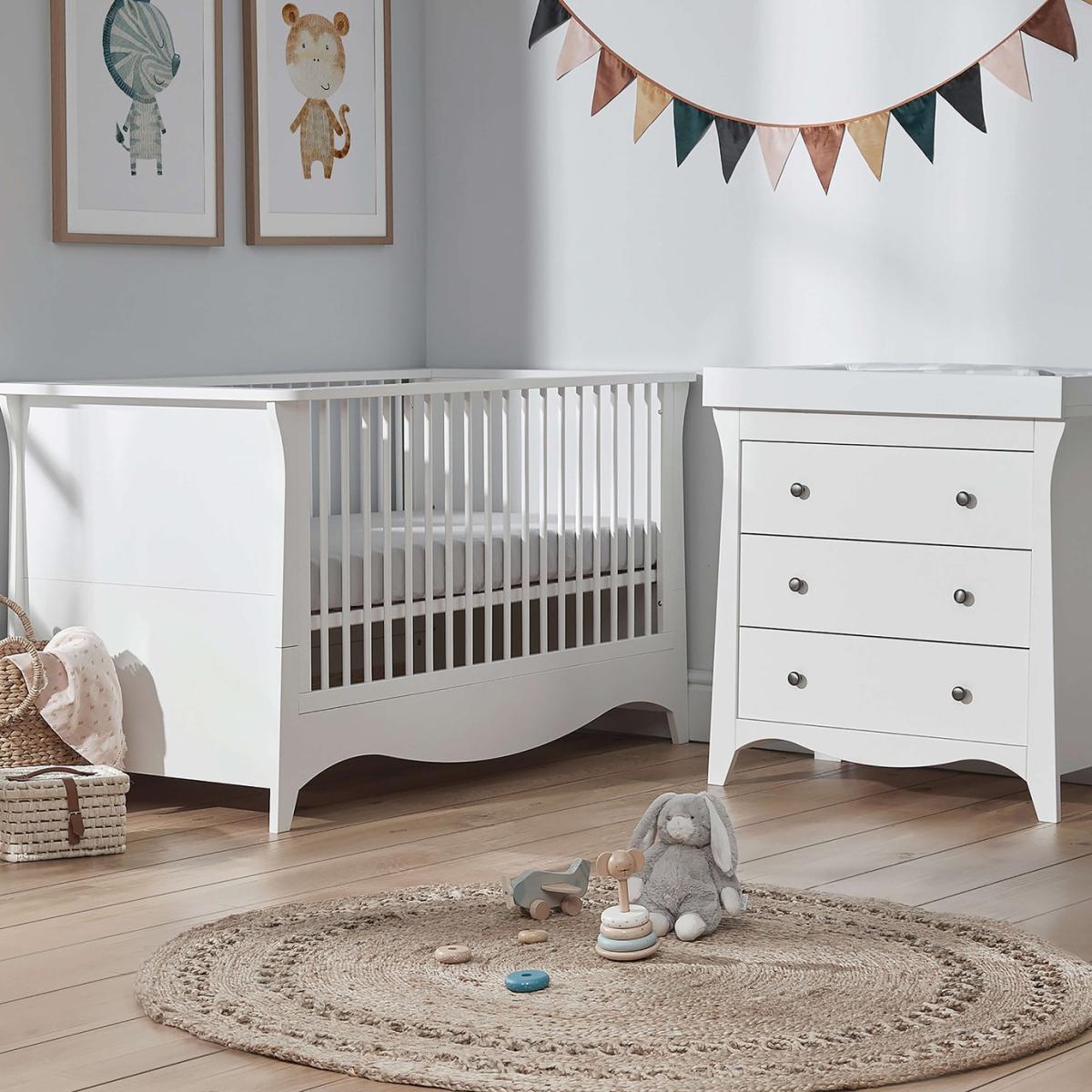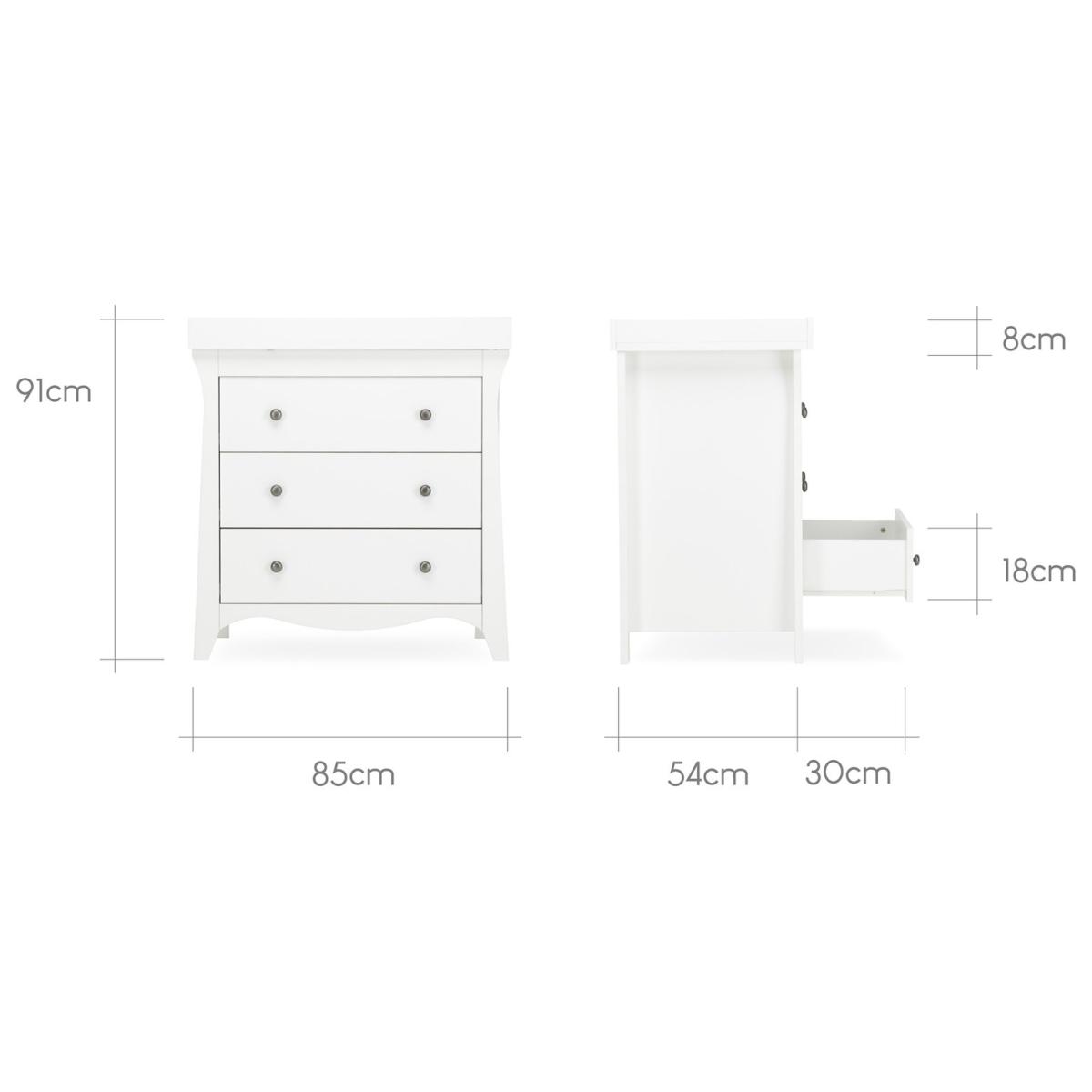 Complete your fairy tale with the Clara 2pc furniture set, including a cot bed and 3 drawer dresser & changer. Classic curvature with a modern contemporary look, function and style to transform any nursery. Clara cot bed is suitable from birth to about 5 years. Designed with 3 mattress positions, the Clara easily converts into a stylish toddler bed for years of enjoyment. Clara 3 drawer dresser designed to offer you style, storage and function with 3 spacious drawers and a removable changing station. Cot Bed converts into stylish toddler bed and is suitable from birth to approximately 5 years. Part of the Clara collection. 2 piece set, including: cot bed, chest of drawers, changing unit, changer top. Cot suitable from birth until baby is able to climb out. Converts to toddler bed. Toddler bed suitable for ages 2 years to 5 years. Made of particleboard. Cot features Cot L82, W156.5, H88cm. Weight 39.6kg. 3 position adjustable mattress to lower the baby as they grow. Mattress base adjustable height 31cm, 48.1cm, 65.2cm. Mattress not included. Mattress required: L140, W70,. Height under cot 3.8cm. Dresser features Dresser H91, W85, D53.5cm. Chest of drawers features Drawers H91, W85, D53.5cm. Weight 39.7kg. 3 drawers. Chest of drawers internal drawer H14.6, W85, D50cm. Integrated changer top. Changer features Changer top internal H6, W85, D53.5cm. Changer maximum user weight 11kg. Changer top attached. Changer top detachable. Changer H6, W85, D53.5cm. Packaging Comes in 4 boxes. Largest box H17.5, W149.5, D89cm. Package Dimensions: Package 1 dimensions: H11, W93.5, D56.5cm. Package 1 weight: 21.95kg. Package 2 dimensions: H13.5, W79.5, D53cm. Package 2 weight: 21.2kg. Package 3 dimensions: H13.5, W56, D94cm. Package 3 weight: 27.75kg. General information Packed flat - 2 people recommended. (includes wall fixing). Manufacturer's 1 year guarantee. If the product is over 60cm high it must be securely attached to the wall to prevent overturning.