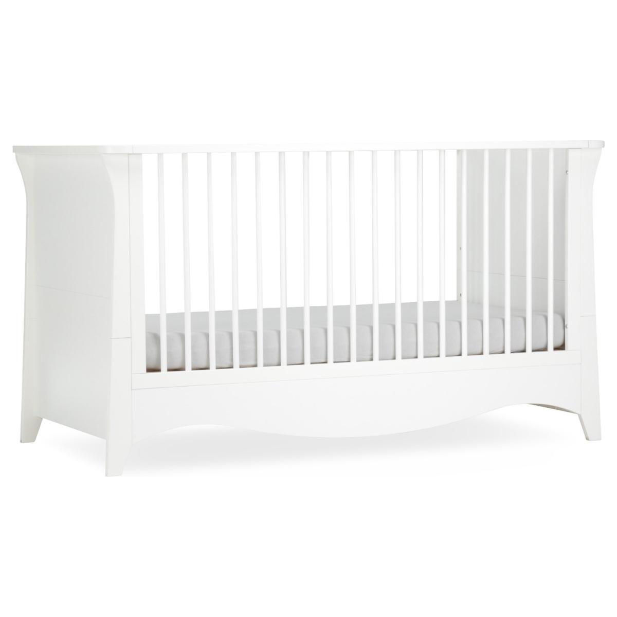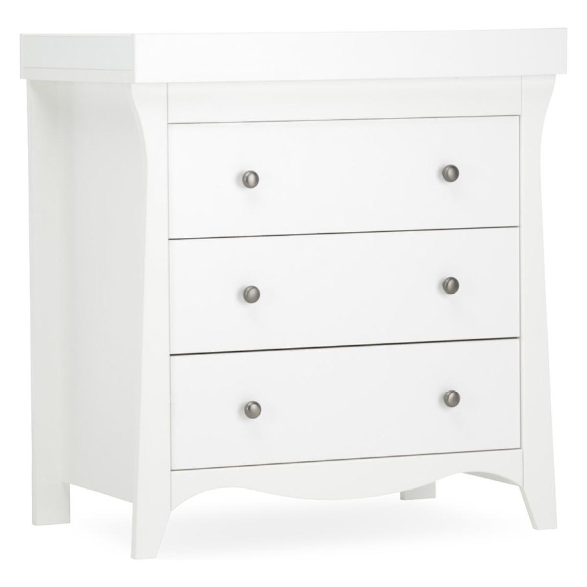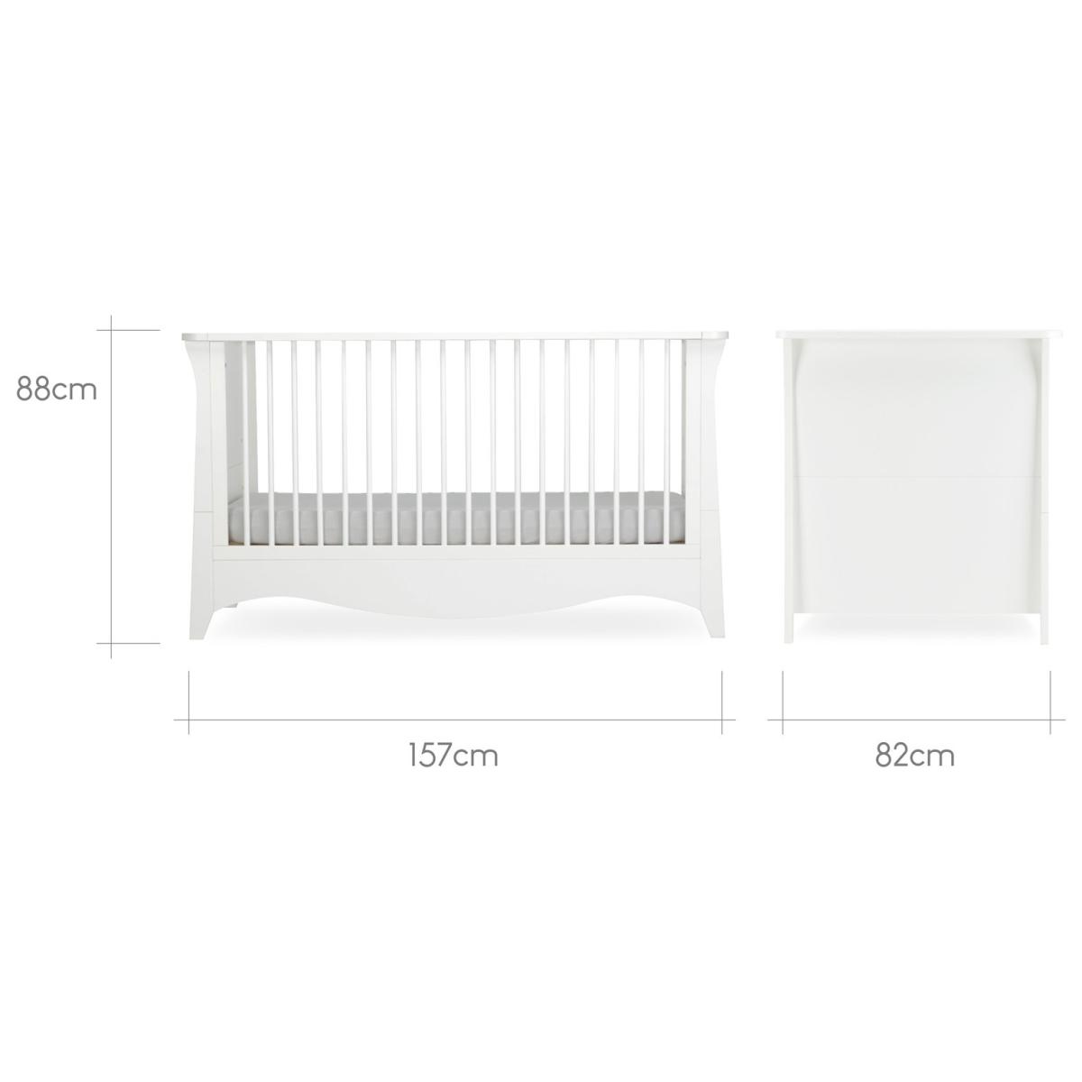 Complete your fairy tale with the Clara 2pc furniture set, including a cot bed and 3 drawer dresser & changer. Classic curvature with a modern contemporary look, function and style to transform any nursery. Clara cot bed is suitable from birth to about 5 years. Designed with 3 mattress positions, the Clara easily converts into a stylish toddler bed for years of enjoyment. Clara 3 drawer dresser designed to offer you style, storage and function with 3 spacious drawers and a removable changing station. Cot Bed converts into stylish toddler bed and is suitable from birth to approximately 5 years. Part of the Clara collection. 2 piece set, including: cot bed, chest of drawers, changing unit, changer top. Cot suitable from birth until baby is able to climb out. Converts to toddler bed. Toddler bed suitable for ages 2 years to 5 years. Made of particleboard. Cot features Cot L82, W156.5, H88cm. Weight 39.6kg. 3 position adjustable mattress to lower the baby as they grow. Mattress base adjustable height 31cm, 48.1cm, 65.2cm. Mattress not included. Mattress required: L140, W70,. Height under cot 3.8cm. Dresser features Dresser H91, W85, D53.5cm. Chest of drawers features Drawers H91, W85, D53.5cm. Weight 39.7kg. 3 drawers. Chest of drawers internal drawer H14.6, W85, D50cm. Integrated changer top. Changer features Changer top internal H6, W85, D53.5cm. Changer maximum user weight 11kg. Changer top attached. Changer top detachable. Changer H6, W85, D53.5cm. Packaging Comes in 4 boxes. Largest box H17.5, W149.5, D89cm. Package Dimensions: Package 1 dimensions: H11, W93.5, D56.5cm. Package 1 weight: 21.95kg. Package 2 dimensions: H13.5, W79.5, D53cm. Package 2 weight: 21.2kg. Package 3 dimensions: H13.5, W56, D94cm. Package 3 weight: 27.75kg. General information Packed flat - 2 people recommended. (includes wall fixing). Manufacturer's 1 year guarantee. If the product is over 60cm high it must be securely attached to the wall to prevent overturning.