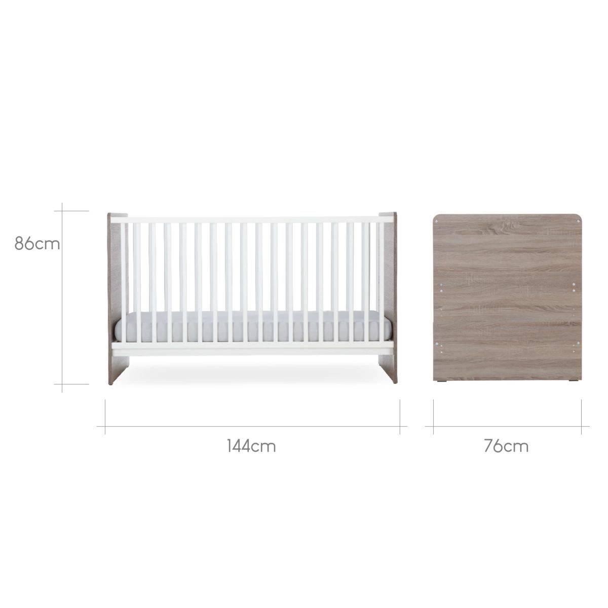 * Oak and white design* 3 adjustable mattress positions* Transforms into a toddler bed* Suitable for ages 0-5* Requires a mattress 140cm x 70cm This Cuddle Co Enzo cot bed is a stylish and practical piece that provides your little one somewhere to sleep throughout the first few years of their life. It's been designed to grow with your child, ensuring that they have a safe and comfortable sleep environment from birth to approximately 5 years old. The Enzo Cot Bed boasts 3 easy-to-switch mattress base positions, allowing you to adjust the height as your baby grows and develops. And when your little one outgrows the cot mode, the Enzo Cot Bed seamlessly converts into a toddler bed, making it a versatile and long-lasting investment for your child's sleeping needs. With a sleek and strong silhouette, the Enzo furniture collection is a great addition to any nursery. The pieces feature a neutral Truffle Oak finish, expertly paired with a cool white finish, creating a subtle and stylish aesthetic that will complement any décor or style.**Please Note:** When converted into a toddler bed this product is recommended for use by one child aged 18 months to 5 years.