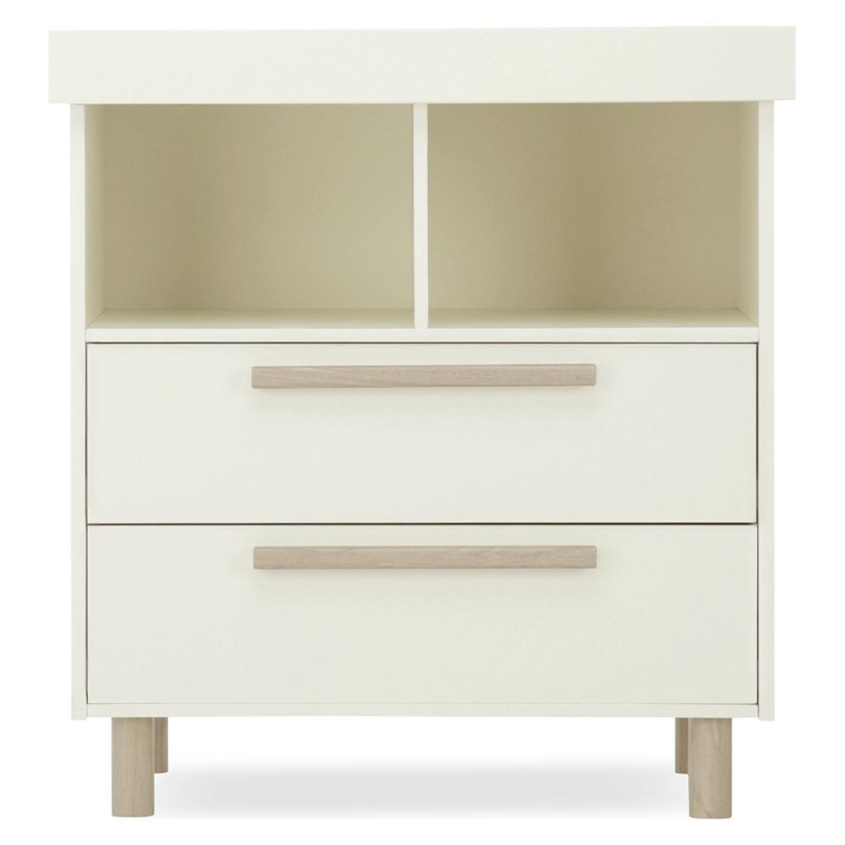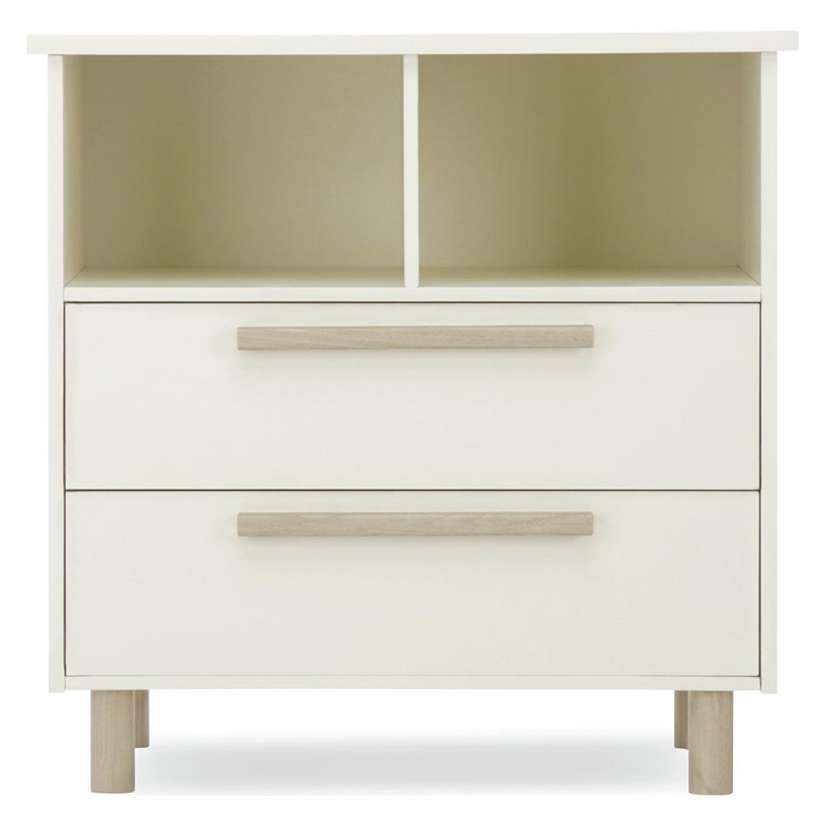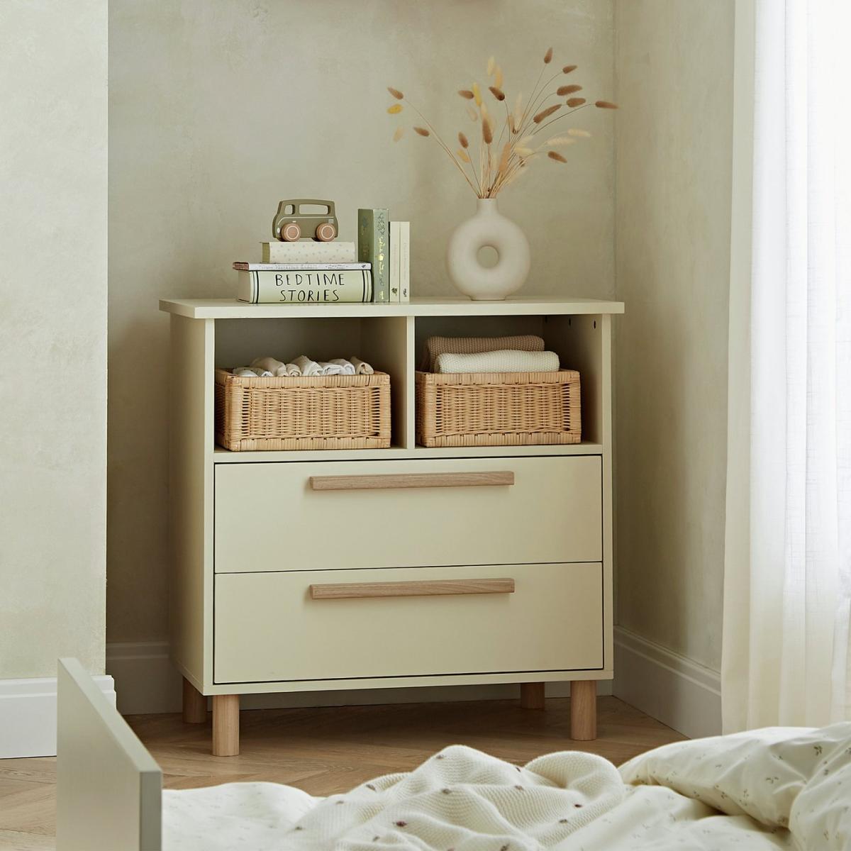 The Harper Dresser chest provides stylish storage for the nursery and features 2 spacious drawers and an open shelf, perfect for keeping changing essentials close by. Part of the Harper collection. Made of wood. Wooden handles. Additional handles not included. 2 drawers with metal runners. Self-assembly - 2 people recommended. If this product is over 60cm high it must be securely attached to the wall to prevent overturning. Dimensions: Size H91, W85, D54cm. Internal drawer H20, W31, D8.5cm. Handle size: L15, W2cm. Weight 37kg. Package Dimensions: Package 1 dimensions: H14, W92.5, D57.5cm. Package 1 weight: 18.22kg. Package 2 dimensions: H8.5, W97.7, D59cm. Package 2 weight: 16.42kg. General information: Manufacturer's 5 year guarantee.