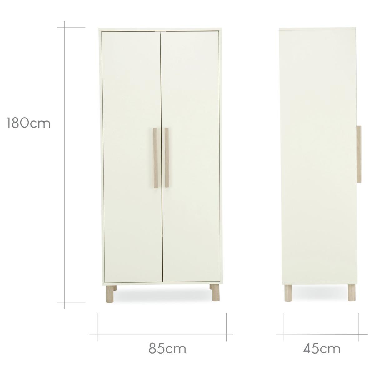 The Harper Wardrobe is a must-have for any modern nursery. Built with clean lines and featuring a neutral colour palette, this piece adds style and practicality to your contemporary nursery set. Inside, this wardrobe has plenty of storage space with two hanging rails perfect for neatly storing your baby's clothes, and a spacious shelf at the bottom for shoes. This double nursery wardrobe provides plenty of storage for your little one's outfits. Features 2 adjustable hanging rails, allowing you to transition to full-size hanging as your little one grows. Part of the Harper collection. 2 doors. 2 hanging rails. 1 fixed shelf and 1 adjustable shelf. Package Dimensions: Package 1 dimensions: H8.5, W58.5, D116.6cm. Package 1 weight: 14.2kg. Package 2 dimensions: H8.6, W58.8, D176.2cm. Package 2 weight: 23.92kg. General information: Size H180, W45, D85cm. Weight 38.12kg. Self-assembly. If this product is over 60cm height it must be securely attached to the wall to prevent overturning (includes wall fixing). Home assembly: 2 people recommended. Manufacturer's 1 year guarantee.