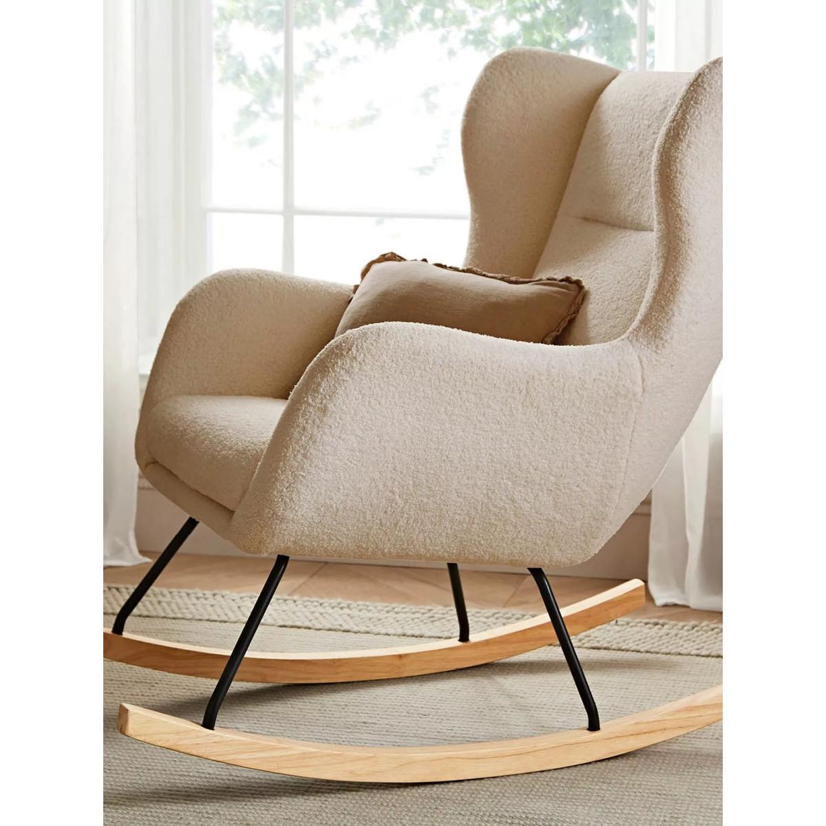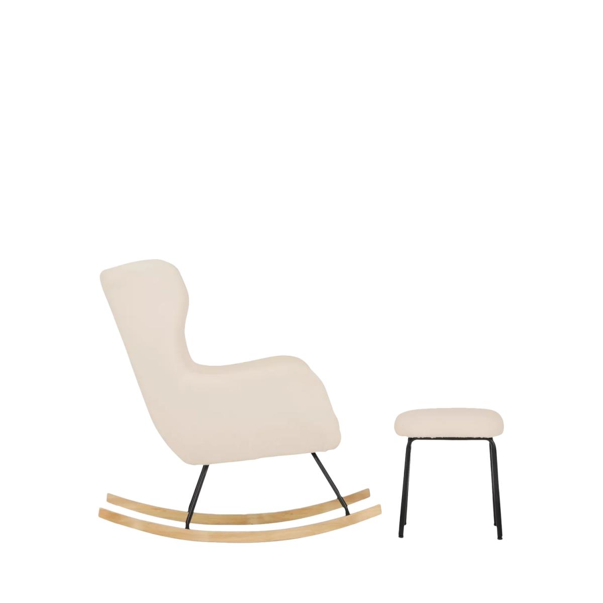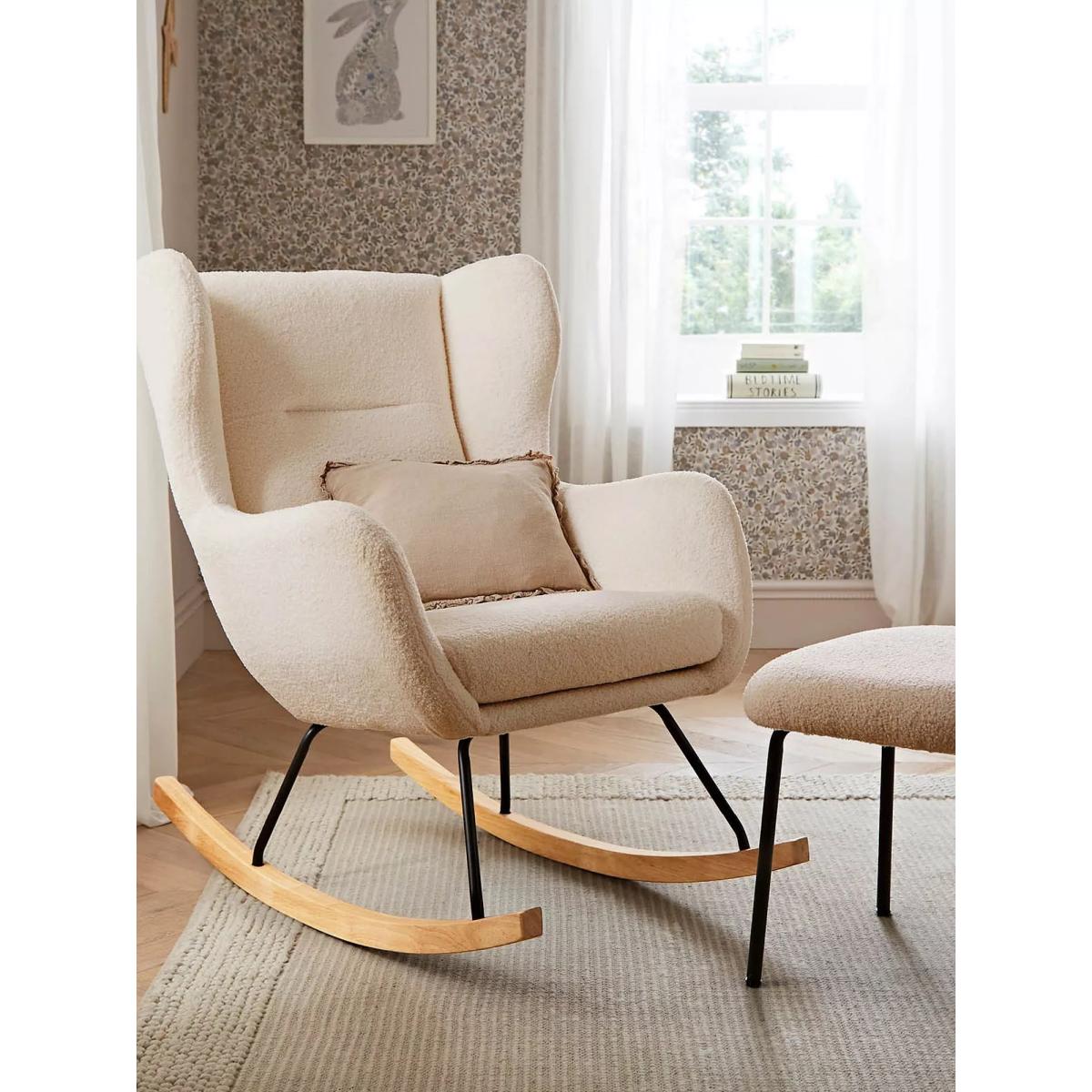 Gently nurse or rock your little one to sleep or read a bedtime story in the stylish and supportive Marley Nursing Chair and Stool. Featuring a neutral shade, this textured boucle chair adds effortless style to your contemporary nursery design from the black lines and light wood rockers. Other than style, this nursery rocking chair features optimum support. The included matching footstool is the perfect place to rest your feet as your little one naps, while the back of the chair completely supports your posture thanks to the ergonomic design.