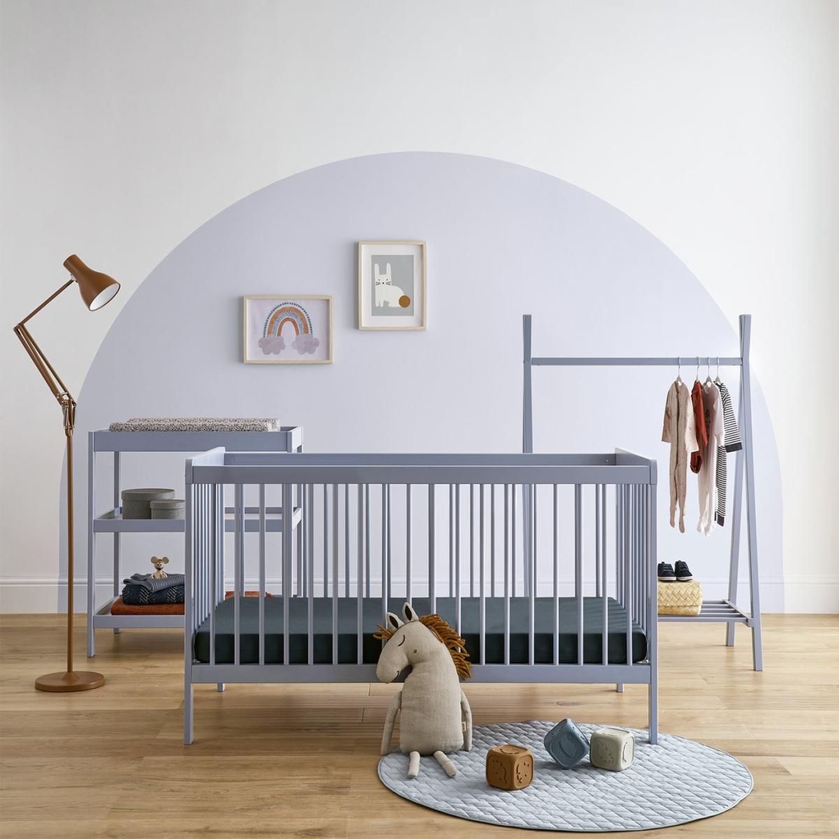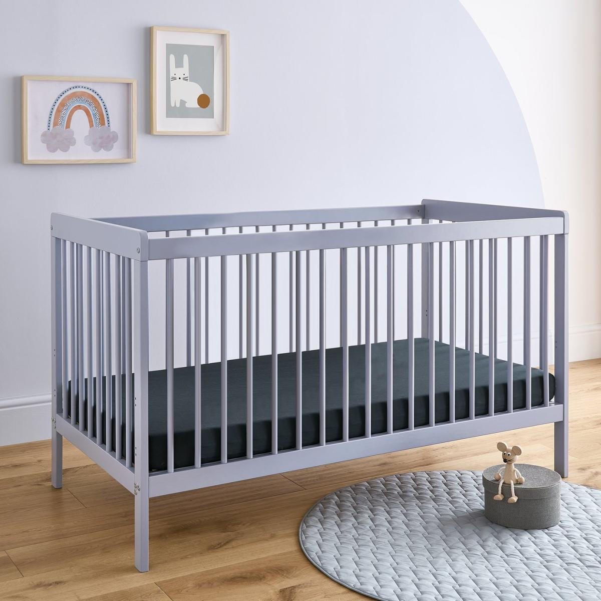 The Nola Flint Blue Cot Bed will transform even the smallest of nurseries with its bold splash of colour and contemporary design. Nola's minimal design is completed perfectly with a crisp painted finish. The Nola Cot Bed has been developed to last the test of time, accompanying your child from birth to approximately 5 years old. It has 3 mattress base positions for each stage of your baby's development and growth. When your little one is ready, you can easily convert the cot bed into a day bed. Part of the Nola collection. Suitable from birth to 5 years. Made from solid wood. Self-assembly. Cot Features Size L144, W74.9, H87cm. Weight 16kg. 3 position adjustable mattress base - allows you to lower the height of the mattress as your baby learns to sit and stand. Mattress base adjustable height 41cm, 54cm, 61cm. Height under cot 18.6cm. Toddler bed suitable for ages 18 months to 5 years. Mattress Features Mattress size L140, W70,. Mattress not included.