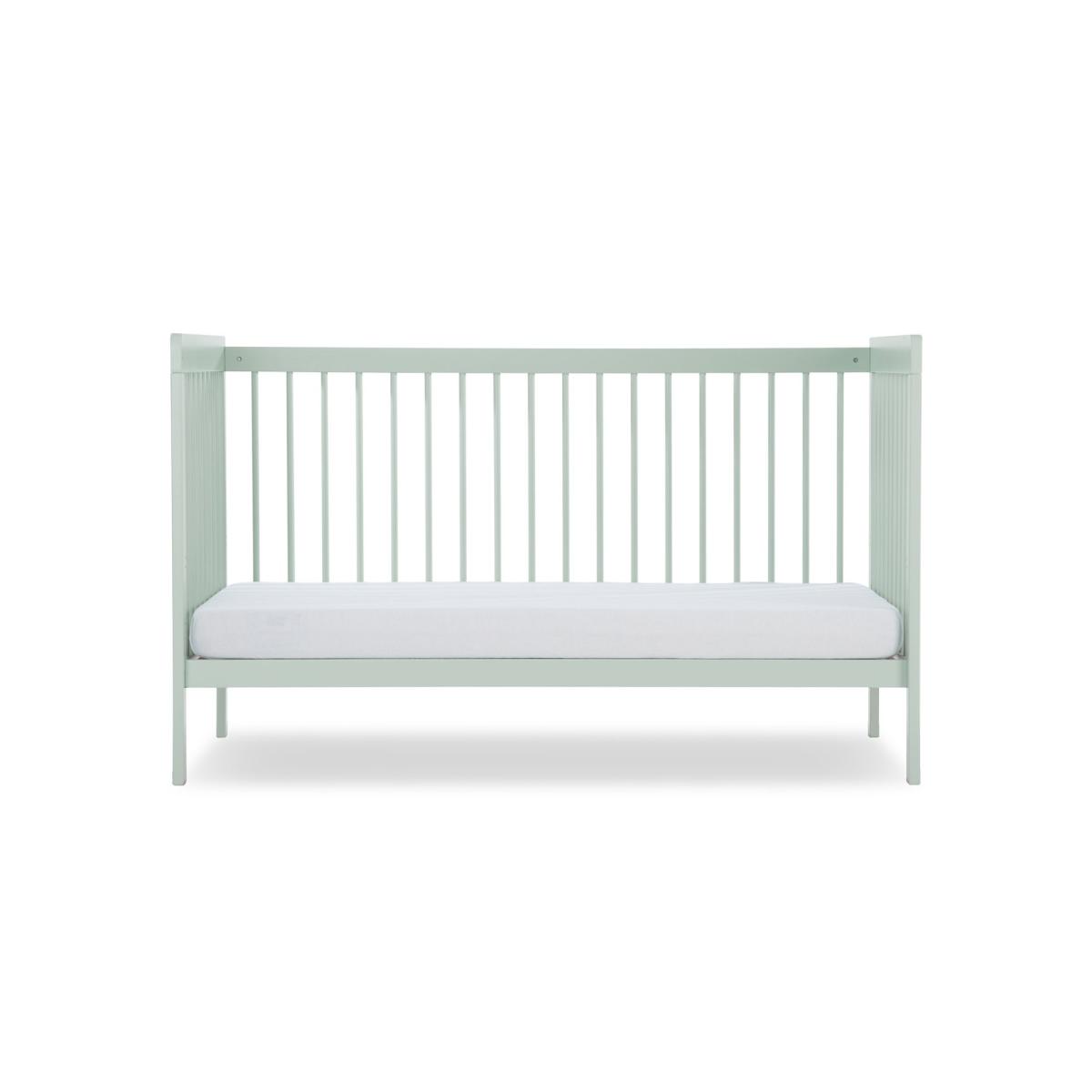 The Nola Cot Bed in sage green uses colour to add a contemporary twist to the nursery. The use of sage green will bring a sense of calm to your baby's bedroom, helping to create a relaxing sleep environment. Nola's minimal design would be the perfect match for a modern nursery. The Cot Bed will be there for your baby from birth until the age of 5. This convertible cot bed has 3 mattress base positions for you to switch between. Eventually, they'll outgrow the cot bed, but not to worry, as Nola easily converts into a day bed when you're ready. Part of the Nola collection. Suitable from birth to 5 years. Made from solid wood. Self-assembly. Cot Features Size L144, W74.9, H87cm. Weight 16kg. 3 position adjustable mattress base - allows you to lower the height of the mattress as your baby learns to sit and stand. Mattress base adjustable height 41cm, 54cm, 61cm. Height under cot 18.6cm. Toddler bed suitable for ages 18 months to 5 years. Mattress Features Mattress size L140, W70,. Mattress not included.