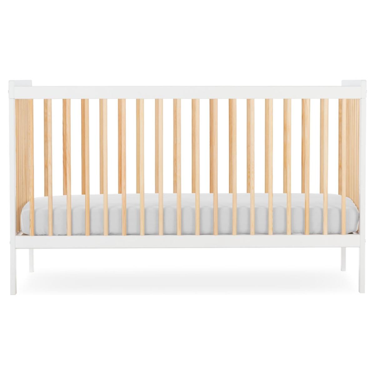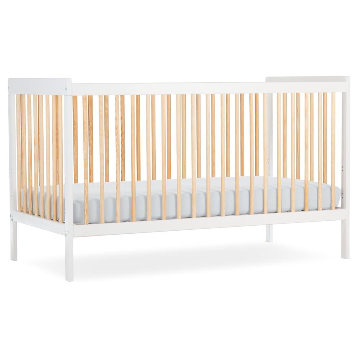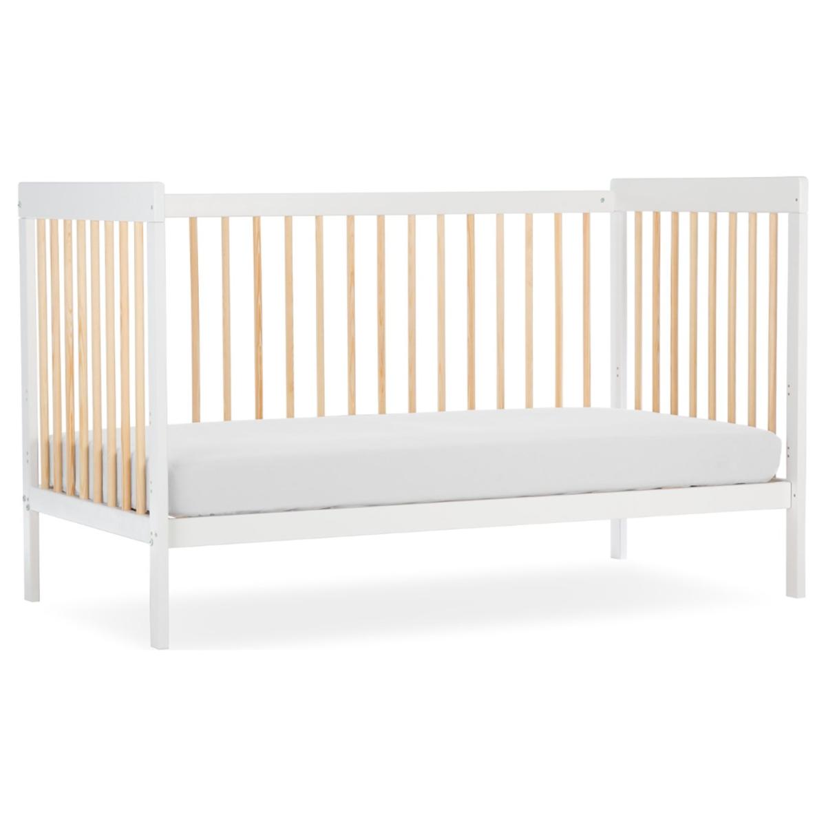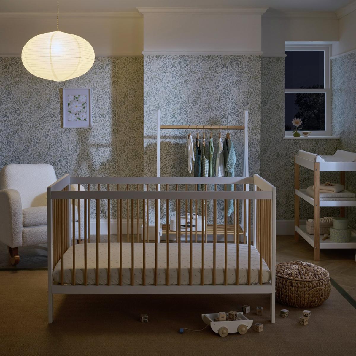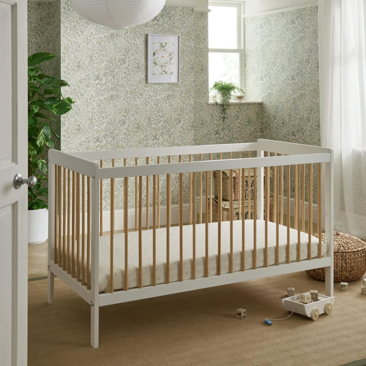 The Nola White and Natural Cot Bed is a stylish staple for any nursery. Crafted from quality pine wood, this cot bed boasts a contrasting two-tone design with pine detailing. Featuring a neutral colour palette, Nola's stylish yet understated design will blend in seamlessly with any nursery interior. With 3 mattress base positions, the cot bed is suitable from birth to 5 years old. As your little one transitions from baby to toddler, you'll appreciate the convenience of Nola's design, converting to a day bed that will last for years to come. Part of the Nola collection. Suitable from birth. Made from wood. Cot Features Size L144.5, W75, H87cm. Weight 15kg. 3 position adjustable mattress base - allows you to lower the height of the mattress as your baby learns to sit and stand. Mattress base adjustable height 41cm, 54cm, 61cm. Height under cot 18.6cm. Mattress Features Mattress not included - use. General information Packed flat. Manufacturer's 2 year guarantee.