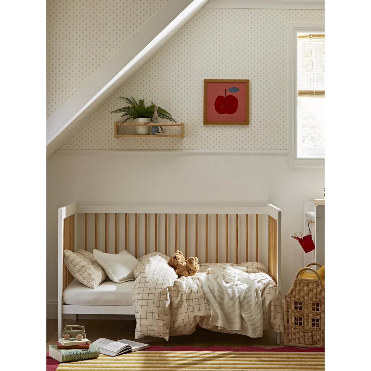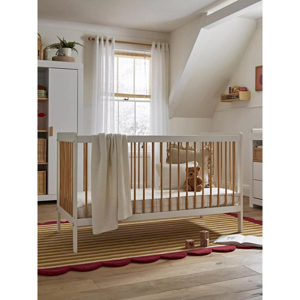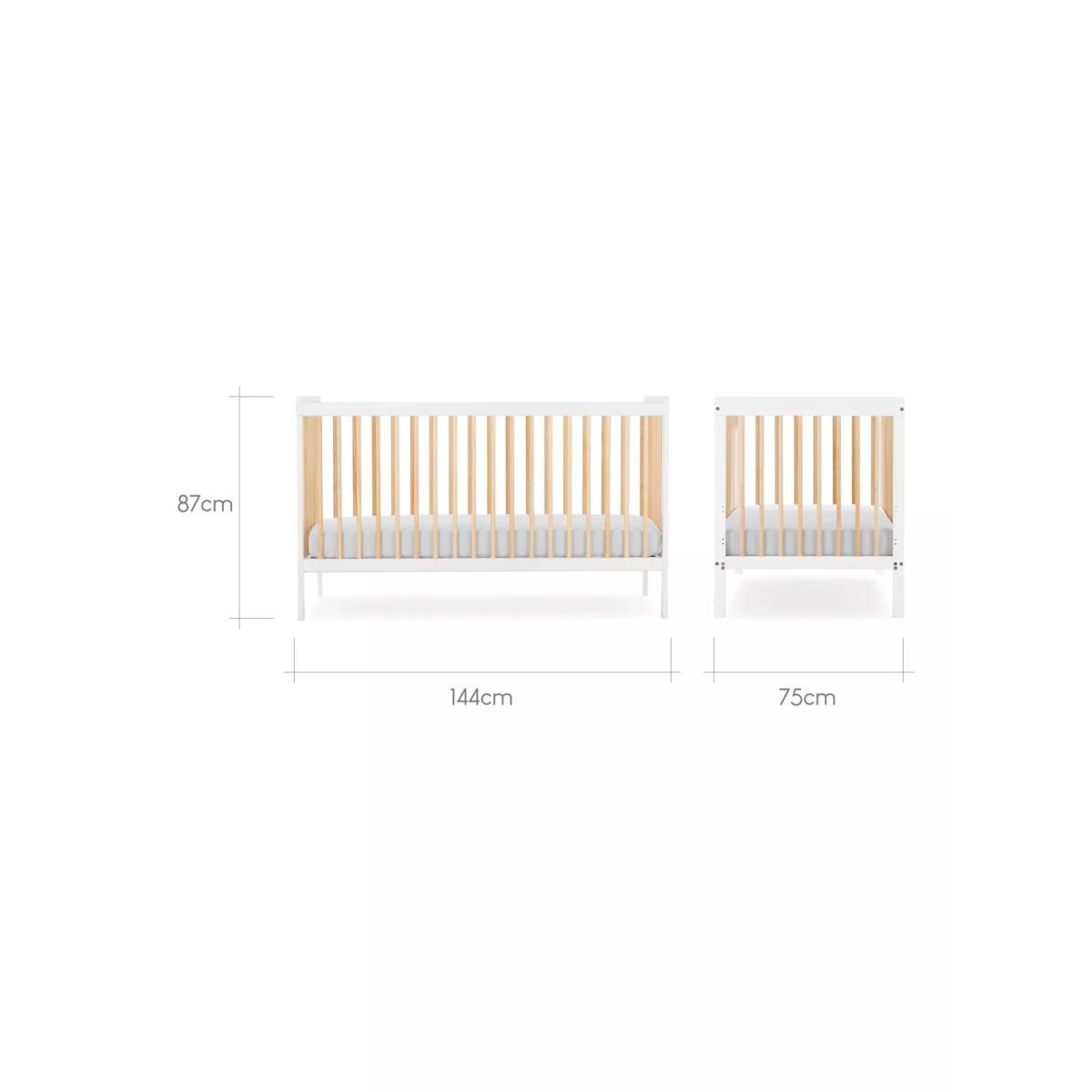 The Nola Cotbed is a stylish staple for any nursery. Crafted from quality pine wood, this white cot bed boasts a contrasting two-tone design with intricate pine detailing. Featuring a neutral colour palette, Nola's stylish yet understated design is guaranteed to blend in seamlessly with any nursery interior or theme. With three adjustable mattress base positions, this versatile cotbed is suitable for infants from birth to five years old, ensuring their utmost safety and comfort as they grow and develop. As your little one transitions from baby to toddler, you'll appreciate the convenience of Nola's convertible design, effortlessly converting to a modern day bed that will last for years to come. Key features: Suitable for 0-5 years 3 different mattress base positions Converts from cot bed to a day bed When converted into a day bed it's recommended for use by one child aged 18 months to 5 years Requires a 140 x 70cm cot bed mattress sold separately Fully certified and accredited testing to BS EN 716:2017, BS 8509:2008+A1:2011