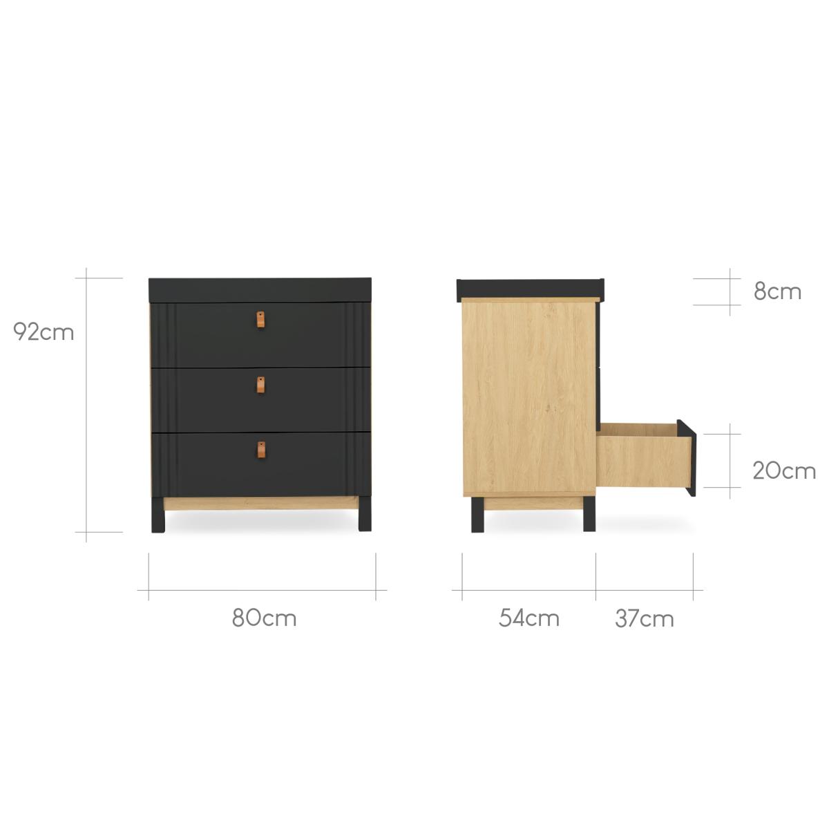 * Baby changing top* Removable changing station* 3 spacious drawers* Designed to last* Recommended changing mat size is 75cm x 46cm* Changing top suitable up to 11kg (approx 12 months)* Full assembly required When you add the Rafi changing unit into your nursery, you have somewhere ready for all those essential nappy changes! With its clever 2-in-1 design, this versatile piece of furniture provides both storage and a dedicated space for changing your baby. Featuring three spacious drawers, the Rafi Changing Unit Changer offers plenty of storage space for all your little one's essentials, from clothes and nappies to toys and books. With soft close drawer runners, you can move around the room without disturbing your sleeping baby, making those late-night nappy changes a breeze. And when your baby has outgrown the changing unit, simply remove the changing top to convert the changing unit changer into a standalone changing unit. Discover the timeless elegance of the Cuddle Co Rafi White and Rafi Black collections. These beautiful furniture pieces offer a modern twist on classic design, featuring warm oak detailing and a sleek black painted finish that will complement any nursery decor.