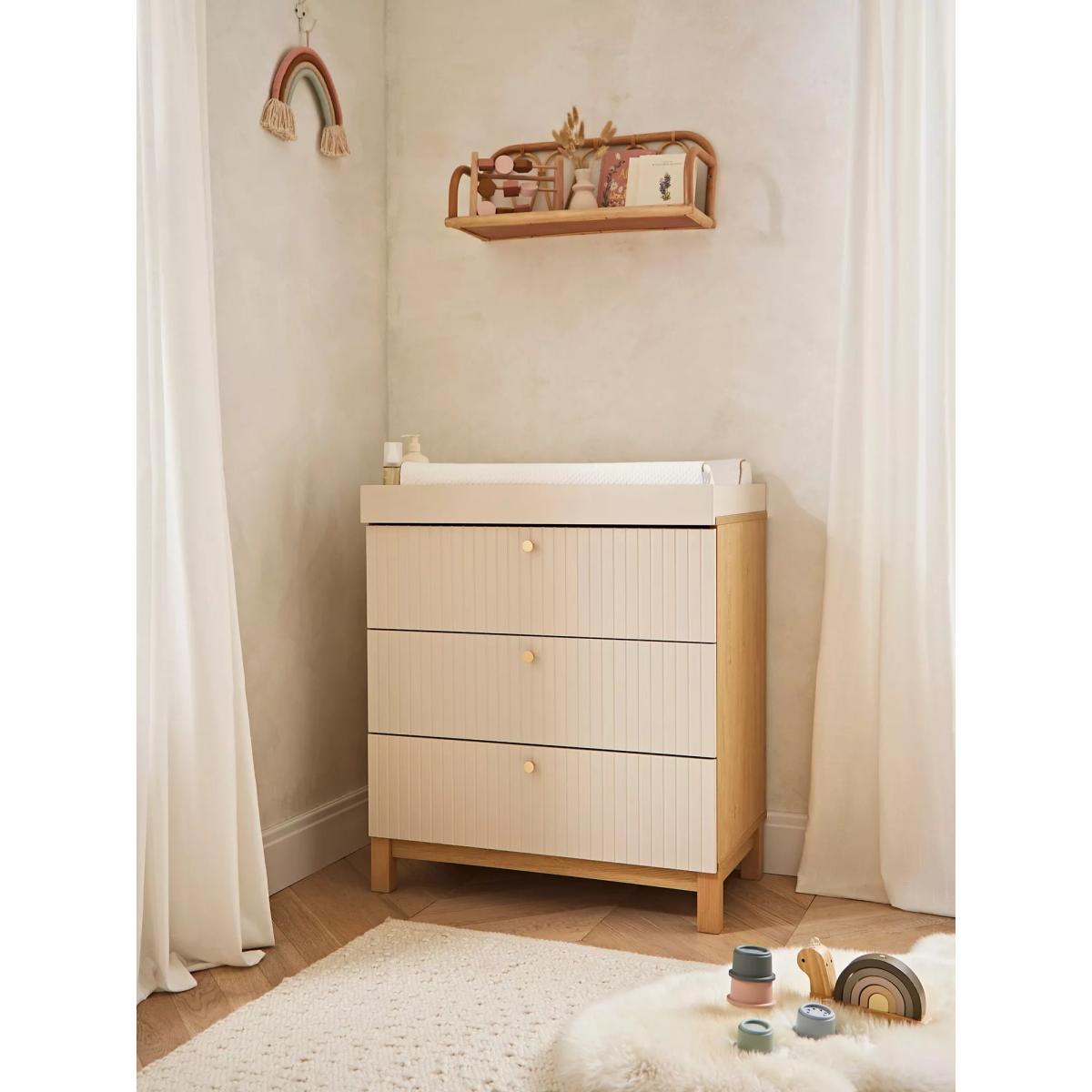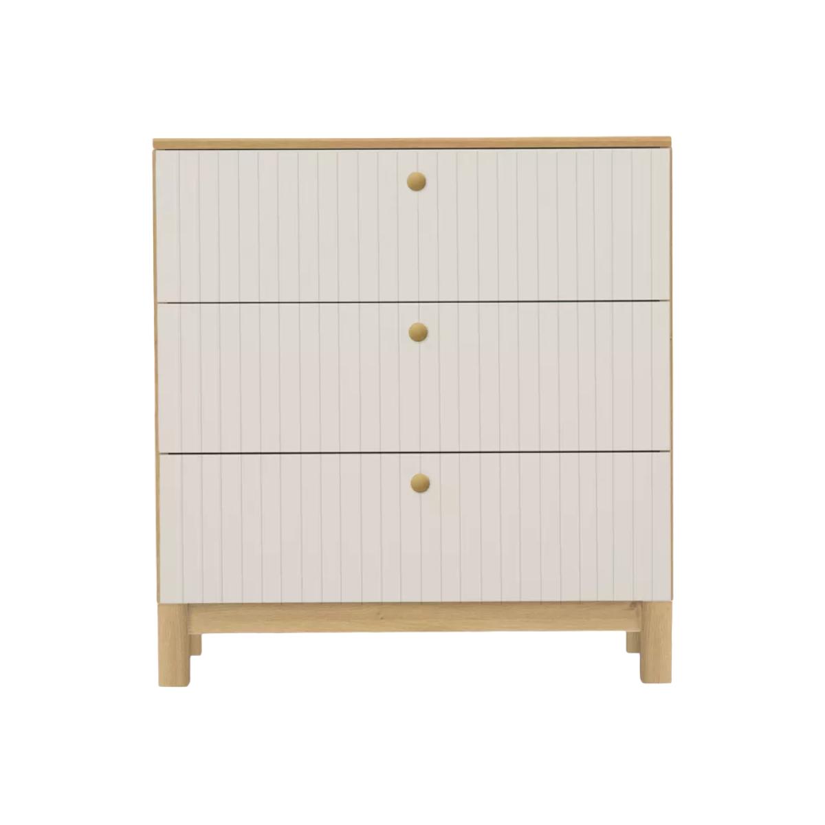 The Remi Dresser is a practical and stylish nursery essential, designed to grow with your baby. Part of the stylish Remi range, its minimalist aesthetic and modern yet timeless appeal make it a beautiful, versatile choice for contemporary nursery spaces. This nursery dresser with changing top features three spacious soft-close drawers, perfect for storing nappies, wipes, and other baby essentials. The removable changing top transforms the unit into a timeless set of drawers, making it a long-lasting piece of nursery furniture that can be used well beyond the nappy-changing years. Key features: Changing top is suitable up to 11kg (approximately 12 months) Recommended changing mat size is 75 x 46cm Retaining barriers for safety Removable changing station Brass effect handles 3x soft-closing drawers Fully certified and accredited testing to BS EN 12221:2008+A1:2013, FIRA FRQG C001 & C004 All the paint used is baby-safe and Nitro based which is tested to EN 71-3: Migration of certain elements. It is not water-based