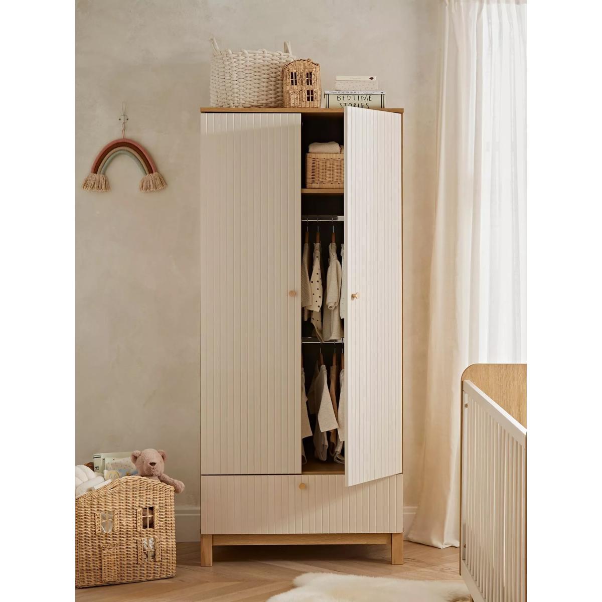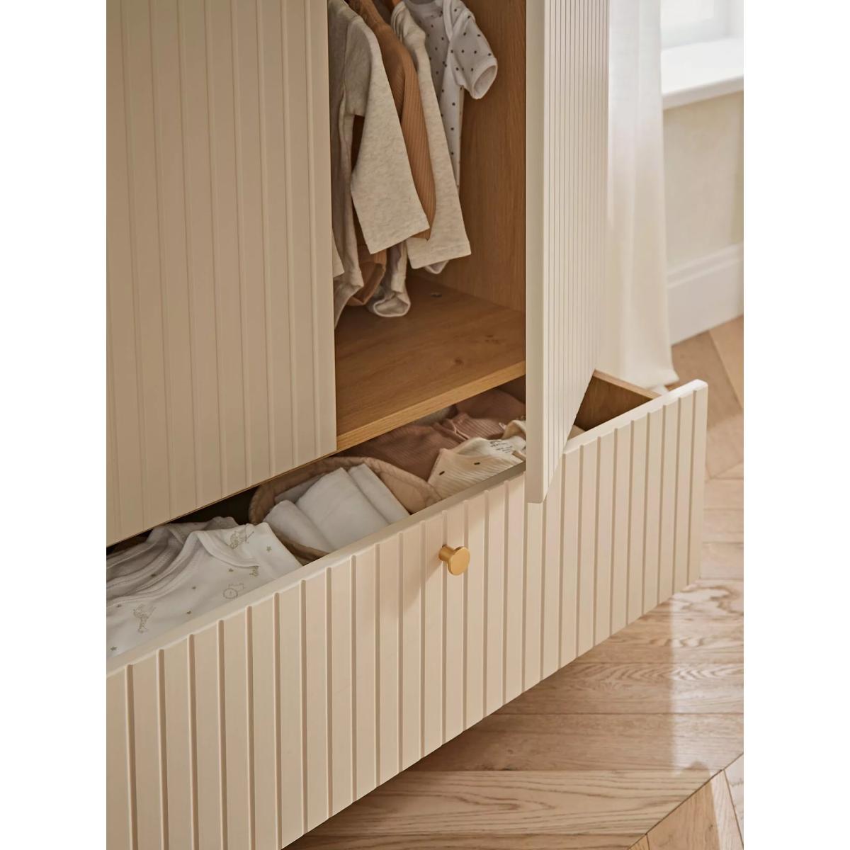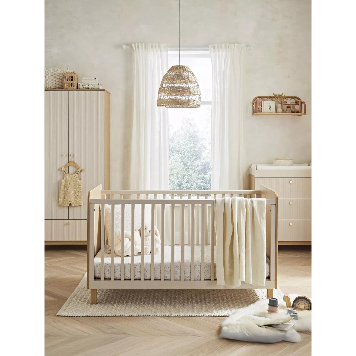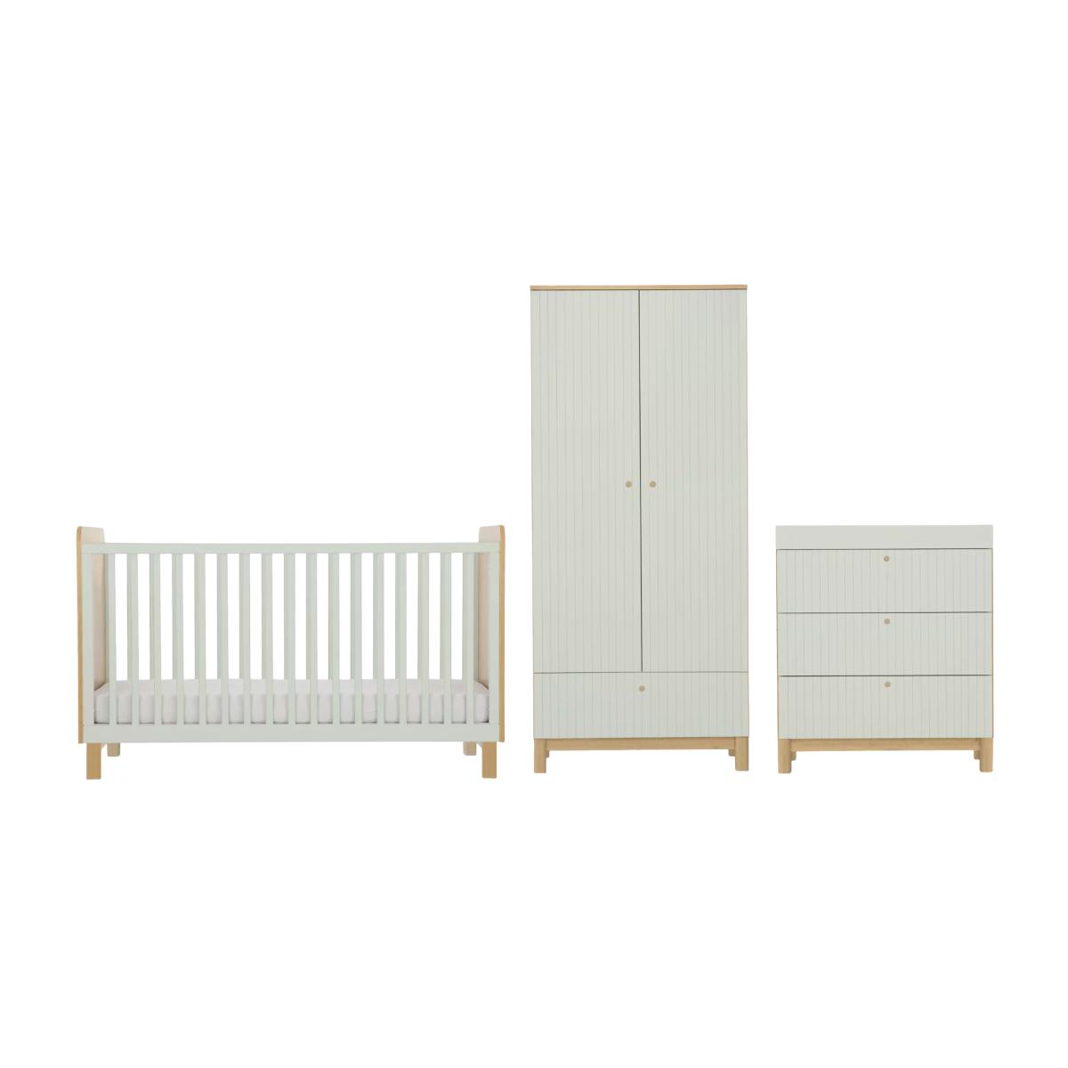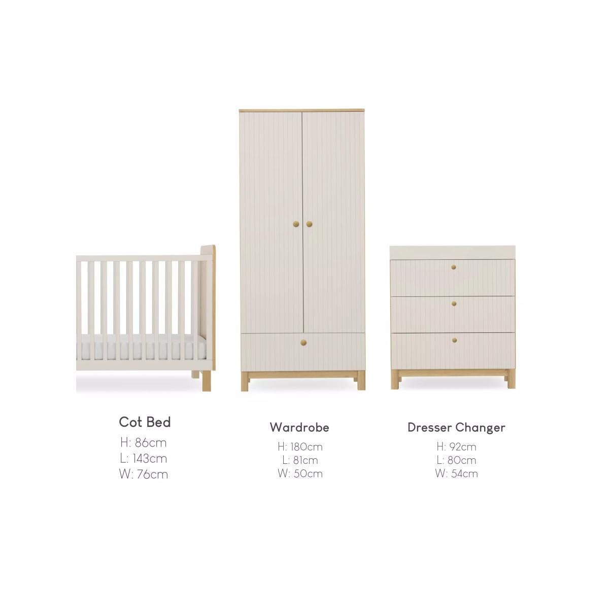 The Remi 3-piece nursery furniture set perfectly matches modern neutral, nursery decor. Remi’s minimalist, on-trend design is created with a soothing two-tone colourway, combining its lined, painted finish with warm, natural oak tones. Brushed brass effect handles and delicate linear detailing flows throughout this modern nursery furniture range. The Remi 3-piece nursery furniture set includes a cotbed, dresser changer and wardrobe. Cotbed The Remi Cot Bed has 3 mattress base positions, meaning you can easily adjust the height of the mattress to suit your growing baby. Once your little one has outgrown the cot bed, you can effortlessly convert Remi to a day bed. Dresser The Remi Dresser Changer is a practical and stylish nursery essential, designed to grow with your baby. This nursery dresser with changing top features three spacious soft-close drawers, perfect for storing nappies, wipes and other baby essentials. The removable changing top transforms the unit into a timeless set of drawers, making it a long-lasting piece of nursery furniture that can be used well beyond the nappy-changing years. Double wardrobe The Remi Nursery Wardrobe is a spacious and functional storage solution for your baby’s bedroom. This double wardrobe features two removable hanging rails and an internal shelf, giving you flexible space to organise clothes, blankets and other nursery essentials. A spacious bottom drawer offers extra storage. With soft-close doors and drawers, the Remi Wardrobe is designed to keep noise to a minimum — perfect for maintaining a peaceful nursery environment. Key features: Cotbed is suitable for 0-5 years 3 different mattress base positions Converts from cotbed to day bed. When converted it's recommended for use by one child aged 18 months to 5 years Requires a 140 x 70cm cot bed mattress sold separately Removable changing station on the dresser is suitable up to 11kg (approximately 12 months) Recommended changing mat size is 75 x 46cm Wardrobe and dresser have brass-effect handles Dresser features 3 soft-closing drawers Wardrobe has soft closing mechanisms Wardrobe features 2 removable hanging rails, 1 inner shelf and 1 drawer All the paint used is baby-safe and Nitro based which is tested to EN 71-3: Migration of certain elements. It is not water-based Cotbed is fully certified and accredited testing to BS EN 716:2017, BS 8509:2008+A1:2011 Dresser is fully certified and accredited testing to BS EN 12221: 2008+A1:2013, FIRA FRQG C001 & C004 Wardrobe is fully certified and accredited testing to FIRA FRQG C001 & C004