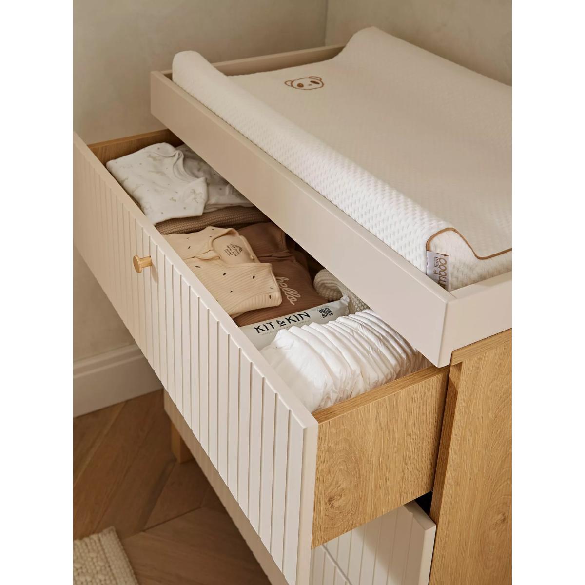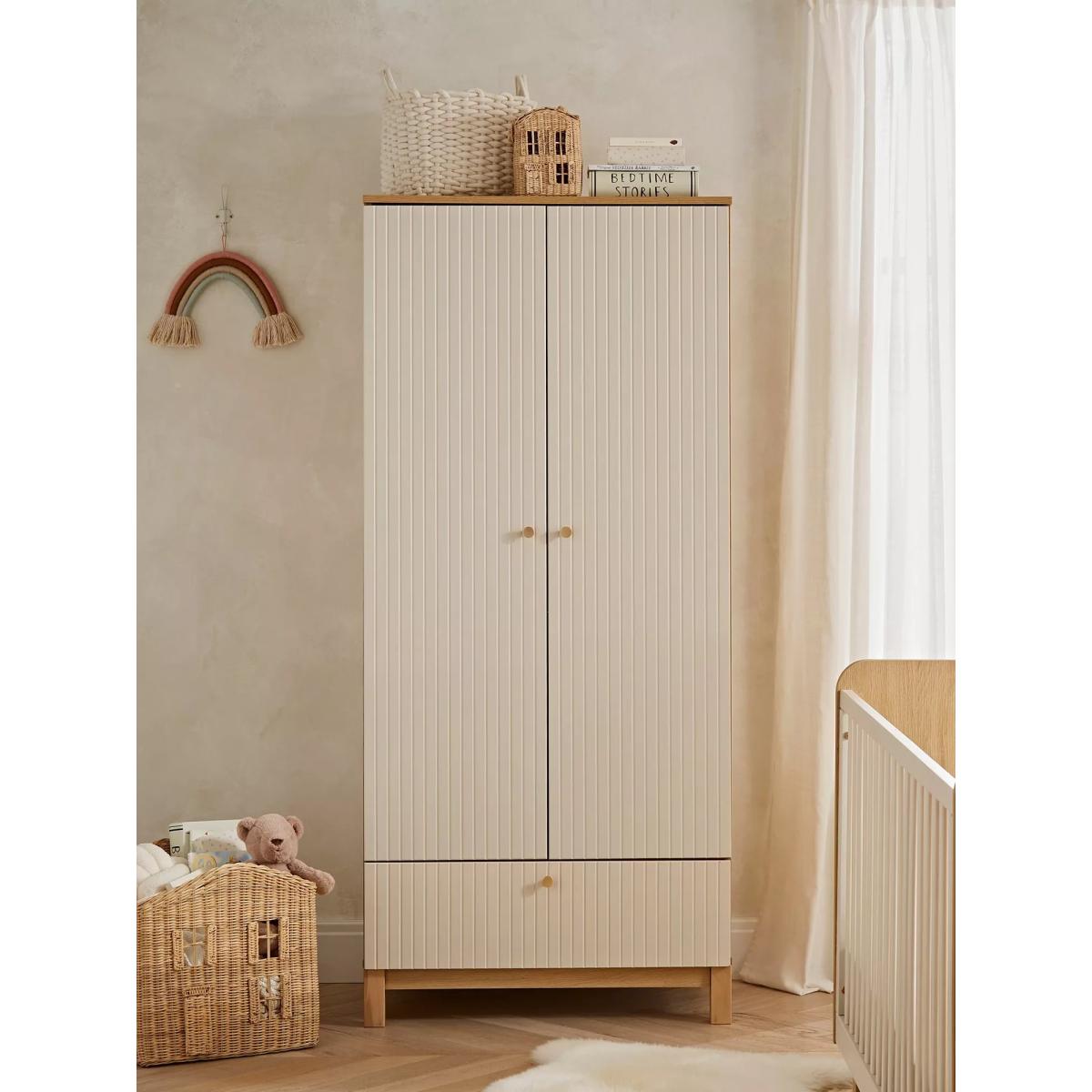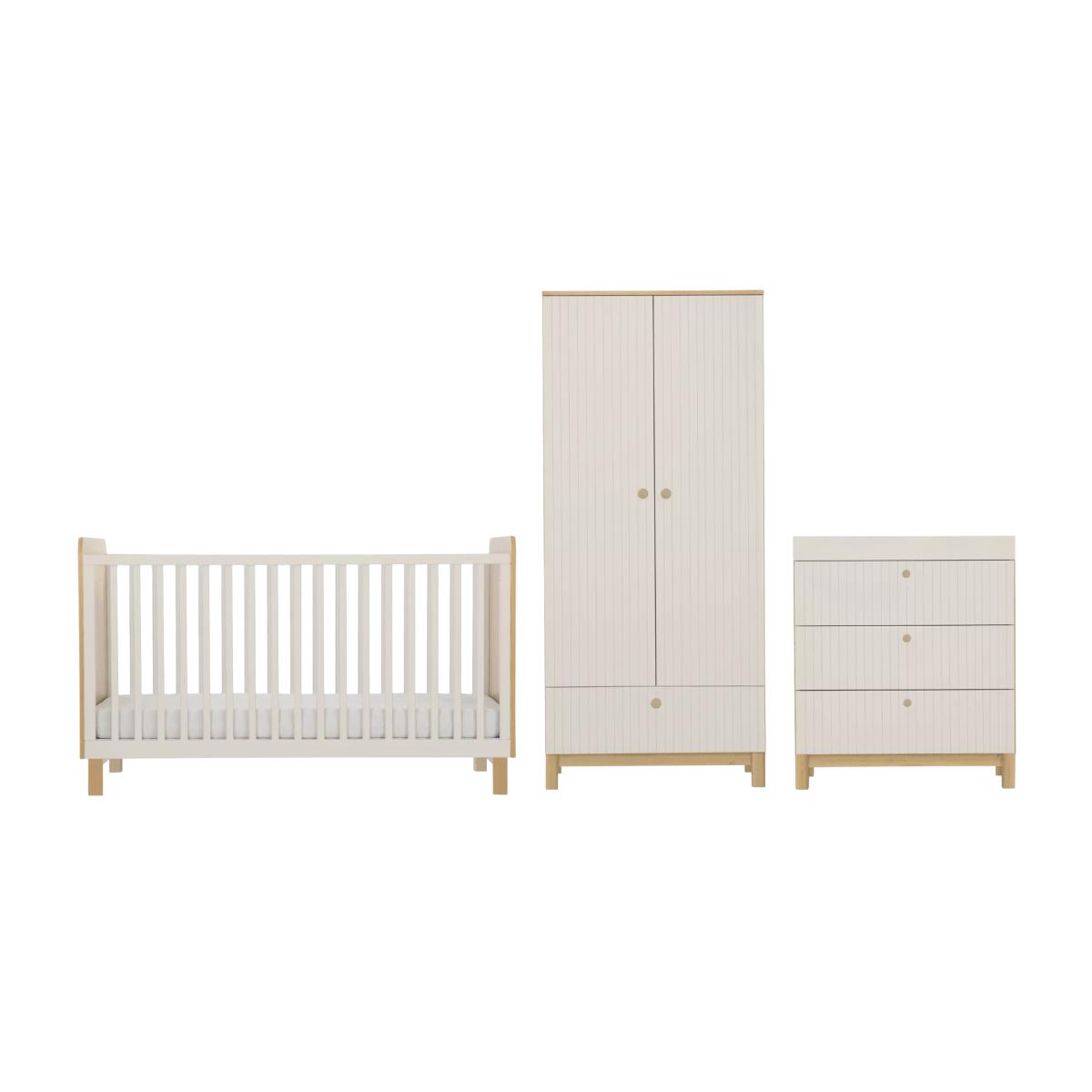 The Remi 3-piece nursery furniture set perfectly matches modern neutral, nursery decor. Remi’s minimalist, on-trend design is created with a soothing two-tone colourway, combining its lined, painted finish with warm, natural oak tones. Brushed brass effect handles and delicate linear detailing flows throughout this modern nursery furniture range. The Remi 3-piece nursery furniture set includes a cotbed, dresser changer and wardrobe. Cotbed The Remi Cot Bed has 3 mattress base positions, meaning you can easily adjust the height of the mattress to suit your growing baby. Once your little one has outgrown the cot bed, you can effortlessly convert Remi to a day bed. Dresser The Remi Dresser Changer is a practical and stylish nursery essential, designed to grow with your baby. This nursery dresser with changing top features three spacious soft-close drawers, perfect for storing nappies, wipes and other baby essentials. The removable changing top transforms the unit into a timeless set of drawers, making it a long-lasting piece of nursery furniture that can be used well beyond the nappy-changing years. Double wardrobe The Remi Nursery Wardrobe is a spacious and functional storage solution for your baby’s bedroom. This double wardrobe features two removable hanging rails and an internal shelf, giving you flexible space to organise clothes, blankets and other nursery essentials. A spacious bottom drawer offers extra storage. With soft-close doors and drawers, the Remi Wardrobe is designed to keep noise to a minimum — perfect for maintaining a peaceful nursery environment. Key features: Cotbed is suitable for 0-5 years 3 different mattress base positions Converts from cotbed to day bed. When converted it's recommended for use by one child aged 18 months to 5 years Requires a 140 x 70cm cot bed mattress sold separately Removable changing station on the dresser is suitable up to 11kg (approximately 12 months) Recommended changing mat size is 75 x 46cm Wardrobe and dresser have brass-effect handles Dresser features 3 soft-closing drawers Wardrobe has soft closing mechanisms Wardrobe features 2 removable hanging rails, 1 inner shelf and 1 drawer All the paint used is baby-safe and Nitro based which is tested to EN 71-3: Migration of certain elements. It is not water-based Cotbed is fully certified and accredited testing to BS EN 716:2017, BS 8509:2008+A1:2011 Dresser is fully certified and accredited testing to BS EN 12221: 2008+A1:2013, FIRA FRQG C001 & C004 Wardrobe is fully certified and accredited testing to FIRA FRQG C001 & C004