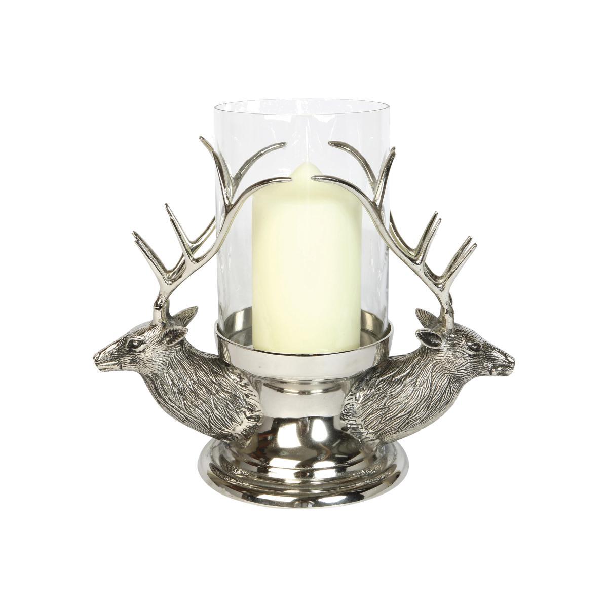 Beautiful and well-crafted hurricane lantern. Features two stag heads in precise detail. Nickel-plated aluminium finish is stylish and striking. Two magnificent stag heads rest on a polished stainless steel base and support, thanks to their impressively branched antlers, a glass hurricane lantern. Designed to accommodate a pillar candle, this lantern is guaranteed to give a lovely warm light. The stag heads are crafted from nickel-plated aluminium and feature a wealth of finely wrought detail, adding naturalistic appeal to what is already a lovely home accessory for any style of room, contemporary or classic. Please note. Candle not included. Dimensions. Width: 40 cm (16 inches). Depth: 19 cm (7 inches). Height: 34 cm (13 inches).