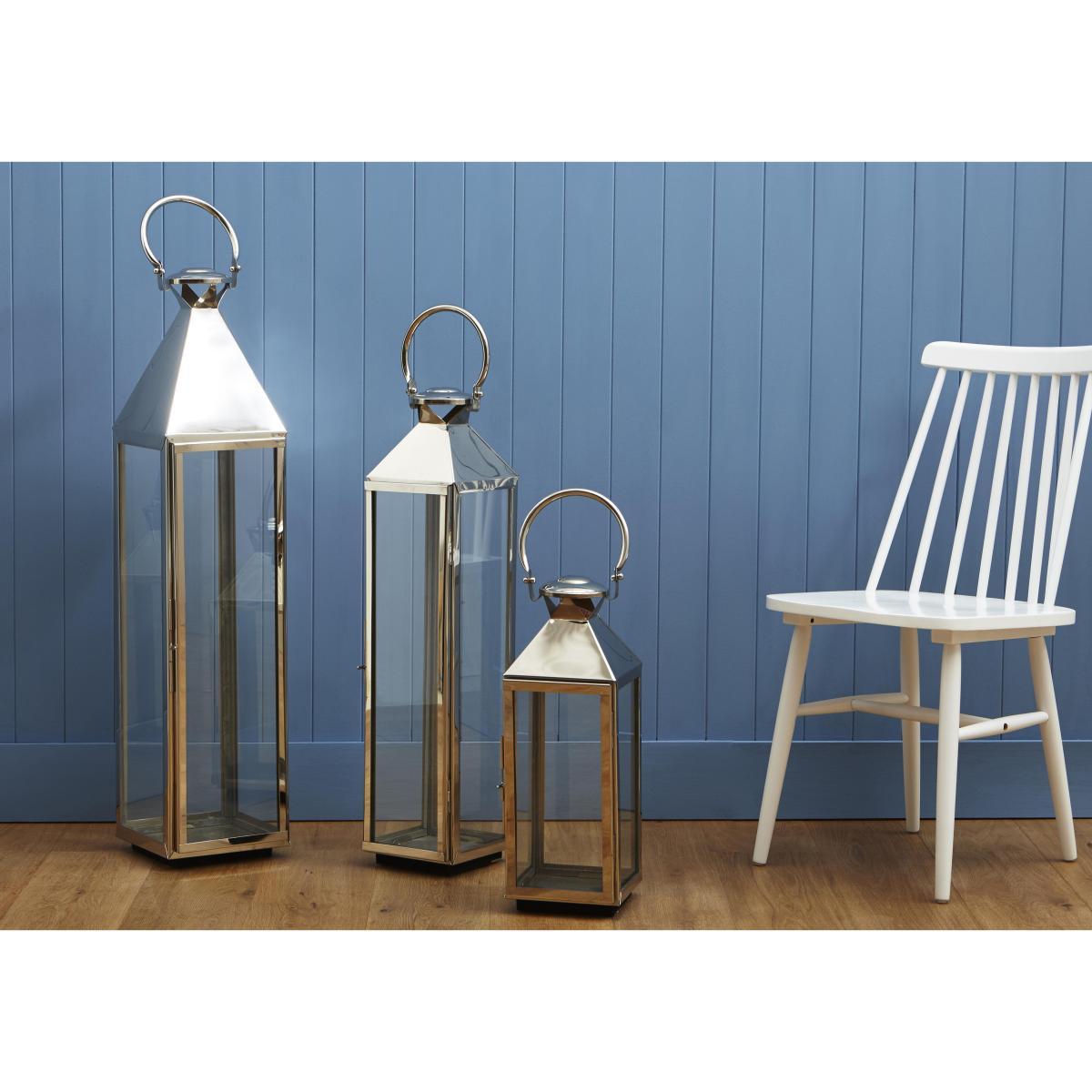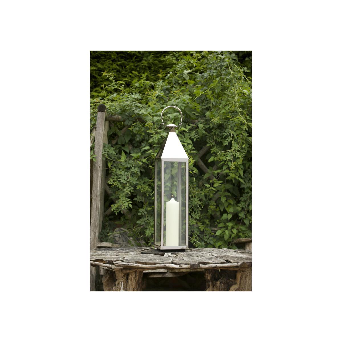 The perfect accessory for your outside space or even stylish living room, our impressive Large Chelsea Lantern is a striking update on the traditional Venetian lantern. Sturdily constructed from nickel-plated stainless steel and glass, this tall and elegant lantern is finished with a lovely curved handle. Venetian-style glass lantern. Shiny sloping top and curved carrying handle. Made of glass and stainless steel plated with nickel. Very tall and imposing, it’s equally suited to table or floor. A stylish accessory for living room, conservatory or garden. Dimensions. Width: 22cm (7 inches). Height:105cm (41 inches).