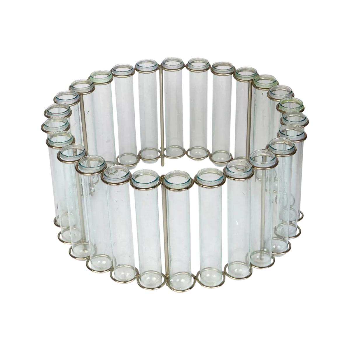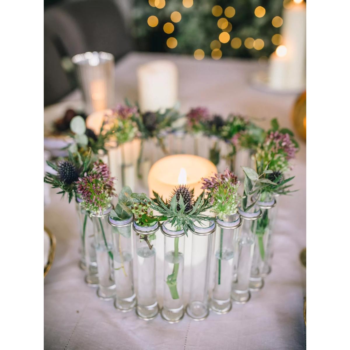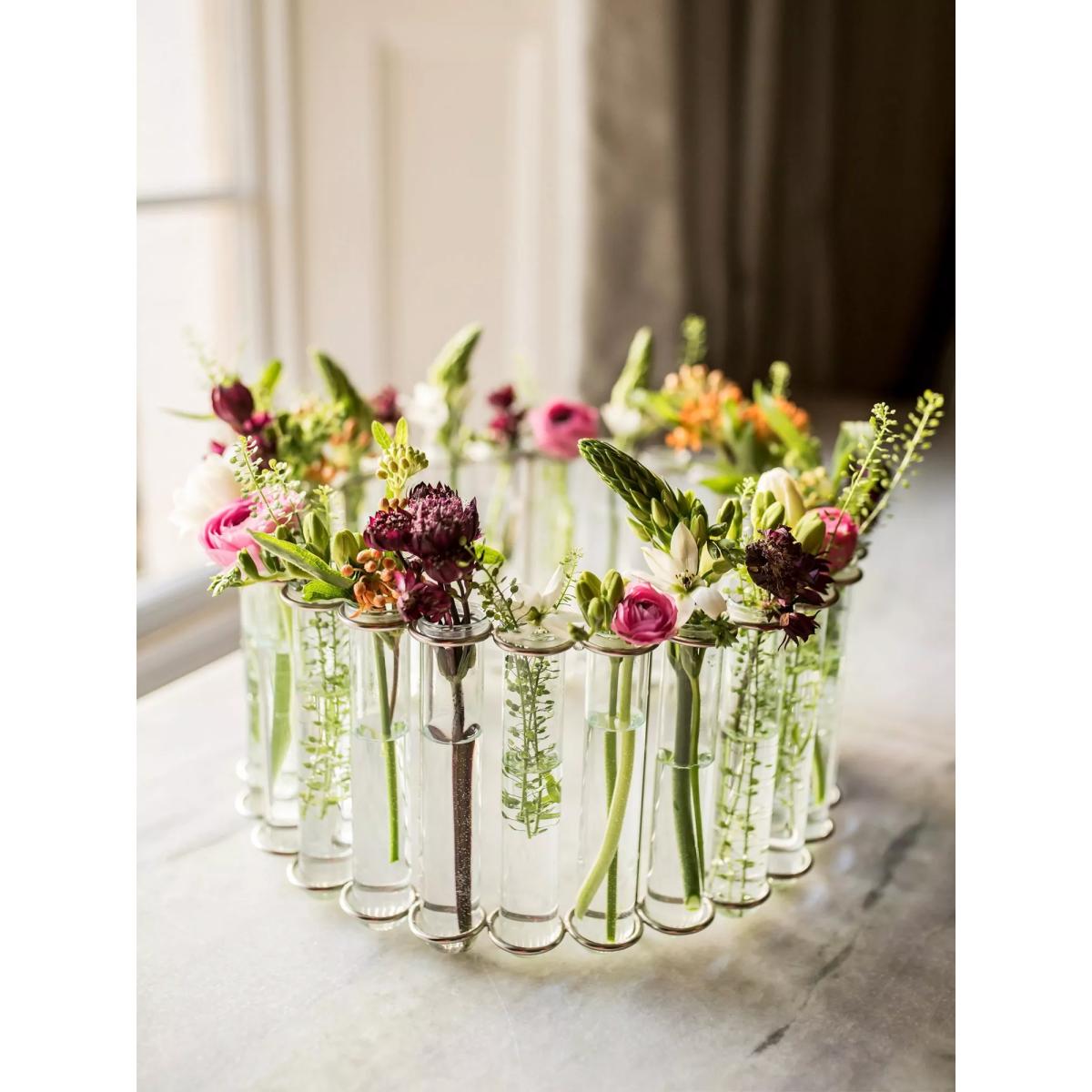 Contemporary and unique, with a chain of interlinking test tubes, the test tube vases are a highly decorative object with or without flowers. Add a feminine touch to this scientific-inspired centrepiece with a selection of single blooms.
