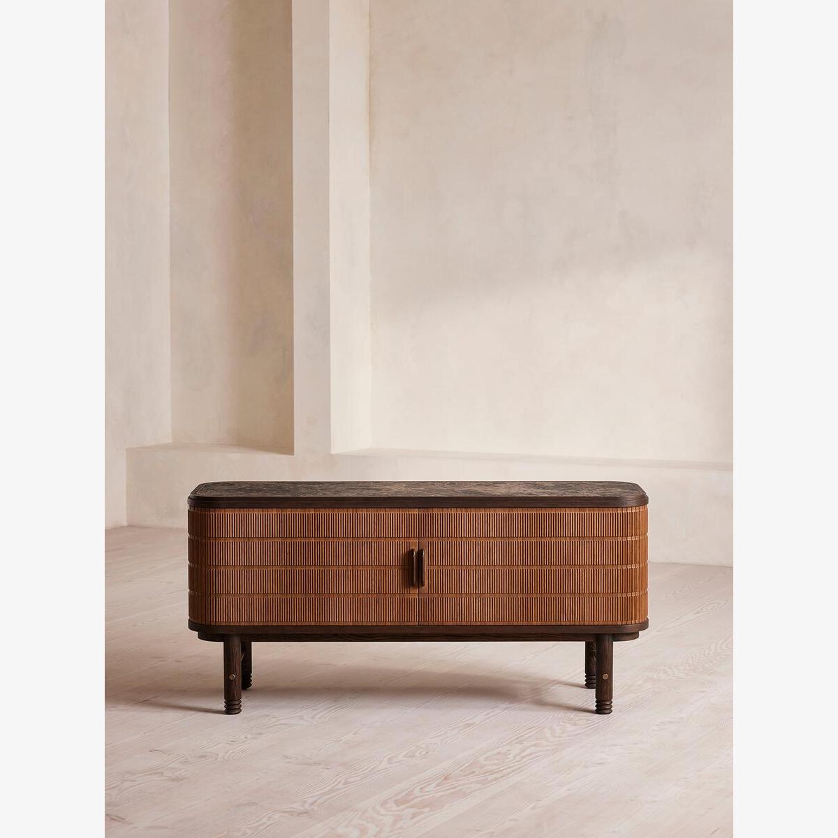 This pill-shaped sideboard has been crafted from a combination of mid-tone and dark oak tones with deep Spanish Emperador marble. Inspired by the natural finishes seen in Soho Roc House, the Cullen sideboard showcases a dark Emperador marble top sourced from Spain, displaying a mix of brown hues with lighter veining. Mid-tone stained oak across tambour doors is contrasted with dark stained oak on the top, base and legs, alongside solid oak handles. A real antique brass inlay and turned legs add a mix of contemporary textures.